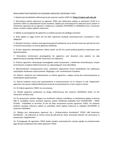 REGULAMIN PRZYSTĄPIENIA DO EGZAMINU BIEGŁOŚCI JĘZYKOWEJ TOEIC 1. Rejestracja kandydatów dokonywana jest poprzez system USOS UL (https://zapisy.uph.edu.pl). 2. Warunkiem pełnej rejestracji na egzamin TOEIC jest dokonanie wpłaty w wysokości 15,00 zł w systemie USOS na indywidualne konto studenta. Opłata jest automatycznie naliczana przez system w momencie zapisania się na egzamin i widoczna w zakładce PŁATNOŚCI w USOSWeb wraz z numerem konta, na które należy wpłacić należności. 3. Opłata za przystąpienie do egzaminu w żadnej sytuacji nie podlega zwrotowi. 4. Brak wpłaty w ciągu trzech dni od daty rejestracji skutkuje automatycznym usunięciem z listy zdających. 5. Aktualne terminy i miejsce sesji egzaminacyjnych podawane są na stronie www.sjo.uph.edu.pl oraz w formie komunikatu na stronie głównej USOSweb. 6. W dniu egzaminu obowiązkowo należy stawić się 30 min przed podaną godziną rozpoczęcia sesji egzaminacyjnej. 7. Warunkiem koniecznym przystąpienia do egzaminu jest okazanie przy wejściu na salę egzaminacyjną ważnego dowodu tożsamości (ze zdjęciem). 8. Podczas egzaminu obowiązuje bezwzględny zakaz korzystania z telefonów komórkowych, innych przenośnych urządzeń elektronicznych czy nagrywających oraz słowników. 9. Niesamodzielne rozwiązywanie testu, udzielanie odpowiedzi innym kandydatom lub zakłócanie sesji będzie skutkować wyproszeniem zdającego z sali i anulowaniem wyników. 10. Palenie i jedzenie jest niedozwolone w trakcie egzaminu, napoje muszą być przechowywane w zamkniętych opakowaniach. 11. Rzeczy osobiste muszą być pozostawione w przeznaczonym na to miejscu w sali. Organizator egzaminu nie ponosi odpowiedzialności prawnej za pozostawione w tym miejscu mienie. 12. W trakcie egzaminu TOEIC nie ma przerwy. 13. Wyniki egzaminu podawane są drogą elektroniczną (do systemu USOSWeb) około 12 dni roboczych od daty sesji. 14. Po otrzymaniu wyniku zdający ma możliwość nabycia certyfikatu za dodatkową opłatą w kwocie 200 zł. Certyfikat można zamówić poprzez system USOSweb (zakładka DLA STUDENTÓW – MOJE STUDIA – PODANIA) w terminie 14 dni od daty otrzymania wyniku egzaminu TOEIC. Po złożeniu podania zostanie naliczona opłata za certyfikat, która będzie widoczna w zakładce PŁATNOŚCI w systemie USOSWeb. 15. Zdający jest zobowiązany zapoznać się z „Podręcznikiem Kandydata” (TOEIC L&R Examinee Handbook) – do pobrania ze strony www.sjo.uph.edu.pl, który precyzuje kwestie nie poruszone w powyższym „Regulaminie.” 16. Przystępując do egzaminu TOEIC każdy student automatycznie wyraża zgodę na przetwarzanie jego danych osobowych dla celów egzaminu TOEIC.