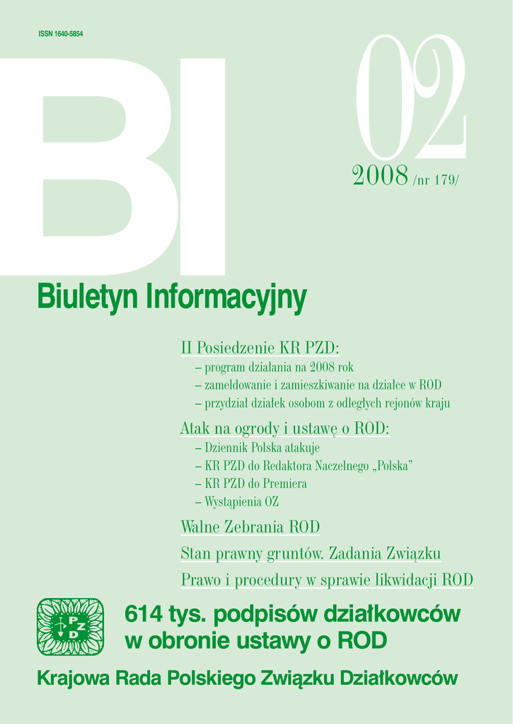 02 ISSN 1640-5854 2008 /nr 179/ Biuletyn Informacyjny II Posiedzenie KR PZD: – program działania na 2008 rok – zameldowanie i zamieszkiwanie na działce w ROD – przydział działek osobom z odległych rejonów kraju Atak na ogrody i ustawę o ROD: – Dziennik Polska atakuje – KR PZD do Redaktora Naczelnego „Polska” – KR PZD do Premiera – Wystąpienia OZ Walne Zebrania ROD Stan prawny gruntów. Zadania Związku Prawo i procedury w sprawie likwidacji ROD 614 tys. podpisów działkowców w obronie ustawy o ROD Krajowa Rada Polskiego Związku Działkowców SPIS TREŚCI I. II POSIEDZENIE KRAJOWEJ RADY PZD. . . . . . . . . 1 1. Informacja. . . . . . . . . . . . . . . . . . . . . . . . . . . . . . . . . . . . . . . . . . . . . . . . . . . . . . . . . . . . 1 2. Referat wygłoszony przez Eugeniusza Kondrackiego Prezesa PZD . . . . . . . . . . . . . . . 2 3. Opracowania do pkt. 9 i 10 porządku obrad dostarczone członkom KR PZD. . . . . . . . 6 • INFORMACJA – Użytkowanie działek w ROD przez osoby z odległych regionów kraju . . . . . . . . . . . . . . . . . . . . . . . . . . . . . . . . . . 6 • INFORMACJA dotycząca zamieszkiwania i zameldowania w ROD. . . . . . . . . . . . 10 4. Dokumenty przyjęte przez Krajową Radę PZD. . . . . . . . . . . . . . . . . . . . . . . . . . . . . . 13 • UCHWAŁA Nr 1/II/2008 KR PZD z dnia 21 lutego 2008 r. w sprawie planu pracy Krajowej Rady Polskiego Związku Działkowców w 2008 r.. . . . . . . . . 13 • UCHWAŁA Nr 2/II/2008 KR PZD z dnia 21 lutego 2008 r. w sprawie zamieszkiwania i meldowania na terenach działek w rodzinnych ogrodach działkowych . . . . . . . . . . . . . . . . . . . . . . . . . . . . . . . . . . . . 13 • UCHWAŁA Nr 3/II/2008 KR PZD z dnia 21 lutego 2008 r. w sprawie przydziału działek dla osób zamieszkałych w odległych rejonach kraju. . . . . . . . . . . . . . . . . . . . . . . . . . . . . . . . . . . . . . . . . . . . 14 • UCHWAŁA Nr 4/II/2008 KR PZD z dnia 21 lutego 2008 r. w sprawie powołania stałych komisji problemowych. . . . . . . . . . . . . . . . . . . . . . . . 15 • UCHWAŁA Nr 5/II/2008 KR PZD z dnia 21 lutego 2008 r. w sprawie zatwierdzenia uchwały Prezydium Krajowej Rady PZD. . . . . . . . . . . . . 16 • UCHWAŁA Nr 6 /II/2008 KR PZD z dnia 21 lutego 2008 r. w sprawie regulaminu Krajowej Rady Polskiego Związku Działkowców. . . . . . . . . 17 • UCHWAŁA Nr 7/II/2008 KR PZD z dnia 21 lutego 2008 r. w sprawie interpretacji statutu PZD. . . . . . . . . . . . . . . . . . . . . . . . . . . . . . . . . . . . . 17 UZASADNIENIE. . . . . . . . . . . . . . . . . . . . . . . . . . . . . . . . . . . . . . . . . . . . . . . . . . . . 17 • UCHWAŁA Nr 8/II/2008 KR PZD z dnia 21 lutego 2008 r. w sprawie nadania sztandaru rodzinnym ogrodom działkowym . . . . . . . . . . . . . . . 18 II. ATAK NA OGRODY I USTAWĘ O ROD. . . . . . . . . 19 • Po 5 miesiącach spokoju. . . . . . . . . . . . . . . . . . . . . . . . . . . . . . . . . . . . . . . . . . . . . . . . .19 1. Dziennik POLSKA z 1-2 marca 2008 r. „Koniec ogródków działkowych”, „Działki będą likwidowane” . . . . . . . . . . . . . . . . . . . . . . . . . . . . . . . . . . . . . . . . . . . . 19 2. Krajowa Rada do Redaktora Naczelnego Dziennika „Polska”. . . . . . . . . . . . . . . . . . . 20 3. Krajowa Rada do Premiera RP, Pana Donalda Tuska. . . . . . . . . . . . . . . . . . . . . . . . . . 23 4. Krajowa Rada do Przewodniczącego Klubu Parlamentarnego PO, Pana Zbigniewa Chlebowskiego . . . . . . . . . . . . . . . . . . . . . . . . . . . . . . . . . . . . . . . . . 24 5. Krajowa Rada do Redaktora Naczelnego Dziennika Łódzkiego. . . . . . . . . . . . . . . . . 25 6. Okręgowy Zarząd PZD w Poznaniu do Posła W. Dzikowskiego. . . . . . . . . . . . . . . . . 26 7-10. Okręgowy Zarząd PZD w Pile. . . . . . . . . . . . . . . . . . . . . . . . . . . . . . . . . . . . . . . . . 27 11. H. Mieszała z Poznania. . . . . . . . . . . . . . . . . . . . . . . . . . . . . . . . . . . . . . . . . . . . . . . . 30 12. Okręgowy Zarząd, Okręgowa Komisja Rewizyjna i Okręgowa Komisja Rozjemcza w Łodzi. . . . . . . . . . . . . . . . . . . . . . . . . . . . . . . . . . 30 13. Okręgowy Zarząd PZD w Łodzi. . . . . . . . . . . . . . . . . . . . . . . . . . . . . . . . . . . . . . . . . 31 14. Pani Urszula Dorożyńska z Łodzi. . . . . . . . . . . . . . . . . . . . . . . . . . . . . . . . . . . . . . . . 32 15. Okręgowy Zarząd PZD we Wrocławiu do Gazety Wrocławskiej. . . . . . . . . . . . . . . .32 16. Prezesi ROD z rejonu Malborka. . . . . . . . . . . . . . . . . . . . . . . . . . . . . . . . . . . . . . . . . 34 17. Kolegium Prezesów PZD w Żorach. . . . . . . . . . . . . . . . . . . . . . . . . . . . . . . . . . . . . . 34 18. Delegatura Rejonowa w Bytomiu. . . . . . . . . . . . . . . . . . . . . . . . . . . . . . . . . . . . . . . . 35 19. Delegatura Rejonowa Tarnowskie Góry. . . . . . . . . . . . . . . . . . . . . . . . . . . . . . . . . . . 35 20. Okręgowy Zarząd PZD w Poznaniu do Głosu Wielkopolskiego. . . . . . . . . . . . . . . . 36 21, 22. Delegatura Rejonowa w Sosnowcu. . . . . . . . . . . . . . . . . . . . . . . . . . . . . . . . . . . . 37 23. Delegatura Rejonowa w Rybniku. . . . . . . . . . . . . . . . . . . . . . . . . . . . . . . . . . . . . . . . 38 24. Okręgowy Zarząd Śląski PZD w Katowicach. . . . . . . . . . . . . . . . . . . . . . . . . . . . . . .38 25. Okręgowy Zarząd Łódzki PZD w Łodzi do Polska Dziennik Łódzki. . . . . . . . . . . . 40 26. Okręgowy Zarząd PZD w Pile do Głosu Wielkopolskiego. . . . . . . . . . . . . . . . . . . . .41 27. Okręgowy Zarząd PZD w Pile do posła A. Szejnfelda. . . . . . . . . . . . . . . . . . . . . . . . 42 28. Okręgowy Zarząd PZD w Olsztynie. . . . . . . . . . . . . . . . . . . . . . . . . . . . . . . . . . . . . . 43 29. Okręgowy Zarząd Podlaski PZD w Białymstoku. . . . . . . . . . . . . . . . . . . . . . . . . . . . 43 30. Okręgowy Zarząd PZD w Gd