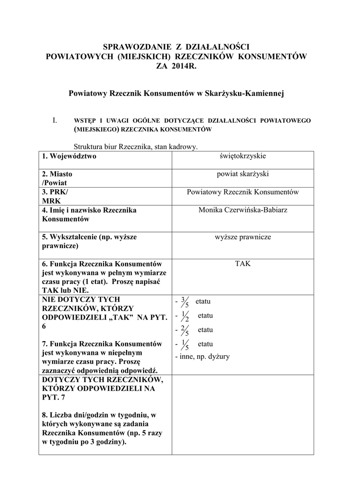 SPRAWOZDANIE Z DZIAŁALNOŚCI POWIATOWYCH (MIEJSKICH) RZECZNIKÓW KONSUMENTÓW ZA 2014R. Powiatowy Rzecznik Konsumentów w Skarżysku-Kamiennej I. WSTĘP I UWAGI OGÓLNE DOTYCZĄCE DZIAŁALNOŚCI POWIATOWEGO (MIEJSKIEGO) RZECZNIKA KONSUMENTÓW Struktura biur Rzecznika, stan kadrowy. 1. Województwo 2. Miasto /Powiat 3. PRK/ MRK 4. Imię i nazwisko Rzecznika Konsumentów świętokrzyskie powiat skarżyski Powiatowy Rzecznik Konsumentów Monika Czerwińska-Babiarz wyższe prawnicze 5. Wykształcenie (np. wyższe prawnicze) 6. Funkcja Rzecznika Konsumentów jest wykonywana w pełnym wymiarze czasu pracy (1 etat). Proszę napisać TAK lub NIE. NIE DOTYCZY TYCH RZECZNIKÓW, KTÓRZY ODPOWIEDZIELI „TAK” NA PYT. 6 7. Funkcja Rzecznika Konsumentów jest wykonywana w niepełnym wymiarze czasu pracy. Proszę zaznaczyć odpowiednią odpowiedź. DOTYCZY TYCH RZECZNIKÓW, KTÓRZY ODPOWIEDZIELI NA PYT. 7 8. Liczba dni/godzin w tygodniu, w których wykonywane są zadania Rzecznika Konsumentów (np. 5 razy w tygodniu po 3 godziny). TAK - 3 5 etatu - 1 2 etatu - 25 - 15 etatu etatu - inne, np. dyżury 9. Rzecznik działa w ramach wyodrębnionego biura (art. 40 pkt 4 ustawy z dnia 16 lutego 2007 r. o ochronie konkurencji i konsumentów Dz. U. Nr 50, poz. 331 ze zm.) Proszę napisać TAK lub NIE. 10. Rzecznik Konsumentów w ramach działalności Rzecznika korzysta z pomocy innych osób. Proszę napisać TAK lub NIE. 11. Liczba osób, która stale pomaga Rzecznikowi Konsumentów w wykonywaniu obowiązków Rzecznika (jeśli liczba nie jest stała, to wpisać średnią liczbę). NIE NIE - Od dnia 01 października 2013r. do dnia 07 października 2014r. Powiatowego Rzecznika Konsumentów w Skarżysku-Kamiennej, panią Monikę CzerwińskąBabiarz, zastępowała pani Małgorzata Rymarz, posiadająca wykształcenie wyższe ekonomiczne, która wcześniej przez 6 miesięcy odbywała staż w biurze tutejszego rzecznika. II. REALIZACJA ZADAŃ RZECZNIKÓW KONSUMENTÓW Zadania z zakresu ochrony konsumentów są realizowane przez samorząd szczebla powiatowego jako zadania własne. Zgodnie z art. 4 ust. 1 pkt 18 ustawy z dnia 05 czerwca 1998r. o samorządzie powiatowym (Dz. U. z 2013r., poz. 595 ze zm.), powiat wykonuje określone ustawami zadania publiczne o charakterze ponadgminnym w zakresie m.in. ochrony praw konsumenta. Zadania te oraz formę ich realizacji określają przede wszystkim przepisy art. 37–43 ustawy z dnia 16 lutego 2007r. o ochronie konkurencji i konsumentów (Dz. U. 2015r., poz. 184). 1. Zapewnienie bezpłatnego poradnictwa konsumenckiego i informacji prawnej w zakresie ochrony interesów konsumentów. Problematyka spraw, z którymi w 2014r. zgłaszali się konsumenci, była bardzo różnorodna. Udzielane porady i podejmowane interwencje dotyczyły w znacznej mierze umów sprzedaży, w tym obuwia i odzieży, jak również elementów wyposażenia mieszkania. W zakresie usług, podejmowane interwencje obejmowały głównie kwestie wprowadzania konsumentów w błąd przez operatorów świadczących usługi telekomunikacyjne co do warunków zawartych umów. Praktyki te polegały m.in. na braku określania nazwy operatora, okresu, na jaki umowa została zawarta, nieudostępnianiu cennika i regulaminu świadczonych usług, czy też braku informacji o prawie do odstąpienia od umowy zawartej na odległość/poza lokalem 2 przedsiębiorstwa w terminie 10 dni i, co się z tym wiąże, niedołączaniu do umów wzoru odstąpienia od takiej umowy. Dwaj operatorzy świadczący usługi telekomunikacyjne, co do których konsumenci najczęściej zgłaszali stosowanie powyższych praktyk, to: Telekomunikacja Dla Domu Sp. z o.o. z siedzibą w Warszawie oraz PTS S.A. z siedzibą we Wrocławiu. Podobnie, jak i w roku 2013, kilka podjętych interwencji dotyczyło kwestii podejrzenia sfałszowania podpisu konsumenta na umowie o świadczenie usług telekomunikacyjnych przez przedstawiciela spółki TelePolska Sp. z o.o. z siedzibą w Warszawie. W tej sprawie Komenda Powiatowa Policji w Skarżysku-Kamiennej prowadzi odrębne postępowanie. Wiele porad i podejmowanych interwencji związanych było także z działaniami firm świadczących usługi bankowe i ubezpieczeniowe. W roku 2014, wiele zapytań dotyczyło również praktyk stosowanych przez przedsiębiorców sprzedających energię elektryczną. Zapytań o praktyki stosowane przez Energetyczne Centrum S.A. z siedzibą w Radomiu było niewiele, natomiast zdecydowana większość zapytań konsumentów, i wystąpień rzecznika skierowanych do przedsiębiorcy dotyczyła praktyk stosowanych przez: Polska Energetyka PRO Sp. z o.o. z siedzibą w Warszawie-przedsiębiorstwo zajmujące się sprzedażą energii elektrycznej. Konsumenci, z którymi skontaktowali się przedstawiciele Polska Energetyka PRO Sp. z o.o. z siedzibą w Warszawie, często podkreślali, że zostali przez nich wprowadzeni w błąd co do nazwy firmy, którą reprezentują, jak również samej oferty i wynikających z niej obowiązków oraz kar za wypowiedzenie umowy. Ponadto konsumenci nie byli informowani o obowiązkach związanych z zawarciem umowy sprzedaży energii elektrycznej i karach za wypowiedzenie tejże umowy oraz o przysługującym im prawie do odstąpienia od umowy zawartej poza lokalem przedsiębiorstwa w terminie 10 dni. Co więcej, zdarzało się, że konsumenci jako jedyny dokument sporządzony przy zawieraniu umowy, otrzymywali tylko jej pierwszą kartkę lub też nie otrzymywali żadnych dokumentów. Nadto, w 2014r. kilkanaście zapytań związanych było z praktykami stosowanymi przez portal Plikostrada (właściciel portalu - spółka Smart Tech Connect Ltd. z siedzibą w Dubaju), działający na bardzo podobnych zasadach do znanego już wcześniej rzecznikowi portalu Pobieraczek.pl. Kilkadziesiąt zapytań konsumentów i wystąpień rzecznika skierowanych do przedsiębiorców dotyczyło: Westerfield International AG z siedzibą w Holandii - Biuro Obsługi Klienta w Warszawie (umowy