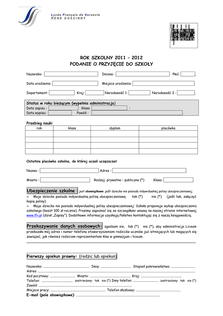 Lycée Français de Varsovie RENE GOSCINNY ROK SZKOLNY 2011 – 2012 PODANIE O PRZYJĘCIE DO SZKOŁY Nazwisko: Imiona: Data urodzenia: Miejsce urodzenia: Departament: Kraj: Płeć: . . Narodowość 1: Narodowość 2 : . Status w roku bieŜącym (wypełnia administracja) Data zapisu : Data wypisu: Klasa: Powód : : . Przebieg nauki rok klasa dyplom placówka Ostatnia placówka szkolna, do której uczeń uczęszczał: Nazwa : Miasto : Ubezpieczenie szkolne : Adres : . Rodzaj: prywatna – publiczna (*) Klasa: . jest obowiązkowe jeśli dziecko nie posiada indywidualnej polisy ubezpieczeniowej. • Moje dziecko posiada indywidualną polisę ubezpieczeniową tak (*) nie (*) (jeśli tak, załączyć kopię polisy) • Moje dziecko nie posiada indywidualnej polisy ubezpieczeniowej: Szkoła proponuje wykup ubezpieczenia szkolnego (koszt 100 zł rocznie). Prosimy zapoznać się ze szczegółami umowy na naszej stronie internetowej www.lfv.pl (dział „Zapisy”). Dodatkowe informacje uzyskają Państwo kontaktując się z naszą księgowością. Przekazywanie danych osobowych: zgadzam sie, tak (*) nie (*), aby administracja Liceum przekazała mój adres i numer telefonu stowarzyszeniom rodziców uczniów juŜ istniejących lub mogących się zawiązać, jak równieŜ rodzicom reprezentantom klas w gimnazjum i liceum. ________________________________________________________________________________ Pierwszy opiekun prawny: (rodzic lub opiekun) Nazwisko: ....................................................... Imię: .................................... Stopień pokrewieństwa: ............................. Adres: ........................................................................................................................................................................................... Kod pocztowy: .............................. Miasto: ................................................. Kraj: ................................................. Telefon: ..................................... zastrzeŜony: tak nie (*) Inny telefon: .............................. zastrzeŜony: tak nie (*) Zawód: ............................................................................................................... Miejsce pracy: .................................................................. Telefon słuŜbowy: ..................................................... E-mail (pole obowiązkowe): .................................................................................................... Drugi opiekun prawny: Nazwisko: ....................................................... Imię: .................................... Stopień pokrewieństwa: ............................. Adres: ........................................................................................................................................................................................... Miasto : kod pocztowy: .............................. Miasto: ................................................. Kraj: ................................................. Telefon: ..................................... zastrzeŜony: tak nie (*) Inny telefon: .............................. zastrzeŜony: tak nie (*) Zawód: ............................................................................................................... Miejsce pracy: .................................................................. Telefon słuŜbowy: ..................................................... E-mail: .................................................................................................... SYTUACJA RODZINNA małŜenstwo po rozwodzie wdowiec/wdowa inna PŁATNIK : (jeśli nie jest to wymieniony powyŜej opiekun – załączyć zobowiązanie do płatności, podpisane przez osobę prywatną lub przedsiębiorstwo) Adres ucznia, jeśli jest inny niŜ adres głównego opiekuna Adres: …………………………………………………………………………………………................................................................................................ Miasto : kod pocztowy: ..................................... Miasto: ..................................... Kraj: ....................................... Telefon: ..................................... zastrzeŜony: tak nie (*) Inny telefon: .............................. zastrzeŜony: tak nie (*) (*) Niepotrzebne skreślić NB : Proszę nie zapomnieć o podpisaniu umowy (str. 4 niniejszego podania). Liceum Francuskie w Warszawie Umowa na rok szkolny 2011 – 2012 pomiędzy Liceum Francuskim w Warszawie, reprezentowanym przez przewodniczącego Rady Zarządu Liceum, oraz dyrektorem, a opiekunem prawnym ucznia, uzgodniono co następuje: Liceum Francuskie w Warszawie jest placówką zarządzaną przez rodziców, związaną umową z Agencją d/s Nauczania Francuskiego Za Granicą oraz akredytowaną przez francuskie Ministerstwo Edukacji Narodowej. Czesne przeznaczone jest wyłącznie na pokrycie wydatków związanych z obowiązkowym programem nauczania, ustalonym przez francuskie Ministerstwo Edukacji Narodowej; nie pokrywa: kosztów świadczeń dodatkowych i fakultatywnych (transport szkolny i stołówka szkolna) kosztów zajęć pozalekcyjnych, proponowanych w załączniku do niniejszej umowy kosztów zajęć proponowanych okazjonalnie dla grup uczniów (wycieczki szkolne z noclegiem). Rodzice nie powinni zgadzać się na finansowanie jakichkolwiek zajęć jeśli nie otrzymają dokumentu podpisanego przez osoby upowaŜnione: przewodniczącego i skarbnika Rady Zarządu, dyrektora i intendenta szkoły. Przedszkole i Szkoła Podstawowa Jedna stawka Gimnazjum Liceum Jedna stawka Jedna stawka Czesne za okres roku szkolnego 16 582 PLN 23 807 PLN Ubezpieczenie WypoŜyczenie podręczników Pierwszy zapis i ponowny zapis : wpisowe i opłata rejestracyjna 526 PLN 100 PLN Podręczniki i pomoce 150 PLN szkolne bezpłatne 1 600 PLN + (nowi uczniowie : 300 PLN opłaty rejestracyjnej) 9 1
