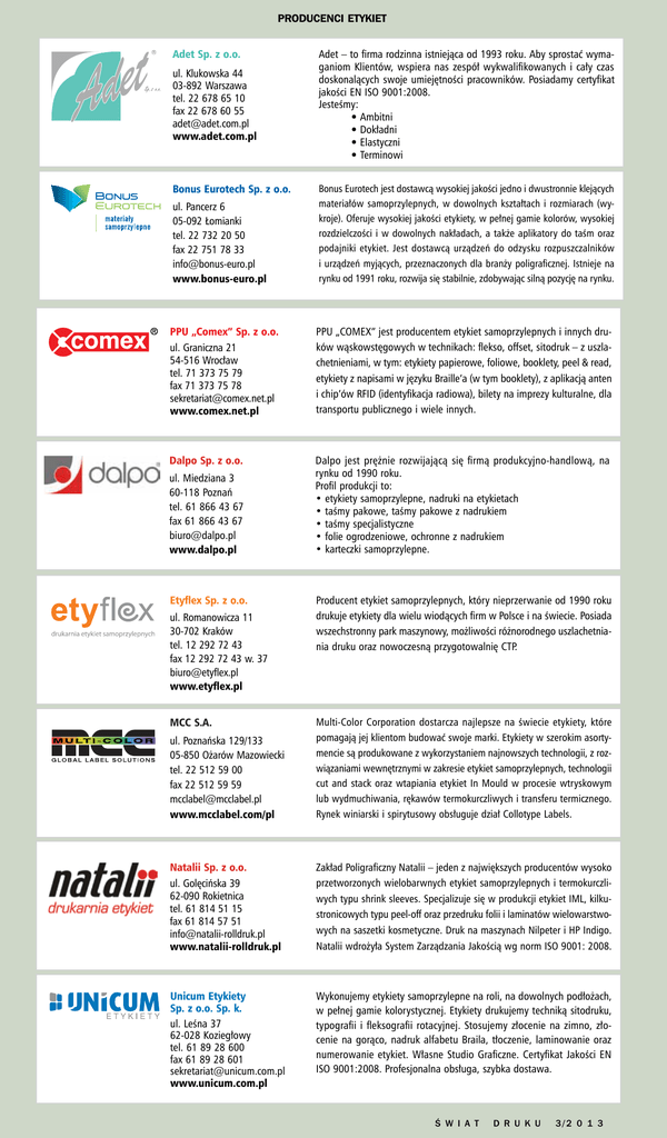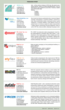 PRODUCENCI ETYKIET Adet Sp. z o.o. ul. Klukowska 44 03-892 Warszawa tel. 22 678 65 10 fax 22 678 60 55 [email protected] www.adet.com.pl Adet – to firma rodzinna istniejąca od 1993 roku. Aby sprostać wymaganiom Klientów, wspiera nas zespół wykwalifikowanych i cały czas doskonalących swoje umiejętności pracowników. Posiadamy certyfikat jakości EN ISO 9001:2008. Jesteśmy: • Ambitni • Dokładni • Elastyczni • Terminowi Bonus Eurotech Sp. z o.o. Bonus Eurotech jest dostawcą wysokiej jakości jedno i dwustronnie klejących materiałów samoprzylepnych, w dowolnych kształtach i rozmiarach (wyul. Pancerz 6 kroje). Oferuje wysokiej jakości etykiety, w pełnej gamie kolorów, wysokiej 05-092 Łomianki rozdzielczości i w dowolnych nakładach, a także aplikatory do taśm oraz tel. 22 732 20 50 podajniki etykiet. Jest dostawcą urządzeń do odzysku rozpuszczalników fax 22 751 78 33 i urządzeń myjących, przeznaczonych dla branży poligraficznej. Istnieje na [email protected] 53 ETYKIET rynku od 1991 roku, rozwija się stabilnie, zdobywając silną pozycję na rynku. www.bonus-euro.pl PRODUCENCI ś W I A T D R U K U 3/2 0 1 3 PPU „Comex” Sp. z o.o. ul. Graniczna 21 54-516 Wrocław tel. 71 373 75 79 fax 71 373 75 78 [email protected] www.comex.net.pl PPU „COMEX” jest producentem etykiet samoprzylepnych i innych druków wąskowstęgowych w technikach: flekso, offset, sitodruk – z uszlachetnieniami, w tym: etykiety papierowe, foliowe, booklety, peel & read, etykiety z napisami w języku Braille’a (w tym booklety), z aplikacją anten i chip’ów RFID (identyfikacja radiowa), bilety na imprezy kulturalne, dla transportu publicznego i wiele innych. Dalpo Sp. z o.o. Dalpo jest prężnie rozwijającą się firmą produkcyjno-handlową, na rynku od 1990 roku. Profil produkcji to: • etykiety samoprzylepne, nadruki na etykietach • taśmy pakowe, taśmy pakowe z nadrukiem • taśmy specjalistyczne • folie ogrodzeniowe, ochronne z nadrukiem • karteczki samoprzylepne. ul. Miedziana 3 60-118 Poznań tel. 61 866 43 67 fax 61 866 43 67 [email protected] www.dalpo.pl Etyflex Sp. z o.o. ul. Romanowicza 11 30-702 Kraków tel. 12 292 72 43 fax 12 292 72 43 w. 37 [email protected] www.etyflex.pl MCC S.A. Producent etykiet samoprzylepnych, który nieprzerwanie od 1990 roku drukuje etykiety dla wielu wiodących firm w Polsce i na świecie. Posiada wszechstronny park maszynowy, możliwości różnorodnego uszlachetniania druku oraz nowoczesną przygotowalnię CTP. ul. Poznańska 129/133 05-850 Ożarów Mazowiecki tel. 22 512 59 00 fax 22 512 59 59 [email protected] www.mcclabel.com/pl Multi-Color Corporation dostarcza najlepsze na świecie etykiety, które pomagają jej klientom budować swoje marki. Etykiety w szerokim asortymencie są produkowane z wykorzystaniem najnowszych technologii, z rozwiązaniami wewnętrznymi w zakresie etykiet samoprzylepnych, technologii cut and stack oraz wtapiania etykiet In Mould w procesie wtryskowym lub wydmuchiwania, rękawów termokurczliwych i transferu termicznego. Rynek winiarski i spirytusowy obsługuje dział Collotype Labels. Natalii Sp. z o.o. ul. Golęcińska 39 62-090 Rokietnica tel. 61 814 51 15 fax 61 814 57 51 [email protected] www.natalii-rolldruk.pl Zakład Poligraficzny Natalii – jeden z największych producentów wysoko przetworzonych wielobarwnych etykiet samoprzylepnych i termokurczliwych typu shrink sleeves. Specjalizuje się w produkcji etykiet IML, kilkustronicowych typu peel-off oraz przedruku folii i laminatów wielowarstwowych na saszetki kosmetyczne. Druk na maszynach Nilpeter i HP Indigo. Natalii wdrożyła System Zarządzania Jakością wg norm ISO 9001: 2008. Unicum Etykiety Sp. z o.o. Sp. k. ul. Leśna 37 62-028 Koziegłowy tel. 61 89 28 600 fax 61 89 28 601 [email protected] www.unicum.com.pl Wykonujemy etykiety samoprzylepne na roli, na dowolnych podłożach, w pełnej gamie kolorystycznej. Etykiety drukujemy techniką sitodruku, typografii i fleksografii rotacyjnej. Stosujemy złocenie na zimno, złocenie na gorąco, nadruk alfabetu Braila, tłoczenie, laminowanie oraz numerowanie etykiet. Własne Studio Graficzne. Certyfikat Jakości EN ISO 9001:2008. Profesjonalna obsługa, szybka dostawa. ś W I A T D R U K U 3/2 0 1 3