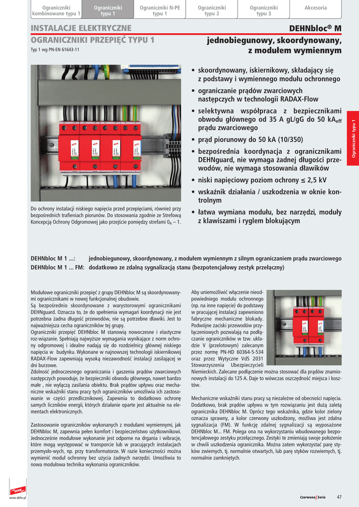 Ograniczniki kombinowane typu 1 Ograniczniki typu 1 Ograniczniki N-PE typu 1 iNstalacjE ElEktryczNE OgraNiczNiki przEpięć typu 1 Typ 1 wg PN-EN 61643-11 Ograniczniki typu 2 Ograniczniki typu 3 Akcesoria DEHNbloc® M jednobiegunowy, skoordynowany, z modułem wymiennym • skoordynowany, iskiernikowy, składający się z podstawy i wymiennego modułu ochronnego • selektywna współpraca z bezpiecznikami obwodu głównego od 35 A gL/gG do 50 kAeff prądu zwarciowego • prąd piorunowy do 50 kA (10/350) • bezpośrednia koordynacja z ogranicznikami DEHNguard, nie wymaga żadnej długości przewodów, nie wymaga stosowania dławików • niski napięciowy poziom ochrony ≤ 2,5 kV • wskaźnik działania / uszkodzenia w oknie kontrolnym Do ochrony instalacji niskiego napięcia przed przepięciami, również przy bezpośrednich trafieniach piorunów. Do stosowania zgodnie ze Strefową Koncepcją Ochrony Odgromowej jako przejście pomiędzy strefami 0A – 1. • łatwa wymiana modułu, bez narzędzi, moduły z klawiszami i ryglem blokującym DEHNbloc M 1 ...: jednobiegunowy, skoordynowany, z modułem wymiennym z silnym ograniczaniem prądu zwarciowego DEHNbloc M 1 ... FM: dodatkowo ze zdalną sygnalizacją stanu (bezpotencjałowy zestyk przełączny) Modułowe ograniczniki przepięć z grupy DEHNbloc M są skoordynowanymi ogranicznikami w nowej funkcjonalnej obudowie. Są bezpośrednio skoordynowane z warystorowymi ogranicznikami DEHNguard. Oznacza to, że do spełnienia wymagań koordynacji nie jest potrzebna żadna długość przewodów, nie są potrzebne dławiki. Jest to najważniejsza cecha ograniczników tej grupy. Ograniczniki przepięć DEHNbloc M stanowią nowoczesne i elastyczne roz-wiązanie. Spełniają najwyższe wymagania wynikające z norm ochrony odgromowej i idealne nadają się do rozdzielnicy głównej niskiego napięcia w budynku. Wykonane w najnowszej technologii iskiernikowej RADAX-Flow zapewniają wysoką niezawodność instalacji zasilającej w dni burzowe. Zdolność jednoczesnego ograniczania i gaszenia prądów zwarciowych następczych powoduje, że bezpieczniki obwodu głównego, nawet bardzo małe , nie wyłączą zasilania obiektu. Brak prądów upływu oraz mechaniczne wskaźniki stanu pracy tych ograniczników umożliwia ich zastosowanie w części przedlicznikowej. Zapewnia to dodatkowo ochronę samych liczników energii, których działanie oparte jest aktualnie na elementach elektronicznych. Zastosowanie ograniczników wykonanych z modułami wymiennymi, jak DEHNbloc M, zapewnia pełen komfort i bezpieczeństwo użytkownikowi. Jednocześnie modułowe wykonanie jest odporne na drgania i wibracje, które mogą występować w transporcie lub w pracujących instalacjach przemysło-wych, np. przy transformatorze. W razie konieczności można wymienić moduł ochronny bez użycia żadnych narzędzi. Umożliwia to nowa modułowa technika wykonania ograniczników. www.dehn.pl Aby uniemożliwić włączenie nieodpowiedniego modułu ochronnego (np. na inne napięcie) do podstawy w pracującej instalacji zapewniono fabryczne mechaniczne blokady. Podwójne zaciski przewodów przyłączeniowych pozwalają na podłączanie ograniczników w tzw. układzie V (przelotowym) zalecanym przez normę PN-HD 60364-5-534 oraz przez Wytyczne VdS 2031 Stowarzyszenia Ubezpieczycieli Niemieckich. Zalecane podłączenie można stosować dla prądów znamionowych instalacji do 125 A. Daje to wówczas oszczędność miejsca i kosztów. Mechaniczne wskaźniki stanu pracy są niezależne od obecności napięcia. Dodatkowo, brak prądów upływu w tym rozwiązaniu jest dużą zaletą ogranicznika DEHNbloc M. Oprócz tego wskaźnika, gdzie kolor zielony oznacza sprawny, a kolor czerwony uszkodzony, możliwa jest zdalna sygnalizacja (FM). W funkcję zdalnej sygnalizacji są wyposażone DEHNbloc M... FM. Polega ona na wykorzystaniu wbudowanego bezpotencjałowego zestyku przełącznego. Zestyki te zmieniają swoje położenie w chwili uszkodzenia ogranicznika. Można zatem wykorzystać parę styków zwiernych, tj. normalnie otwartych, lub parę styków rozwiernych, tj. normalnie zamkniętych. 4 Ograniczniki typu 1 • ograniczanie prądów zwarciowych następczych w technologii RADAX-Flow Ograniczniki kombinowane typu 1 961 115 150 FM 961 125 255 FM 961 135 320 FM DB M 1 DB M 1 150 FM Maxi modular 1 150 FM DB M 1 255 FM Maxi modular 1 255 FM DB M 1 320 FM Maxi modular 1 320 FM DEHNbloc 961 115 DEHNbloc 961 125 DEHNbloc 961 135 DB M 1 DB M 1 Ograniczniki typu 1 Ograniczniki N-PE typu 1 Ograniczniki typu 2 Ograniczniki typu 3 Akcesoria DEHNbloc® M DEHNbloc M 1 ... FM iNstalacjE ElEktryczNE OgraNiczNiki przEpięć typu 1 L/N 12 11 14 Rysunek wymiarowy DB M 1 ... FM Ograniczniki typu 1 N/PE(N) Schemat połączeń DB M 1 ... FM DB M 1 ... FM: jednobiegunowy, skoordynowany, z modułem wymiennym i silnym ograniczaniem prądu zwarciowego; ze zdalną sygnalizacją stanu (bezpotencjałowy zestyk przełączny) Ogranicznik przepięć wg PN-EN 61643-11 Ogranicznik przepięć wg PN-IEC 61643-1 Największe napięcie trwałej pracy AC UC Prąd udarowy (10/350) Iimp Znamionowy prąd wyładowczy (8/20) In Napięciowy poziom ochrony UP Zdolność gaszenia prądu następczego AC Ifi Ograniczanie prądu następczego / Selektywność Czas zadziałania tA Maks. bezpiecznik (L) do IK = 50 kAeff (ta ≤ 0,2 s) Maks. bezpiecznik (L) do IK = 50 kAeff (ta ≤ 5 s) Maks. bezpiecznik (L) przy IK > 50 kAeff Maks. bezpiecznik (L-L´) Przepięcie dorywcze UT Przepięcia dorywcze - cecha Zakres temperatur pracy (połączenie równoległe) TUP Zakres temperatur pracy (połączenie szeregowe) TUS Wskaźnik działania / uszkodzenia Przekroje przewodów (L/N, L´/N´, N/PE(N)) min. Przekroje przewodów (L/N, N/PE(N)) maks. Przekroje przewodów (L´/N´) maks. Montaż Materiał obudowy Stopień ochrony Szerokość montażowa Dodatkowe certfikaty Sygnalizacja uszkodzenia FM / Typ zestyku Parametry obwodu sygnalizacji AC Parametry