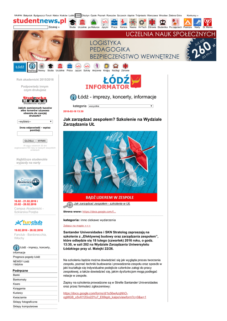 lokalnie: Białystok BydgoszczToruń Kielce Kraków Lublin Łódź Olsztyn Opole Poznań Rzeszów Szczecin śląskie Trójmiasto Warszawa Wrocław Zielona Góra Szukaj ›› Imprezy Newsy Studia Studia Uczelnie Praca Uczelnie po Maturze Języki Praca Kariera Nauka HiTech Zdrowie Studentka Po zajęciach Podróże Języki Szkoły Aktywnie Knajpy Noclegi Zdrowie Rok akademicki 2015/2016 Podpowiedz innym czym drukujesz Łódź imprezy, koncerty, informacje Jakich zamiennych tuszów albo tonerów używasz obecnie do swojej drukarki? wybierz Inna odpowiedź wpisz poniżej: kategoria wszystkie 20160218 13:30 Jak zarządzać zespołem? Szkolenie na Wydziale Zarządzania UŁ GLOSUJ WYNIKI W ciągu ostatnich 30 dni zagłosowano184 razy w naszych wszystkich ankietach Najbliższe studenckie wyjazdy na narty 16.02 21.02.2016 i 23.02 28.02.2016 Campus Akademicki Szklarska Poręba Jak zarządzać zespołem szkolenie w UŁ Strona www: https://docs.google.com/f... kategoria: inne ciekawe wydarzenia Zobacz na mapie >>> 19.02.2016 28.02.2016 Fanclub Bardonecchia, Włochy Łódź imprezy, koncerty, Santander Universidades i SKN Stratolog zapraszają na szkolenie z „Efektywnej budowy oraz zarządzania zespołem”, które odbędzie się 18 lutego (czwartek) 2016 roku, o godz. 13:30, w sali 202 na Wydziale Zarządzania Uniwersytetu Łódzkiego przy ul. Matejki 22/26. informacje Prognoza pogody Łódź NEWSY Łódź i łódzkie Podręczne Banki Bankomaty Ksero Księgarnie Kurierzy Kwiaciarnie Sklepy fotograficzne Sklepy komputerowe Konkursy » Na szkoleniu będzie można dowiedzieć się jak wygląda proces tworzenia zespołu, poznać techniki budowania i prowadzenia zespołu oraz sposób w jaki kształtuje się indywidualne podejście członków załogi do pracy zespołowej, a także dowiedzieć się, jakim dysfunkcjom mogą podlegać relacje w zespole. Zapisy na szkolenia prowadzone są w Strefie Santander Universidades oraz przez formularz zgłoszeniowy: https://docs.google.com/forms/d/1s56wAzqNhO ogMGB_x5vKY2Go22Yu7_E69qpb_kaipo/viewform?c=0&w=1 Narty St. Marka