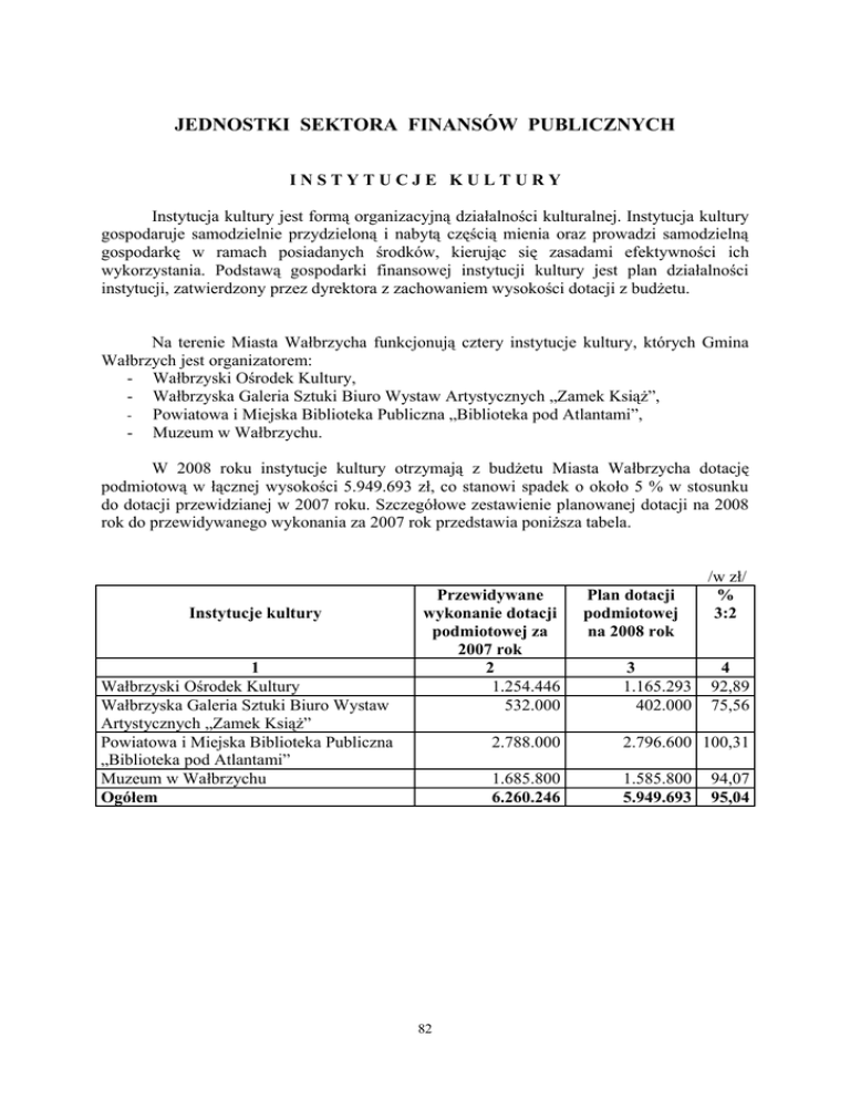 JEDNOSTKI SEKTORA FINANSÓW PUBLICZNYCH INSTYTUCJE KULTURY Instytucja kultury jest formą organizacyjną działalności kulturalnej. Instytucja kultury gospodaruje samodzielnie przydzieloną i nabytą częścią mienia oraz prowadzi samodzielną gospodarkę w ramach posiadanych środków, kierując się zasadami efektywności ich wykorzystania. Podstawą gospodarki finansowej instytucji kultury jest plan działalności instytucji, zatwierdzony przez dyrektora z zachowaniem wysokości dotacji z budżetu. Na terenie Miasta Wałbrzycha funkcjonują cztery instytucje kultury, których Gmina Wałbrzych jest organizatorem: - Wałbrzyski Ośrodek Kultury, - Wałbrzyska Galeria Sztuki Biuro Wystaw Artystycznych „Zamek Książ”, - Powiatowa i Miejska Biblioteka Publiczna „Biblioteka pod Atlantami”, - Muzeum w Wałbrzychu. W 2008 roku instytucje kultury otrzymają z budżetu Miasta Wałbrzycha dotację podmiotową w łącznej wysokości 5.949.693 zł, co stanowi spadek o około 5 % w stosunku do dotacji przewidzianej w 2007 roku. Szczegółowe zestawienie planowanej dotacji na 2008 rok do przewidywanego wykonania za 2007 rok przedstawia poniższa tabela. Instytucje kultury 1 Wałbrzyski Ośrodek Kultury Wałbrzyska Galeria Sztuki Biuro Wystaw Artystycznych „Zamek Książ” Powiatowa i Miejska Biblioteka Publiczna „Biblioteka pod Atlantami” Muzeum w Wałbrzychu Ogółem Przewidywane wykonanie dotacji podmiotowej za 2007 rok 2 1.254.446 532.000 82 Plan dotacji podmiotowej na 2008 rok 3 1.165.293 402.000 /w zł/ % 3:2 4 92,89 75,56 2.788.000 2.796.600 100,31 1.685.800 6.260.246 1.585.800 5.949.693 94,07 95,04 WAŁBRZYSKI OŚRODEK KULTURY Planowana dotacja dla Wałbrzyskiego Ośrodka Kultury, w tym dla Zespołu Pieśni i Tańca, na 2008 rok wynosi 1.165.293 zł. PLAN FINANSOWY WAŁBRZYSKIEGO OŚRODKA KULTURY NA 2008 ROK Lp. Wyszczególnienie 1 2 I. PRZYCHODY OGÓŁEM, z tego: 1. Przychody własne, z tego: - wpływy z prowadzonej działalności - wpływy z najmu i dzierżawy - środki otrzymane od osób fizycznych i prawnych - inne źródła 2. Dotacje z budżetu, z tego: - dotacja podmiotowa II. KOSZTY OGÓŁEM, z tego: 1. Fundusz wynagrodzeń, w tym: - wynagrodzenia osobowe - honoraria, umowy zlecenia - składki na ubezpieczenia społeczne i Fundusz Pracy - Fundusz Świadczeń Socjalnych 2. Zakup materiałów 3. Zakup usług , w tym: - zakup usług remontowych 4. Wydatki majątkowe 5. Pozostałe koszty III. WYNIK FINANSOWY IV. ZOBOWIĄZANIA V. NALEŻNOŚCI /w zł/ Plan na 2008 rok 3 1.536.293 371.000 120.000 22.000 129.000 100.000 1.165.293 1.165.293 1.536.293 995.339 558.380 310.200 111.659 15.100 113.930 342.698 10.000 84.326 26.615 24.380 Zobowiązania w wysokości 26.615 zł stanowią zaległości z lat ubiegłych. Zgodnie z podpisanym porozumieniem z Zakładem Ubezpieczeń Społecznych zobowiązania te zostały rozłożone na raty i termin ich spłaty przypada na sierpień 2008 roku. Natomiast kwota należności w wysokości 24.380 zł to zwrot niesłusznie pobranych środków wraz z odsetkami przez byłego pracownika WOK. 83 DZIAŁALNOŚĆ MERYTORYCZNA WAŁBRZYSKIEGO OŚRODKA KULTURY NA 2008 ROK W 2008 roku Wałbrzyski Ośrodek Kultury zamierza zorganizować takie imprezy jak: • • • • • • • • • • • • • • • • • • • • • Wieczory GRAjNATOWE, Liga Rocka, Wielka Orkiestra Świątecznej Pomocy, Ogólnopolska Giełda Kabaretowa „Przewałka”, Walentynki 2008, Zima 2008 – ferie, Artystyczny Turniej Świetlic „ARTUŚ”, Pikniki Rodzinne, Konkurs Piosenki Przedszkolnej, Wakacje 2008, Muzyczne trendy, Dni Seniora, Wałbrzyski Turniej Tańca DISCO, Dni Wałbrzycha, Konkurs plastyczny „Anioły” - muśnięcie skrzydeł”, Andrzejki, Mikołaj, Wałbrzyski Przegląd Piosenki Chrześcijańskiej „Pozytywne Granie”, Dzień Dziecka, Jarmark Świąteczny, WaPFiN – kino plenerowe, przeglądy filmowe Ponadto w ramach imprez cyklicznych planuje się: Wernisaże i wystawy, • Współorganizację imprez, • Amatorski Ruch Artystyczny, • Współpracę z zagranicą • 84 WAŁBRZYSKA GALERIA SZTUKI BIURO WYSTAW ARTYSTYCZNYCH „ZAMEK KSIĄŻ” Dotację budżetową dla Wałbrzyskiej Galerii Sztuki na 2008 rok ustalono w wysokości 402.000 zł. PLAN FINANSOWY WAŁBRZYSKIEJ GALERII SZTUKI BIURO WYSTAW ARTYSTYCZNYCH „ZAMEK KSIĄŻ” NA 2008 ROK /w zł/ Lp. Wyszczególnienie Plan na 2008 rok 1 2 3 I. PRZYCHODY OGÓŁEM, z tego: 610.000 1. Przychody własne, z tego: 208.000 - wpływy z prowadzonej działalności 200.000 - środki otrzymane od osób fizycznych 5.000 i prawnych - inne źródła 3.000 2. Dotacje z budżetu, z tego: 402.000 - dotacja podmiotowa 402.000 II. KOSZTY OGÓŁEM, z tego: 610.000 1. Fundusz wynagrodzeń, w tym: 483.712 - wynagrodzenia osobowe 399.861 - honoraria, umowy zlecenia 4.000 - składki na ubezpieczenia społeczne i 68.945 Fundusz Pracy - Fundusz Świadczeń Socjalnych 10.906 2. Zakup materiałów 17.410 3. Zakup usług remontowych 4. Wydatki majątkowe 5. Pozostałe koszty 108.878 III. WYNIK FINANSOWY IV. ZOBOWIĄZANIA 50.000 V. NALEŻNOŚCI 15.000 Zobowiązania w wysokości 50.000 zł dotyczą zapłaty za transport powrotny eksponatów z wystawy „Obraz nie ręką ludzką malowany Ikony Jerzego Nowosielskiego i archetypy”. Natomiast kwota należności w wysokości 15.000 zł to należności z tytułu wypożyczenia wystawy „Obraz nie ręką ludzką malowany….”. 85 PLAN WYSTAWIENNICZY NA ROK 2008 WAŁBRZYSKIEJ GALERII SZTUKI BWA „ZAMEK KSIĄŻ” „Republika Bananowa” – polska sztuka lat 80 - 26.01.- 23.03.2008 r. III Międzynarodowe Biennale Pasteli – Nowy Sącz 2006 – 29.03.- 11.05.2008 r. „Korczak i jego dzieło” – 17.05 - 29.06.2008 r. Kolekcja szkła artystycznego ze zbiorów wałbrzyskiej Galerii sztuki BWA „Zamek Książ” – 17.05.2008 - 26.01.2009 r. W ramach Międzynarodowego Festiwalu Kameralistyki Ensemble imienia Księżnej Disy wystawa oryginalnych partytur Krzysztofa Pend