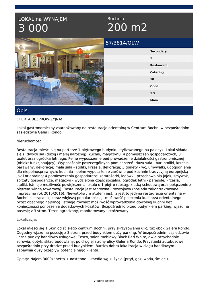 LOKAL na WYNAJEM 3 000 Bochnia 200 m2 57/3814/OLW Secondary 1 Restaurant Catering 10 Good 1.5 Main Opis OFERTA BEZPROWIZYJNA! Lokal gastronomiczny zaaranżowany na restauracje orientalną w Centrum Bochni w bezpośrednim sąsiedztwie Galerii Rondo. Nieruchomość: Restauracja mieści się na parterze 1-piętrowego budynku stylizowanego na pałacyk. Lokal składa się z: dwóch sal (dużej i małej narożnej), kuchni, magazynu, 4 pomieszczeń gospodarczych, 3 toalet oraz ogródka letniego. Pełne wyposażenie pod prowadzenie działalności gastronomicznej (obiekt funkcjonujący). Wyposażenie poszczególnych pomieszczeń: duża sala - bar, stoliki, krzesła, parawany, dekoracje; mała sala - stoliki, krzesła, dekoracje; 3 toalety - wc, umywalki, udogodnienia dla niepełnosprawnych; kuchnia - pełne wyposażenie zarówno pod kuchnie tradycyjną europejską jak i orientalną; 4 pomieszczenia gospodarcze: zamrażarki, lodówki, przechowalnia jajek, zmywak, sprzęty gospodarcze; magazyn - wydzielona część socjalna; ogródek letni - parasole, krzesła, stoliki. Istnieje możliwość powiększenia lokalu o 1 piętro (dostęp klatką schodową oraz połączenie z piętrem windą towarową). Restauracja jest rentowna i rozwojowa (posiada zakontraktowane imprezy na rok 2015/2016). Niewątpliwym atutem jest, iż jest to jedyna restauracja orientalna w Bochni ciesząca się coraz większą popularnością - możliwość polecenia kucharza orientalnego przez obecnego najemcę. Istnieje również możliwość wprowadzenia dowolnej kuchni bez konieczności ponoszenia dodatkowych kosztów. Bezpośrednio przed budynkiem parking, wjazd na posesję z 3 stron. Teren ogrodzony, monitorowany i stróżowany. Lokalizacja: Lokal mieści się 1,5km od ścisłego centrum Bochni, przy skrzyżowaniu ulic, tuż obok Galerii Rondo. Dogodny wjazd na posesję z 3 stron, przed budynkiem duży parking. W bezpośrednim sąsiedztwie liczne punkty handlowo usługowe: Tesco, salon meblowy Black Red White, dwie przychodnie zdrowia, optyk, skład budowlany, po drugiej strony ulicy Galeria Rondo. Przystanki autobusowe bezpośrednio przy drodze przed budynkiem. Bardzo dobra lokalizacja w ciągu handlowym zapewnia duży przepływ potencjalnego klienta. Opłaty: Najem 3000zł netto + odstępne + media wg zużycia (prąd, gaz, woda, śmieci). Victoria Estate Funkcjonująca restauracja w bardzo dobrej lokalizacji z dużym potencjałem rozwoju. Polecam i zapraszam do oglądania. Marcin Golonka tel. +48 502 411 939 tel. 511 560 721 email: [email protected] Victoria Estate Powered by TCPDF (www.tcpdf.org)