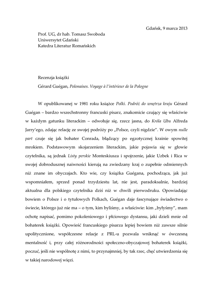 Gdańsk, 9 marca 2013 Prof. UG, dr hab. Tomasz Swoboda Uniwersytet Gdański Katedra Literatur Romańskich Recenzja książki Gérard Guégan, Polonaises. Voyage à l’intérieur de la Pologne W opublikowanej w 1981 roku książce Polki. Podróż do wnętrza kraju Gérard Guégan – bardzo wszechstronny francuski pisarz, znakomicie czujący się właściwie w każdym gatunku literackim – odwołuje się, rzecz jasna, do Króla Ubu Alfreda Jarry’ego, zdając relację ze swojej podróży po „Polsce, czyli nigdzie”. W owym nulle part czuje się jak bohater Conrada, błądzący po egzotycznej krainie spowitej mrokiem. Podstawowym skojarzeniem literackim, jakie pojawia się w głowie czytelnika, są jednak Listy perskie Monteskiusza i spojrzenie, jakie Uzbek i Rica w swojej dobrodusznej naiwności kierują na zwiedzany kraj o zupełnie odmiennych niż znane im obyczajach. Kto wie, czy książka Guégana, pochodząca, jak już wspomniałem, sprzed ponad trzydziestu lat, nie jest, paradoksalnie, bardziej aktualna dla polskiego czytelnika dziś niż w chwili pierwodruku. Opowiadając bowiem o Polsce i o tytułowych Polkach, Guégan daje fascynujące świadectwo o świecie, którego już nie ma – o tym, kim byliśmy, a właściwie: kim „byłyśmy”, mam ochotę napisać, pomimo pokoleniowego i płciowego dystansu, jaki dzieli mnie od bohaterek książki. Opowieść francuskiego pisarza lepiej bowiem niż zawsze silnie upolitycznione, współczesne relacje z PRL-u pozwala wniknąć w ówczesną mentalność i, przy całej różnorodności społeczno-obyczajowej bohaterek książki, poczuć, jeśli nie wspólnotę z nimi, to przynajmniej, by tak rzec, chęć utwierdzenia się w takiej narodowej więzi. Strona |2 Z dzisiejszej perspektywy ten rodzaj dziennika z podróży przywodzi na myśl Andrzeja Stasiuka opowieści z wypraw na Bałkany – do tego niby naszego, a jednak zupełnie innego świata. Z tą jednak różnicą, że krajobraz Polski roku 1980, przy całej barwności i wartkości narracji Guégana, jawi się jako posępniejszy, przesycony rozpaczą. Autor szuka wprawdzie w tym pejzażu dynamicznych i jaskrawych detali – stąd choćby jego wyprawy na bazar i giełdę samochodową – lecz pierwszoplanową rolę grają jednak głosy ludzi: „tu czujemy się zawsze winni”. Boahterkami Guégana są napotykane przez niego kobiety – od córek aparatczyków przez strajkujące lekarki i pielęgniarki (tu Alina Pieńkowska), żonę Lecha Wałęsy, aż po młodą prostytutkę i jeszcze młodszą „punkówę”. One opowiadają mu o swoim życiu, a on wplata w te opowieści swoje własne obserwacje na temat obyczajów, a zwłaszcza ekonomii tego egzotycznego kraju, jakim jest Polska w roku 1980: kraj dziwny, ciekawy, jakże odmienny od tego z roku 2013. Kraj, w którym – jak mówi jedna z bohaterek książki – „Polka ma wszelkie prawa, ale żadnych środków”. W mojej opinii książka Gérarda Guégana Polonaises, jako fascynująca opowieść o współczesnej historii Polski oraz o miejscu, jakie w tej historii zajmują zwykłe kobiety, bez wątpienia zasługuje na przekład i publikację – szczególnie dziś, kiedy o opisanym w książce świecie możemy powiedzieć „tamten, ówczesny” świat. Tomasz Swoboda