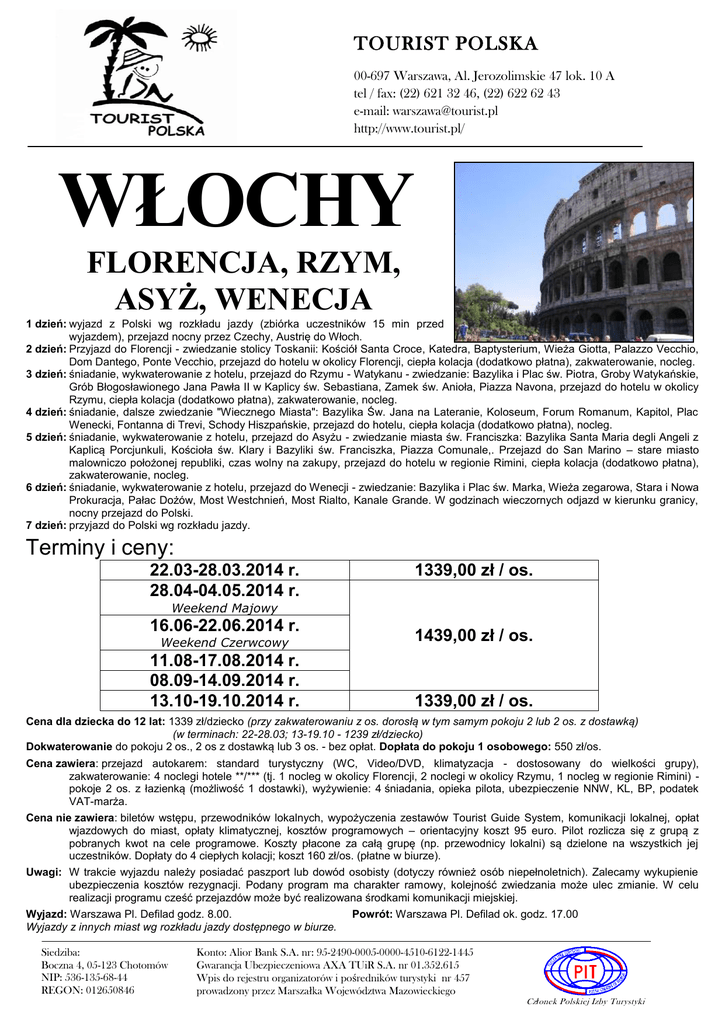 TOURIST POLSKA 00-697 Warszawa, Al. Jerozolimskie 47 lok. 10 A tel / fax: (22) 621 32 46, (22) 622 62 43 e-mail: [email protected] http://www.tourist.pl/ WŁOCHY FLORENCJA, RZYM, ASYŻ, WENECJA 1 dzień: wyjazd z Polski wg rozkładu jazdy (zbiórka uczestników 15 min przed wyjazdem), przejazd nocny przez Czechy, Austrię do Włoch. 2 dzień: Przyjazd do Florencji - zwiedzanie stolicy Toskanii: Kościół Santa Croce, Katedra, Baptysterium, Wieża Giotta, Palazzo Vecchio, Dom Dantego, Ponte Vecchio, przejazd do hotelu w okolicy Florencji, ciepła kolacja (dodatkowo płatna), zakwaterowanie, nocleg. 3 dzień: śniadanie, wykwaterowanie z hotelu, przejazd do Rzymu - Watykanu - zwiedzanie: Bazylika i Plac św. Piotra, Groby Watykańskie, Grób Błogosławionego Jana Pawła II w Kaplicy św. Sebastiana, Zamek św. Anioła, Piazza Navona, przejazd do hotelu w okolicy Rzymu, ciepła kolacja (dodatkowo płatna), zakwaterowanie, nocleg. 4 dzień: śniadanie, dalsze zwiedzanie "Wiecznego Miasta": Bazylika Św. Jana na Lateranie, Koloseum, Forum Romanum, Kapitol, Plac Wenecki, Fontanna di Trevi, Schody Hiszpańskie, przejazd do hotelu, ciepła kolacja (dodatkowo płatna), nocleg. 5 dzień: śniadanie, wykwaterowanie z hotelu, przejazd do Asyżu - zwiedzanie miasta św. Franciszka: Bazylika Santa Maria degli Angeli z Kaplicą Porcjunkuli, Kościoła św. Klary i Bazyliki św. Franciszka, Piazza Comunale,. Przejazd do San Marino – stare miasto malowniczo położonej republiki, czas wolny na zakupy, przejazd do hotelu w regionie Rimini, ciepła kolacja (dodatkowo płatna), zakwaterowanie, nocleg. 6 dzień: śniadanie, wykwaterowanie z hotelu, przejazd do Wenecji - zwiedzanie: Bazylika i Plac św. Marka, Wieża zegarowa, Stara i Nowa Prokuracja, Pałac Dożów, Most Westchnień, Most Rialto, Kanale Grande. W godzinach wieczornych odjazd w kierunku granicy, nocny przejazd do Polski. 7 dzień: przyjazd do Polski wg rozkładu jazdy. Terminy i ceny: 22.03-28.03.2014 r. 28.04-04.05.2014 r. 1339,00 zł / os. Weekend Majowy 16.06-22.06.2014 r. Weekend Czerwcowy 1439,00 zł / os. 11.08-17.08.2014 r. 08.09-14.09.2014 r. 13.10-19.10.2014 r. 1339,00 zł / os. Cena dla dziecka do 12 lat: 1339 zł/dziecko (przy zakwaterowaniu z os. dorosłą w tym samym pokoju 2 lub 2 os. z dostawką) (w terminach: 22-28.03; 13-19.10 - 1239 zł/dziecko) Dokwaterowanie do pokoju 2 os., 2 os z dostawką lub 3 os. - bez opłat. Dopłata do pokoju 1 osobowego: 550 zł/os. Cena zawiera: przejazd autokarem: standard turystyczny (WC, Video/DVD, klimatyzacja - dostosowany do wielkości grupy), zakwaterowanie: 4 noclegi hotele **/*** (tj. 1 nocleg w okolicy Florencji, 2 noclegi w okolicy Rzymu, 1 nocleg w regionie Rimini) pokoje 2 os. z łazienką (możliwość 1 dostawki), wyżywienie: 4 śniadania, opieka pilota, ubezpieczenie NNW, KL, BP, podatek VAT-marża. Cena nie zawiera: biletów wstępu, przewodników lokalnych, wypożyczenia zestawów Tourist Guide System, komunikacji lokalnej, opłat wjazdowych do miast, opłaty klimatycznej, kosztów programowych – orientacyjny koszt 95 euro. Pilot rozlicza się z grupą z pobranych kwot na cele programowe. Koszty płacone za całą grupę (np. przewodnicy lokalni) są dzielone na wszystkich jej uczestników. Dopłaty do 4 ciepłych kolacji; koszt 160 zł/os. (płatne w biurze). Uwagi: W trakcie wyjazdu należy posiadać paszport lub dowód osobisty (dotyczy również osób niepełnoletnich). Zalecamy wykupienie ubezpieczenia kosztów rezygnacji. Podany program ma charakter ramowy, kolejność zwiedzania może ulec zmianie. W celu realizacji programu cześć przejazdów może być realizowana środkami komunikacji miejskiej. Wyjazd: Warszawa Pl. Defilad godz. 8.00. Wyjazdy z innych miast wg rozkładu jazdy dostępnego w biurze. Siedziba: Boczna 4, 05-123 Chotomów NIP: 536-135-68-44 REGON: 012650846 Powrót: Warszawa Pl. Defilad ok. godz. 17.00 Konto: Alior Bank S.A. nr: 95-2490-0005-0000-4510-6122-1445 Gwarancja Ubezpieczeniowa AXA TUiR S.A. nr 01.352.615 Wpis do rejestru organizatorów i pośredników turystyki nr 457 prowadzony przez Marszałka Województwa Mazowieckiego Cz ł onek Polskiej Izby Turystyki