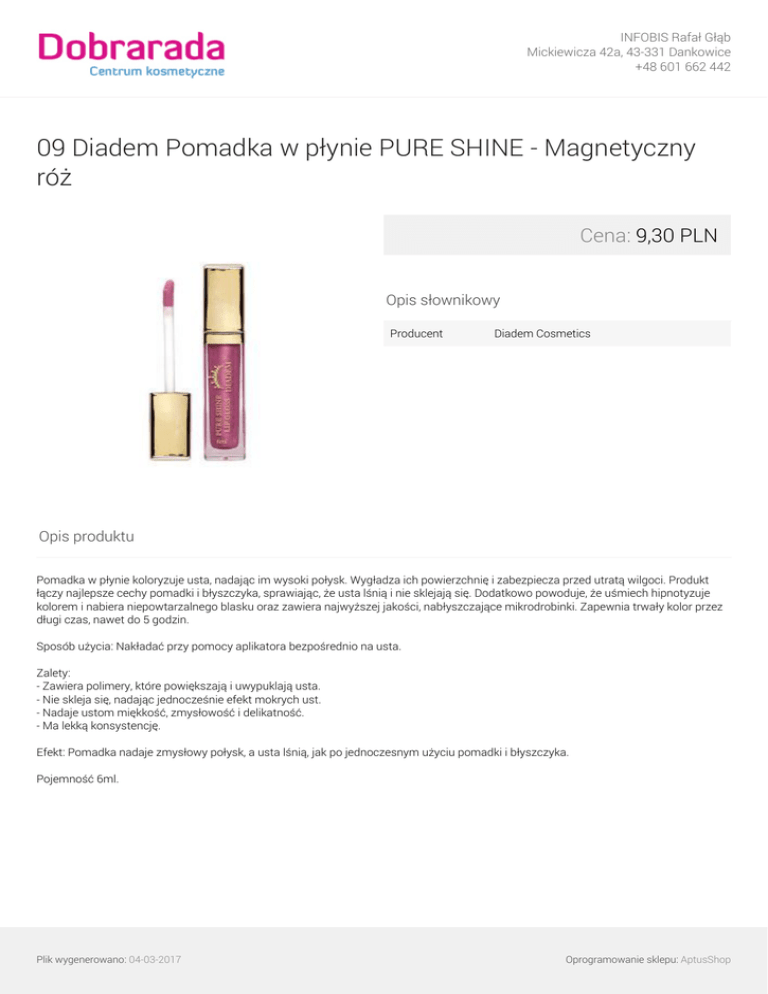 INFOBIS Rafał Głąb Mickiewicza 42a, 43-331 Dankowice +48 601 662 442 09 Diadem Pomadka w płynie PURE SHINE - Magnetyczny róż Cena: 9,30 PLN Opis słownikowy Producent Diadem Cosmetics Opis produktu Pomadka w płynie koloryzuje usta, nadając im wysoki połysk. Wygładza ich powierzchnię i zabezpiecza przed utratą wilgoci. Produkt łączy najlepsze cechy pomadki i błyszczyka, sprawiając, że usta lśnią i nie sklejają się. Dodatkowo powoduje, że uśmiech hipnotyzuje kolorem i nabiera niepowtarzalnego blasku oraz zawiera najwyższej jakości, nabłyszczające mikrodrobinki. Zapewnia trwały kolor przez długi czas, nawet do 5 godzin. Sposób użycia: Nakładać przy pomocy aplikatora bezpośrednio na usta. Zalety: - Zawiera polimery, które powiększają i uwypuklają usta. - Nie skleja się, nadając jednocześnie efekt mokrych ust. - Nadaje ustom miękkość, zmysłowość i delikatność. - Ma lekką konsystencję. Efekt: Pomadka nadaje zmysłowy połysk, a usta lśnią, jak po jednoczesnym użyciu pomadki i błyszczyka. Pojemność 6ml. Plik wygenerowano: 04-03-2017 Oprogramowanie sklepu: AptusShop INFOBIS Rafał Głąb Mickiewicza 42a, 43-331 Dankowice +48 601 662 442 Galeria Plik wygenerowano: 04-03-2017 Powered by TCPDF (www.tcpdf.org) Oprogramowanie sklepu: AptusShop