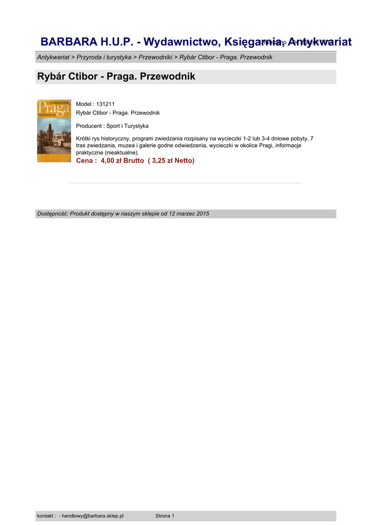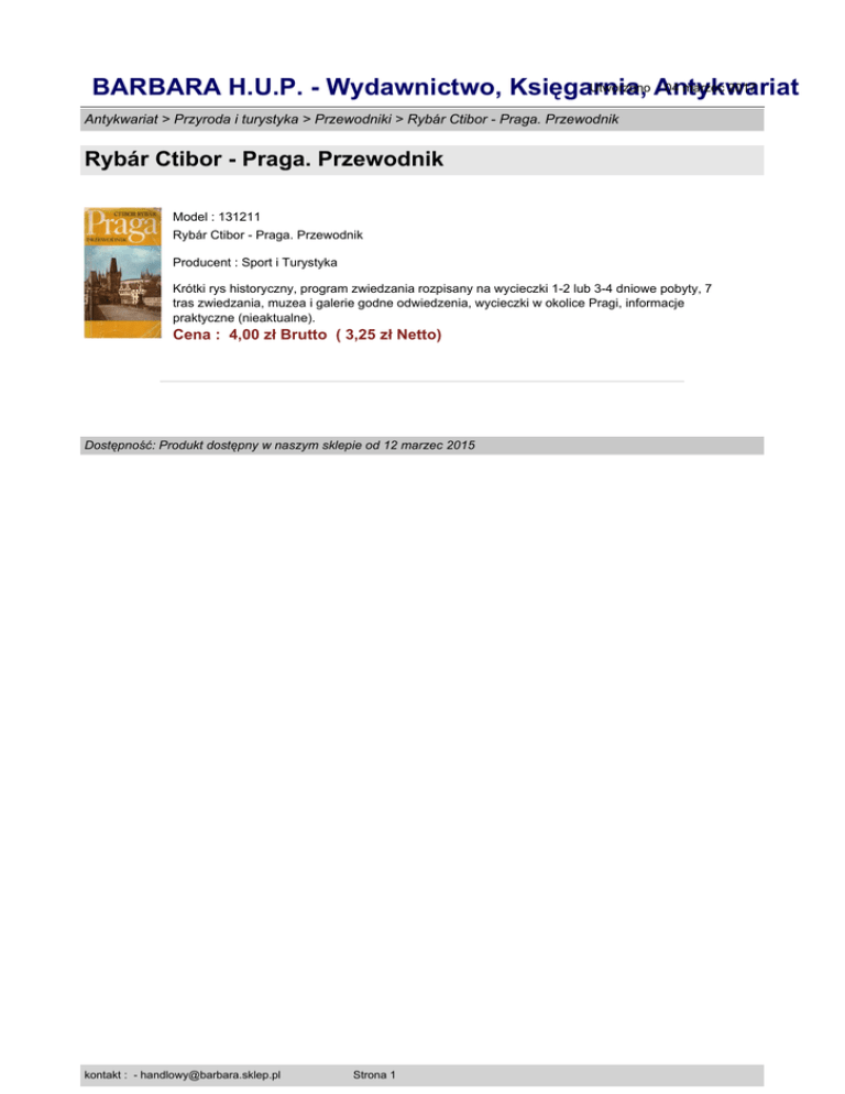 Utworzono Antykwariat : 04 marzec 2017 BARBARA H.U.P. - Wydawnictwo, Księgarnia, Antykwariat > Przyroda i turystyka > Przewodniki > Rybár Ctibor - Praga. Przewodnik Rybár Ctibor - Praga. Przewodnik Model : 131211 Rybár Ctibor - Praga. Przewodnik Producent : Sport i Turystyka Krótki rys historyczny, program zwiedzania rozpisany na wycieczki 1-2 lub 3-4 dniowe pobyty, 7 tras zwiedzania, muzea i galerie godne odwiedzenia, wycieczki w okolice Pragi, informacje praktyczne (nieaktualne). Cena : 4,00 zł Brutto ( 3,25 zł Netto) Dostępność: Produkt dostępny w naszym sklepie od 12 marzec 2015 kontakt : - [email protected] Strona 1