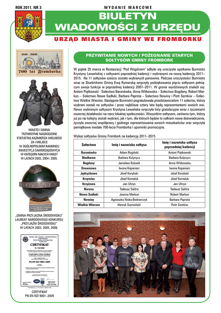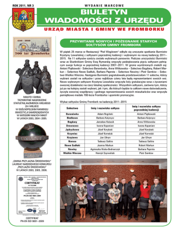 ROK 2011, NR 3 WYDANIE MARCOWE BIULETYN WIADOMOŚCI Z URZĘDU URZĄD MIASTA I GMINY WE FROMBORKU PRZYWITANIE NOWYCH I POŻEGNANIE STARYCH SOŁTYSÓW GMINY FROMBORK MIASTO I GMINA TRZYKROTNIE NAGRODZONE STATUETKĄ KAZIMIERZA WIELKIEGO ZA I MIEJSCE W OGÓLNOPOLSKIM RANKINGU INWESTYCJI SAMORZĄDOWYCH W KATEGORII MAŁYCH MIAST W LATACH 2003, 2004 i 2005. „GMINA PRZYJAZNA ŚRODOWISKU” LAUREAT NARODOWEGO KONKURSU „PRZYJAŹNI ŚRODOWISKU” W LATACH 2003, 2005, 2006. CERTYFIKAT PN-EN ISO 9001–2009 W piątek 25 marca w Restauracji "Pod Wzgórzem" odbyło się uroczyste spotkanie Burmistrz Krystyny Lewańskiej z sołtysami poprzedniej kadencji i wybranymi na nową kadencję 2011– 2015. Na 11 sołtysów sześciu zostało wybranych ponownie. Podczas uroczystości Burmistrz wraz ze Skarbnikiem Gminy Ewą Rymarską wręczyły podziękowania pięciu sołtysom pełniącym swoje funkcje w poprzedniej kadencji 2007–2011. W gronie wyróżnionych znaleźli się: Antoni Piątkowski - Sołectwo Baranówka, Anna Witkowska – Sołectwo Bogdany, Robert Markun – Sołectwo Nowe Sadłuki, Barbara Paprota – Sołectwo Nowiny i Piotr Semkiw – Sołectwo Wielkie Wierzno. Następnie Burmistrz pogratulowała przedstawicielom 11 sołectw, którzy wybrani zostali na sołtysów i przez najbliższe cztery lata będą reprezentantami swoich wsi. Nowo wybranym sołtysom Krystyna Lewańska wręczyła listy gratulacyjne wraz z życzeniami owocnej działalności na rzecz lokalnej społeczności. Wszystkim sołtysom, zarówno tym, którzy już po raz kolejny zostali wybrani, jak i tym, dla których będzie to całkiem nowe doświadczenie, życzyła owocnej współpracy i godnego reprezentowania swoich mieszkańców oraz wręczyła pamiątkowe medale 700-lecia Fromborka i upominki promocyjne. Wykaz sołtysów Gminy Frombork na kadencję 2011–2015 Imię i nazwisko sołtysa Imię i nazwisko sołtysa poprzedniej kadencji Baranówka Adam Rogiński Antoni Piątkowski Biedkowo Barbara Kulynycz Barbara Kulynycz Bogdany Jarosław Kożusik Anna Witkowska Drewnowo Iwona Kopaniarz Iwona Kopaniarz Sołectwo Jędrychowo Józef Korybski Józef Korybski Krzywiec Józef Korneluk Józef Korneluk Krzyżewo Jan Uhryn Jan Uhryn Narusa Tadeusz Salitra Tadeusz Salitra Nowe Sadłuki Joanna Markun Robert Markun Nowiny Agnieszka Niska-Bednarczyk Barbara Paprota Wielkie Wierzno Henryk Szyrwiński Piotr Semkiw BURMISTRZ MIASTA I GMINY FROMBORK KRYSTYNA LEWAŃSKA KONTYNUUJE PROGRAM ROZWOJU GMINY KU LEPSZEJ PRZYSZŁOŚCI Minęła zima. Nie była ona łatwa dla nas wszystkich. Po raz pierwszy wywoziliśmy z miasta śnieg. Przy gwałtownej odwilży zapobiegło to dewastacji ulic i chodników oraz zalaniu budynków w dolnej części miasta. Zima to okres chłodny ze względu na klimat. Za to bardzo gorący i owocny dla Burmistrza i pracowników Urzędu Miasta i Gminy. Minęły 3 miesiące od wyborów, a ja mogę już poinformować mieszkańców o postępach w zadaniach podjętych lub kontynuowanych i wdrażanych, które w niedługim czasie będą zrealizowane. Między innymi na rzecz poprawy warunków życia ludności zaowocują remontem ulicy Krzywej. W trakcie remontu wykonana zostanie nawierzchnia asfaltowa na podbudowie z kruszywa łamanego oraz chodniki z kostki betonowej wraz ze zjazdami do posesji i poprawiona zostanie kanalizacja deszczowa. Obecnie wykonana jest dokumentacja projektowo-kosztorysowa i trwają przygotowania do ogłoszenia przetargu na wykonawcę. Koszt inwestycji wg kosztorysu to 696 tys. zł. Zadanie wykonane zostanie ze środków własnych w bieżącym roku. W dniu 24 stycznia 2011 r. złożyliśmy do Urzędu Marszałkowskiego w Olsztynie wniosek o przyznanie dofinansowania budowy wodociągu na odcinku Jędrychowo-Baranówka. Celem budowy wodociągu jest podłączenie sieci wodociągowej w Baranówce do instalacji sieci wodociągowej w Jędrychowie, co zapewni mieszkańcom gminy zaopatrzenie w dobrej jakości wodę z ujęcia w Krzyżewie. Całkowity koszt zadania wynosi 1 mln 242 tys. zł., zaś dofinansowanie 757 tys. zł. Termin zakończenia budowy zaplanowano na grudzień 2011 r. Wniosek oczekuje na rozpatrzenie w Departamencie Rozwoju Obszarów Wiejskich i Rolnictwa Urzędu Marszałkowskiego w Olsztynie. Rozpoczęto działania mające na celu poprawienie infrastruktury na Osiedlu Słonecznym. Na dzień dzisiejszy został rozstrzygnięty przetarg na wykonanie projektu technicznego i dokumentacji kosztorysowej na zagospodarowanie infrastruktury i jest sporządzana wyżej wymieniona dokumentacja. Po jej wykonaniu przystąpimy do wyłonienia w przetargu wykonawcy. W ramach inwestycji wykonany zostanie remont nawierzchni dróg wraz z chodnikami na całym Osiedlu Słonecznym, dojazdy do budynków, tam gdzie grunt jest własnością gminy, kanalizacja deszczowa, miejsca postojowe (parkingi) oraz oświetlenie uliczne. W ramach rozwoju kultury fizycznej oraz tworzenia warunków do atrakcyjnego spędzania czasu wolnego przez młodzież i dzieci podjęto działania związane z rozbudową i budową obiektów sportowych. W dniu 11 stycznia 2011 r. w Urzędzie Marszałkowskim w Olsztynie wraz z Panią Ewą Rymarską – Skarbnikiem Gminy podpisałam umowę na dofinansowanie I etapu przebudowy stadionu miejskiego. Celem zadania jest wymiana trybun na istniejącym stadionie. Projekt zakłada rozebranie istniejących i postawienie nowych na gotowej konstrukcji stalowej na 194 miejsca, wykonanie brukowej podbudowy pod trybuny oraz dojścia do nich i wyposażenie obiektu w dodatkowe dla zawodników i trenerów po przeciwległej stronie boiska i kortach tenisowych. Całkowity koszt zadania wyniesie 210 tys. zł. W tym dofinansowanie na kwotę 129 tys. termin zakończenia to lato 2011 r. Został ogłoszony przetarg na wykonawstwo. Gmina Frombork jest jednym z 38 beneficjantów w woj. warmińsko-mazurskim, którzy będą budować w 2011 r. „Orlika”. W dniu 22.02.2011 r. Sejmik Województwa Warmińsko-Mazurskiego podjął uchwałę 