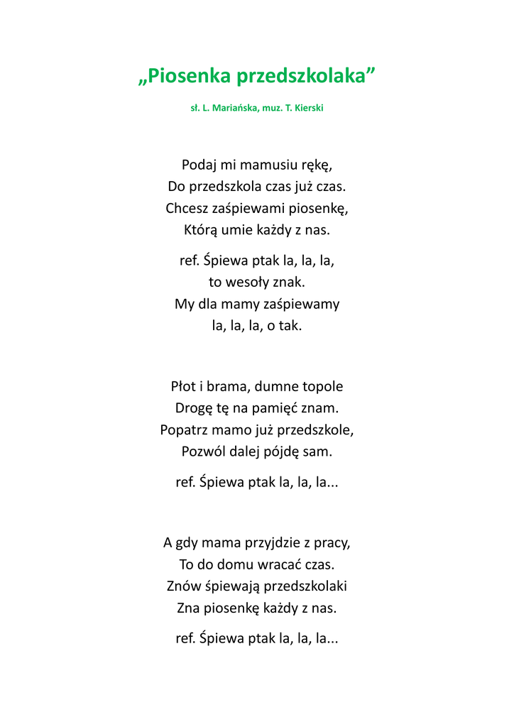 „Piosenka przedszkolaka” sł. L. Mariańska, muz. T. Kierski Podaj mi mamusiu rękę, Do przedszkola czas już czas. Chcesz zaśpiewami piosenkę, Którą umie każdy z nas. ref. Śpiewa ptak la, la, la, to wesoły znak. My dla mamy zaśpiewamy la, la, la, o tak. Płot i brama, dumne topole Drogę tę na pamięć znam. Popatrz mamo już przedszkole, Pozwól dalej pójdę sam. ref. Śpiewa ptak la, la, la... A gdy mama przyjdzie z pracy, To do domu wracać czas. Znów śpiewają przedszkolaki Zna piosenkę każdy z nas. ref. Śpiewa ptak la, la, la... Porządek w naszej sali B. Forma 1. Piękna nasza sala, bardzo o nią dbamy i na swoje miejsca wszystko odkładamy. 2. Klocki do koszyka, kredki są w pudełkach. Siedzą lalki, misie równo na krzesełkach. 3. Bo przedszkolak zawsze o porządek dba, swoje obowiązki bardzo dobrze zna. Zamierzenia dydaktyczno – wychowawcze na miesiąc wrzesień „WIEWIÓRKI” 1. Współtworzenie przyjaznej atmosfery w grupie − przestrzeganie wspólnie ustalonych umów i zasad regulujących współżycie w grupie. Rozwijanie relacji pomiędzy dziećmi, opartych na wzajemnym szacunku i akceptacji − dostrzeganie potrzeb innych, szanowanie ich. Współdziałanie w grupie − uczestniczenie we wspólnych zabawach, np.: ruchowych. 2. Poznawanie swojego ciała poprzez zabawy: rysowanie siebie, dostrzeganie zmian zachodzących w swoim wyglądzie pod wpływem upływającego czasu, dostrzeganie swojej niepowtarzalności oraz niepowtarzalności innych, szanowanie jej. 3. Poznanie zasad bezpieczeństwa ,przestrzeganie ich − właściwe zachowywanie się w czasie korzystania ze środków transportu − poznawanie zasad ruchu drogowego dotyczących prawidłowego bezpiecznego poruszania się po ulicach i drogach. Uświadomienie niebezpieczeństw wynikających z nieprzestrzegania zakazów − poznawanie sytuacji zagrażających bezpieczeństwu: nieoddalanie się od rodziców (opiekunów) w miejscach publicznych. 4. Dostrzeganie zmian zachodzących jesienią w przyrodzie; rozwijanie umiejętności związanych z poznawaniem świata roślin i zwierząt.