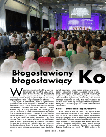 Błogosławiony błogosławiący W pewnym mieście wybuchł w nocy pożar. Zbiegło się mnóstwo ludzi. „W kościele to was nie ma, ale do pożaru to się wszyscy zbiegliście” – komentował miejscowy pastor. „Gdyby twój kościół płonął, też byśmy chętnie przychodzili” – odpowiedział ktoś z tłumu. Gdy byłem w seminarium, jeden z wykładowców powiedział, że Kościół to najbliższa Bożemu sercu część Królestwa Bożego. Słowo kościół pojawia się w Nowym Testamencie. Używał go Pan Jezus Chrystus: „Zbuduję Kościół mój, a bramy piekielne nie przemogą go” (Mt 16:18). A inny przekład (Nowe Przymierze) przytacza ten werset w brzmieniu: „Zbuduję mój Kościół i potęga śmierci nie zdoła go pokonać”. Ale musimy pamiętać, że słowo kościół nie zostało wymyślone przez Pana Jezusa. Było ono używane w kulturze greckiej i rzymskiej, a także funkcjonowało w kulturze hebrajskiej. Mówiąc, że zbuduje swój Kościół, Jezus użył znanego, bardzo treściwego słowa. W grece i łacinie to bardzo podobne słowo ekklesia, oznaczające osoby (a nie bu10 Ko dynki), powołane – albo inaczej mówiąc wywołane – spośród obywateli, mające najwyższą władzę w państwie, decydujące o polityce, sprawach wojskowych i sądowniczych. Gdy Jezus użył tego słowa, zapewne to właśnie miał na myśli i tak był zrozumiany. Użył bowiem znanego określenia, tak jakby dziś ktoś powiedział, że zbuduje swoją partię czy raczej powoła stowarzyszenie, którego nikt i nic nie pognębi. To dziś także jest aktualne i zrozumiałe. Kościół – ambasada Bożego Królestwa Jezus Chrystus powołał Kościół, aby był reprezentantem Bożego Królestwa w Jego mocy i autorytecie tutaj na ziemi. Jezus przez swoją śmierć, przez swoje zmartwychwstanie, przez wniebowstąpienie i przez zesłanie Ducha Świętego, powołał swój Kościół, jako unikalną formację, by teraz nadziemskie władze i zwierzchności w okręgach niebieskich przez Kościół poznały różnorodną Bożą mądrość. Kościół to ambasada Bożego Królestwa na ziemi. W Biblii czytamy, że SŁOWO i ŻYC IE n r 4/2014 fot. G. Piwowar DNA, czyli nośnik informacji genetycznej. Jaka musi być ta przekazywana z pokolenia na pokolenie informacja genetyczna Kościoła, reprezentującego Boże Królestwo na ziemi? Kościoła, który chce być nośnikiem sprawiedliwości, radości i pokoju? Po pierwsze, taki Kościół musi być skoncentrowany na Bogu, czyli na Ojcu, który jest Stworzycielem; skoncentrowany na Jezusie, który zbawia, uzdrawia i uwalnia. Skoncentrowany na Duchu Świętym, który przypomina, wprowadza we wszelką prawdę, uświęca i wyposaża w Jego dary oraz pozwala nam rodzić owoce Ducha Świętego. Kościół skoncentrowany na Bożym Słowie, które jest fundamentem wiary naszej. Jeśli my, jako Kościół, będziemy skoncentrowani na Bogu, to jednocześnie drugą składową naszego DNA będzie otwartość na każdego człowieka. Ponieważ Bóg „chce, aby wszyscy ludzie byli zbawieni” (1 Tm 2:4). Taki otwarty Kościół będzie wielopokoleniowy, gdzie wszystkie generacje szanują się nawzajem i wspierają. To Kościół, w którym zamiast konfliktu pokoleń jest sztafeta pokoleń, niosąca przesłanie, że „tak Bóg umiłował świat, że Syna swego jednorodzonego dał, aby każdy, kto weń wierzy, nie zginął, ale miał żywot wieczny” (J 3:16). Szpital albo lotnisko ościół „Królestwo Boże [...] to sprawiedliwość i pokój, i radość w Duchu Świętym (Rz 14:17). I dlatego właśnie Kościół ma być tutaj, na ziemi, ambasadą sprawiedliwości, pokoju i radości, płynącej z inspiracji Ducha Świętego. Kościół, czyli ludzie, którzy są oddani Chrystusowi i służący ludziom. Inaczej mówiąc, Kościół, który jest błogosławiony i błogosławiący zarazem. Ktoś ujął to tak: Kościół to nigdy miejsce – zawsze ludzie, nigdy zagroda – zawsze stado, nigdy poświęcony budynek – zawsze zgromadzenie wierzących. Kościół to ludzie, którzy się modlą, a nie miejsce, gdzie to robią. Kompozycja kamieni i cegieł jest dla Kościoła niczym więcej niż dla ciebie ubranie, które nosisz. Mówiąc krótko, Jezus nie umarł za budynek. On umarł za ciebie i za mnie. On umarł za ludzi i to ludzie, przyjmując Jego przebaczenie na Jego warunkach, tworzą Kościół. Duchowe DNA Jednak Kościół, który chce być reprezentantem Królestwa Bożego na ziemi, musi mieć odpowiednie Jeśli Kościół jest skoncentrowany na Bogu i otwarty na ludzi to trzecią składową jego DNA będzie gotowość do wyzwań. Bo wszystko możemy w Tym, który nas wzmacnia, w Chrystusie (Flp 4:13), „wszystko jest możliwe dla wierzącego” (Mk 9:23). Z naszym Bogiem przeskakujemy każdy mur i pokonujemy każdą przeszkodę, gdyż Ten, który jest w nas, większy jest, aniżeli ten, który jest na świecie’ (1 J 4:4). Bo – jak śpiewamy: „Nie ma problemu, by On rozwiązać nie mógł, góry wysokiej, by On przesunąć nie mógł... Skoro poniósł On na barkach swych ciężary świata, wiem, że On poradzi i twym”. W Biblii nie czytamy, że trzeba mieć wiarę jak góra, żeby przesunąć ziarno gorczycy, ale że wystarczy wiara jak ziarnko gorczycy, aby przesunąć górę (Mt 17:20). Raz jeszcze przypomnę: „Wszystko mogę w Tym, który mnie wzmacnia, w Chrystusie” (Flp 4:13). Ktoś powiedział, że są dwa rodzaje Kościołów: szpital albo lotnisko. Niewielu z nas lubi szpital, tam nie ma zbyt dobrej atmosfery. Ja wiem, że są one potrzebne, ale myślę, że nikt z nas nie chciałby tam trafić – chyba, że do pracy. Osobiście wolę Kościoły-lotniska, na których się ląduje, by zatankować, oczyścić, zreperować, wyposażyć i ruszyć dalej, do odległych miejsc z Dobrą Nowiną. Bo nie ma lepszej nowiny od Dobrej Nowiny, a – jak śpiewamy – „wiele jest serc, które czekają na Ewangelię”. Hojność w mi