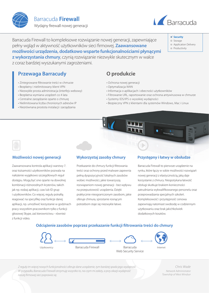 Wydajny firewall nowej generacji Security Storage Application Delivery Productivity Barracuda Firewall to kompleksowe rozwiązanie nowej generacji, zapewniające pełny wgląd w aktywność użytkowników sieci firmowej. Zaawansowane możliwości urządzenia, dodatkowo wsparte funkcjonalnościami płynącymi z wykorzystania chmury, czynią rozwiązanie niezwykle skutecznym w walce z coraz bardziej wyszukanymi zagrożeniami. Przewaga Barracudy O produkcie • Zintegrowane filtrowanie treści w chmurze • Bezpłatny i nielimitowany klient VPN • Niezwykle prosta administracja (interfejs webowy) • Bezpłatna wymiana urządzeń co 4 lata • Centralne zarządzanie oparte o chmurę • Nielimitowana liczba chronionych adresów IP • Niezrównana prostota instalacji i zarządzania • Ochrona nowej generacji • Optymalizacja WAN • Informacja o aplikacjach i obecności użytkowników • Filtrowanie URL, raportowanie oraz ochrona antywirusowa w chmurze • Systemy IDS/IPS o wysokiej wydajności • Bezpieczny VPN z klientami dla systemów Windows, Mac i Linux Możliwości nowej generacji Wykorzystaj zasoby chmury Przystępny i łatwy w obsłudze Zaawansowana kontrola aplikacji warstwy 7. Przekazanie do chmury funkcji filtrowania Barracuda Firewall to pierwsze urządzenie na oraz tożsamości użytkowników pozwala na treści oraz ochrony przed malware zapewnia rynku, które łączy w sobie możliwości rozwiązań nałożenie wyjątkowo szczegółowych reguł pełną dyspozycyjność lokalnych zasobów nowej generacji z elastycznością, jaką daje dostępu. Mogą być one oparte na dowolnej wobec możliwości, jakie towarzyszą korzystanie z chmury. Niespotykana łatwość kombinacji różnorodnych kryteriów, takich rozwiązaniom nowej generacji - bez wpływu obsługi skutkuje brakiem konieczności jak np. rodzaj aplikacji, czas lub ID grup na przepustowość urządzenia. Dzięki zatrudniania wykwalifikowanego personelu oraz i użytkowników. Co więcej, reguły potrafią praktycznie nieograniczonym zasobom, jakie przeprowadzania specjalnych szkoleń. reagować na specyfikę oraz funkcje danej oferuje chmura, sprostanie rosnącym Kompleksowość i przystępność cenowa aplikacji, np. umożliwić korzystanie w godzinach potrzebom staje się niezwykle łatwe. zapewniają natomiast swobodę w codziennym pracy wszystkim pracownikom tylko z funkcji użytkowaniu oraz brak jakichkolwiek głosowej Skype, zaś kierownictwu - również dodatkowych kosztów. z funkcji video. Odciążenie zasobów poprzez przekazanie funkcji filtrowania treści do chmury Użytkownicy Barracuda Firewall Barracuda Web Security Service Z reguły im więcej nowych funkcjonalności oferuje dane urządzenie, tym bardziej spada jego wydajność. W przypadku Barracuda Firewall otrzymuję wszystko to, na czym mi zależy, a przy okazji wydajność naszej firmowej sieci poprawia się. Internet Chris Wade Network Administrator Township of West Windsor Barracuda Networks Barracuda Firewall: wydajny firewall nowej generacji Specyfikacja techniczna Firewall Usługi infrastruktury • • • • • • • • • • • • • • • • • • • Stateful packet forwarding Kontrola użytkowników Intrusion Prevention (IPS) Rozszerzona kontrola aplikacji (podkategorie) Ochrona przed atakami DoS/DDoS NAT, PAT Zestawy reguł opartych na obiektach Dynamiczne reguły Reguły oparte na użytkownikach i grupach High Availability ARP security Mostkowanie Wsparcie dla Jumbo frame Zarządzanie użytkownikami • • • • • Agent serwera terminali Agent SSO Wsparcie dla użytkowników i grup Portal autoryzacji użytkowników Uwierzytelnianie – wsparcie dla NTLM, RADIUS, LDAP/LDAPS, Active Directory, uwierzytelnianie lokalne • Uwierzytelnianie dla AD i LDAP PORÓWNANIE MODELI POJEMNOŚĆ Przepustowość Firewalla 1 Przepustowość VPN 2 Przepustowość IPS Liczba jednoczesnych sesji Nowe sesje (na sekundę) Zalecana liczba użytk. dla kontroli aplikacji Zalecana liczba użytkowników dla kontroli aplikacji i IPS Zalecana liczba użytkowników dla kontroli aplikacji, IPS i modułu Web Security SPRZĘT Wielkość urządzenia Wymiary (cm) Waga (kg) Porty Ethernet Zasilanie Zintegrowany punkt dostępu Wi-Fi Modem 3G USB FUNKCJE Firewall IPsec VPN (Client-to-site & site-to-site) Kontrola i monitoring aplikacji IPS High Availability Inspekcja SSL 3, 4 Serwer DHCP DNS Cache Autorytatywny DNS SIP Proxy Automatic Uplink Failover Uplink Balancing Zarządzanie i optymalizacja ruchu SSL VPN Web Security (filtrowanie URL, antywirus) Centralne zarządzanie 1 2 Dla ruchu UDP; duże pakiety Szyfrowanie AES; MD5 3 4 Wi-Fi (w wybranych modelach) • Punkt dostępu Wi-Fi (802.11n) • Obsługa do 3 niezależnych sieci bezprzewodowych • Panel autoryzacji dla gości Serwer DHCP HTTP proxy SIP proxy DNS cache Autorytatywny DNS Wsparcie SNMP Opcje wsparcia Barracuda Energize Updates • • • • Zarządzanie ruchem • • • • • Monitoring i agregacja łącz Reguły routingu Kształtowanie ruchu (QoS) 7 predefiniowanych grup kształtowania ruchu Weryfikacja przekierowań po ICMP Aktualizacje firmware Aktualizacje sygnatur IPS Aktualizacje funkcji kontroli aplikacji Standardowe wsparcie techniczne dystrybutora oraz producenta Instant Replacement • Jednostka zastępcza wysyłana następnego dnia roboczego VPN • Dodatkowe telefoniczne wsparcie techniczne producenta 24/7 • Bezpłatna wymiana sprzętu na nowy po czterech latach • Nieograniczona ilość licencji VPN (Site-to-site oraz Client-to-site) • Nielimitowany SSL VPN • certyfikat VPNC (podstawowa interoperacyjność) • Wsparcie IPsec oraz PPTP • Wsparcie AES-128/256, 3DES, DES, null • Klienty VPN dla systemów Windows, Mac, Linux Opcje zabezpieczenia Barracuda Web Security • Obsługa VPN dla urządzeń mobilnych (iOS/Android) • Licencja na 1 rok, 3 lub 5 lat • Web Filter wykorzystujący kategorie (online/local) • Ochrona antywirusowa (online/local) X100 X20