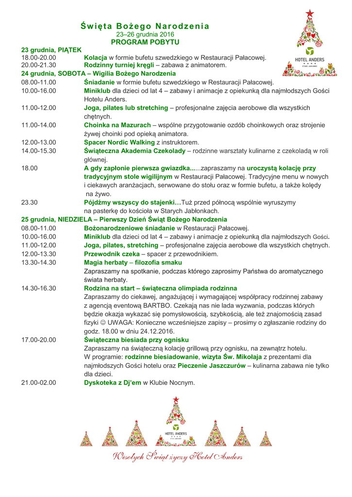 Święta Bożego Narodzenia 23–26 grudnia 2016 PROGRAM POBYTU 23 grudnia, PIĄTEK 18.00-20.00 Kolacja w formie bufetu szwedzkiego w Restauracji Pałacowej. 20.00-21.30 Rodzinny turniej kręgli – zabawa z animatorem. 24 grudnia, SOBOTA – Wigilia Bożego Narodzenia 08.00-11.00 Śniadanie w formie bufetu szwedzkiego w Restauracji Pałacowej. 10.00-16.00 Miniklub dla dzieci od lat 4 – zabawy i animacje z opiekunką dla najmłodszych Gości Hotelu Anders. 11.00-12.00 Joga, pilates lub stretching – profesjonalne zajęcia aerobowe dla wszystkich chętnych. 11.00-14.00 Choinka na Mazurach – wspólne przygotowanie ozdób choinkowych oraz strojenie żywej choinki pod opieką animatora. 12.00-13.00 Spacer Nordic Walking z instruktorem. 14.00-15.30 Świąteczna Akademia Czekolady – rodzinne warsztaty kulinarne z czekoladą w roli głównej. 18.00 A gdy zapłonie pierwsza gwiazdka......zapraszamy na uroczystą kolację przy tradycyjnym stole wigilijnym w Restauracji Pałacowej. Tradycyjne menu w nowych i ciekawych aranżacjach, serwowane do stołu oraz w formie bufetu, a także kolędy na żywo. 23.30 Pójdźmy wszyscy do stajenki…Tuż przed północą wspólnie wyruszymy na pasterkę do kościoła w Starych Jabłonkach. 25 grudnia, NIEDZIELA – Pierwszy Dzień Świąt Bożego Narodzenia 08.00-11.00 Bożonarodzeniowe śniadanie w Restauracji Pałacowej. 10.00-16.00 Miniklub dla dzieci od lat 4 – zabawy i animacje z opiekunką dla najmłodszych Gości. 11.00-12.00 Joga, pilates, stretching – profesjonalne zajęcia aerobowe dla wszystkich chętnych. 12.00-13.30 Przewodnik czeka – spacer z przewodnikiem. 13.30-14.30 Magia herbaty – filozofia smaku Zapraszamy na spotkanie, podczas którego zaprosimy Państwa do aromatycznego świata herbaty. 14.30-16.30 Rodzina na start – świąteczna olimpiada rodzinna Zapraszamy do ciekawej, angażującej i wymagającej współpracy rodzinnej zabawy z agencją eventową BARTBO. Czekają nas nie lada wyzwania, podczas których będzie okazja wykazać się pomysłowością, szybkością, ale też znajomością zasad fizyki UWAGA: Konieczne wcześniejsze zapisy – prosimy o zgłaszanie rodziny do godz. 18.00 w dniu 24.12.2016. 17.00-20.00 Świąteczna biesiada przy ognisku Zapraszamy na świąteczną kolację grillową przy ognisku, na zewnątrz hotelu. W programie: rodzinne biesiadowanie, wizyta Św. Mikołaja z prezentami dla najmłodszych Gości hotelu oraz Pieczenie Jaszczurów – kulinarna zabawa nie tylko dla dzieci. 21.00-02.00 Dyskoteka z Dj’em w Klubie Nocnym. 26 grudnia, PONIEDZIAŁEK – Drugi Dzień Świąt Bożego Narodzenia 08.00-11.00 Świąteczne śniadanie w Restauracji Pałacowej. 10.00-15.00 Miniklub dla dzieci od lat 4 – zabawy i animacje z opiekunką dla najmłodszych Gości Hotelu Anders. 11.00-12.00 Joga, pilates lub stretching – profesjonalne zajęcia aerobowe dla wszystkich chętnych. 13.00-15.00 Obiad Warmiński w formie bufetu szwedzkiego w Restauracji Pałacowej. Program może ulec zmianie z powodu warunków pogodowych lub innych, niezależnych od hotelu przyczyn. O zmianach poinformujemy na tablicy w holu przy Recepcji. Zapraszamy do skorzystania z atrakcji dodatkowych, AKTYWNIE NA MAZURACH! W cenie pobytu: Udział w ww. punktach programu animacyjnego. Basen – czynny 7:00-21:00. Świat Mazurskich Saun – sauna sucha, parowa i infrasauna (sauna na podczerwień), czynne codziennie 08:30-21:00. Pokój Zabaw z Małpim Gajem dla dzieci – zabawa pod opieką dorosłych, Sala Kręgielni, poziom -1. Książki dla dzieci i dorosłych oraz gry planszowe – do wypożyczenia w Recepcji. Siłownia – Sala Kręgielni, poziom -1, czynna 11:00-23:00. Stół do ping-ponga – Sala Kongresowa III. Kije do Nordic Walking – do wypożyczenia w Recepcji NaturalSpa. Internet: bezprzewodowa sieć WiFi (bezpłatna) na terenie całego hotelu oraz komputery z dostępem do Internetu w holu Recepcji. Płatne dodatkowo: Kręgielnia – 50 zł/godz./tor, poziom -1 (11:00-22:00). Prosimy o wcześniejszą rezerwację torów. Squash / Badminton – 30 zł/godz. (wypożyczenie rakiet i piłeczek wliczone w cenę wynajmu), Sala Kręgielni, poziom -1 (11.00 – 22.00). Bilard / Piłkarzyki – 5 zł/żeton. Sala Kręgielni, poziom -1 (11:00-23:00). Zabiegi SPA w Centrum Zdrowia i Urody NaturalSPA. Zapraszamy do rezerwacji zabiegów SPA pod nr tel. 640. Godziny otwarcia NaturalSPA: 23 grudnia: 09.00-20.00 25 grudnia: 10.00-20.00 24 grudnia: 09.00-17.00 26 grudnia: 09.00-20.00