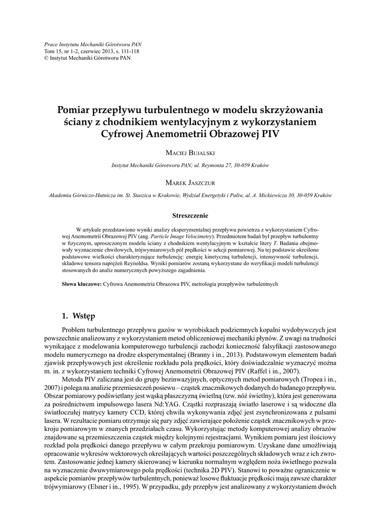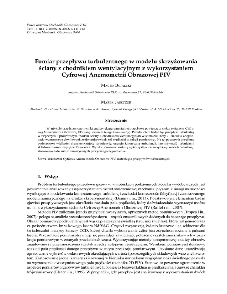 Prace Instytutu Mechaniki Górotworu PAN Tom 15, nr 1-2, czerwiec 2013, s. 111-118 © Instytut Mechaniki Górotworu PAN Pomiar przepływu turbulentnego w modelu skrzyżowania ściany z chodnikiem wentylacyjnym z wykorzystaniem Cyfrowej Anemometrii Obrazowej PIV MACIEJ BUJALSKI Instytut Mechaniki Górotworu PAN; ul. Reymonta 27, 30-059 Kraków MAREK JASZCZUR Akademia Górniczo-Hutnicza im. St. Staszica w Krakowie, Wydział Energetyki i Paliw, al. A. Mickiewicza 30, 30-059 Kraków Streszczenie W artykule przedstawiono wyniki analizy eksperymentalnej przepływu powietrza z wykorzystaniem Cyfrowej Anemometrii Obrazowej PIV (ang. Particle Image Velocimetry). Przedmiotem badań był przepływ turbulentny w fizycznym, uproszczonym modelu ściany z chodnikiem wentylacyjnym w kształcie litery T. Badania obejmowały wyznaczenie chwilowych, trójwymiarowych pól prędkości w sekcji pomiarowej. Na tej podstawie określono podstawowe wielkości charakteryzujące turbulencję: energię kinetyczną turbulencji, intensywność turbulencji, składowe tensora naprężeń Reynoldsa. Wyniki pomiarów zostaną wykorzystane do weryfikacji modeli turbulencji stosowanych do analiz numerycznych powyższego zagadnienia. Słowa kluczowe: Cyfrowa Anemometria Obrazowa PIV, metrologia przepływów turbulentnych 1. Wstęp Problem turbulentnego przepływu gazów w wyrobiskach podziemnych kopalni wydobywczych jest powszechnie analizowany z wykorzystaniem metod obliczeniowej mechaniki płynów. Z uwagi na trudności wynikające z modelowania komputerowego turbulencji zachodzi konieczność falsyfikacji zastosowanego modelu numerycznego na drodze eksperymentalnej (Branny i in., 2013). Podstawowym elementem badań zjawisk przepływowych jest określenie rozkładu pola prędkości, który doświadczalnie wyznaczyć można m. in. z wykorzystaniem techniki Cyfrowej Anemometrii Obrazowej PIV (Raffel i in., 2007). Metoda PIV zaliczana jest do grupy bezinwazyjnych, optycznych metod pomiarowych (Tropea i in., 2007) i polega na analizie przemieszczeń posiewu – cząstek znacznikowych dodanych do badanego przepływu. Obszar pomiarowy podświetlany jest wąską płaszczyzną świetlną (tzw. nóż świetlny), która jest generowana za pośrednictwem impulsowego lasera Nd:YAG. Cząstki rozpraszają światło laserowe i są widoczne dla światłoczułej matrycy kamery CCD, której chwila wykonywania zdjęć jest zsynchronizowana z pulsami lasera. W rezultacie pomiaru otrzymuje się pary zdjęć zawierające położenie cząstek znacznikowych w przekroju pomiarowym w znanych przedziałach czasu. Wykorzystując metody komputerowej analizy obrazów znajdowane są przemieszczenia cząstek między kolejnymi rejestracjami. Wynikiem pomiaru jest ilościowy rozkład pola prędkości danego przepływu w całym przekroju pomiarowym. Uzyskane dane umożliwiają opracowanie wykresów wektorowych określających wartości poszczególnych składowych wraz z ich zwrotem. Zastosowanie jednej kamery skierowanej w kierunku normalnym względem noża świetlnego pozwala na wyznaczenie dwuwymiarowego pola prędkości (technika 2D PIV). Stanowi to poważne ograniczenie w aspekcie pomiarów przepływów turbulentnych, ponieważ losowe fluktuacje prędkości mają zawsze charakter trójwymiarowy (Elsner i in., 1995). W przypadku, gdy przepływ jest analizowany z wykorzystaniem dwóch Maciej Bujalski 112 kamer, wówczas możliwe jest zrekonstruowanie pola opisanego przez wszystkie trzy składowe przestrzenne (technika Stereo PIV) (Prasad, 2000). Cyfrowa Anemometria Obrazowa PIV, w przeciwieństwie do sond ciśnieniowych, czy termoanemometrii pozwala na wizualizację struktury przepływu i ilościowy pomiar prędkości w wielu punktach jednocześnie. Ponadto, metoda jest niemal bez-inwazyjna i nie wiąże się z koniecznością wprowadzenia do badanego obszaru sondy pomiarowej. Jedynym zakłóceniem przepływu jest dodanie do niego posiewu – tak, aby jego ruch był tożsamy z ruchem płynu. Jaszczur i in. (2011, 2012), Nowak i in. (2013), Szmyd i in. (2013), Branny i in. (2012) analizowali eksperymentalnie przepływ powietrza w labolatoryjnym modelu systemu przewodów wentylacyjnych w podziemnej kopalni wydobywczej, na potrzeby weryfikacji turbulentnych modeli numerycznych. We wskazanych pracach przedmiotem badań z wykorzystaniem Cyfrowej Anemometrii Obrazowej PIV był przepływ, który zachodził we wnęce, powstałej w miejscu skrzyżowania ściany (rozumianej jako miejsce wydobycia) z chodnikiem wentylacyjnym. W niniejszej pracy autorzy podejmują problem analizy eksperymentalnej przepływu w rejonie ściany. Ponadto, analizie został poddany inny sposób przewietrzania wyrobiska kopalni, polegający na zastosowaniu lutni wentylacyjnej (kanału o przekroju kołowym, za pośrednictwem którego przepływa powietrze do wyrobiska ślepego). 2. Stanowisko badawcze Przedmiotem badań eksperymentalnych był przepływ turbulentny, który zachodził w fizycznym modelu układu skrzyżowania ściany z chodnikiem wentylacyjnym w kształcie litery T. Badania zrealizowano w laboratorium Katedry Podstawowych Problemów Energetyki, Wydziału Energetyki i Paliw Akademii Górniczo – Hutniczej w Krakowie (Jaszczur i in., 2012). Schemat stanowiska przedstawiono na rysunku 1. Fizyczny model kanału został wykonany w skali 1:10 z materiału pleksi, ponieważ zastosowana metoda pomiarowa wymaga, aby ścianki kanału były przeźroczyste. Rys. 1. Schemat stanowiska pomiarowego Przekrój poprzeczny kanału ma kształt prostokątny o wymiarach 400 × 200 mm. Analizowany płyn – powietrze kierowany był do sekcji pomiarowej za pośrednictwem kanału rurowego o średnicy wewnętrznej 80 mm – zainstalowanego wewnątrz prostokątnego kanału. Przepływ wymuszano za pośrednictwem wentylatora, pracującego w trybie tłoczącym. Powietrze mieszano przed wlotem do rury z cząstkami znacznikowymi typu DEHS (olej) o średnicy ok. 1 μm. Cząstki te, wytwarzane były za pośredn
