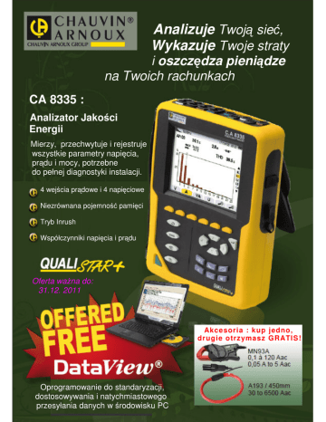 Analizuje Twoją sieć, Wykazuje Twoje straty i oszczędza pieniądze na Twoich rachunkach CA 8335 : Analizator Jakości Energii Mierzy, przechwytuje i rejestruje wszystkie parametry napięcia, prądu i mocy, potrzebne do pełnej diagnostyki instalacji. 4 wejścia prądowe i 4 napięciowe Niezrównana pojemność pamięci Tryb Inrush Współczynniki napięcia i prądu Oferta ważna do: 31.12. 2011 Akcesoria : kup jedno, dr ugi e otrz ymasz GRATI S! Oprogramowanie do standaryzacji, dostosowywania i natychmiastowego przesyłania danych w środowisku PC CA 8335 SIBILLE ENERGIE Sp. z o.o ul. Radna 15A, 00-341 Warszawa tel. 22 635 84 16; fax 22 635 84 66 e-mail:[email protected] www.sibille-energie.pl Przeznaczony dla ekip kontroli i konserwacji w budynkach przemysłowych i administracyjnych, Qualistar może być użyty do uzyskania zdjęć charakterystyk jakości zasilania sieci elektrycznych. Łatwy w obsłudze i dokładny, oferuje dużą liczbę obliczanych wartości i wiele funkcji przetwarzania danych. Napięcie (RMS AC + DC) Prąd (RMS AC + DC) Częstotliwość ......... 10 V do 1000 V 100 mA do 6500 A 40 Hz do 69 Hz kW, kVAR, kVA, PF, DPF, kWh, kVARh, kVAh, migotanie, brak równowagi, współczynnik K THD, rząd od 0 do 50 Akumulator 9,6 NiMh lub zasilacz 90 do 260 V ≥ 10 godzin, ≥ 30 godzin w trybie gotowości Inne pomiary Harmoniczne Zasilanie Żywotność baterii Bezpośredni dostęp do najważniejszych pomiarów: funkcji do pomiaru harmonicznych, mocy czynnej, rezultatów. Pojemność pamięci Ekran i krzywe Nagrywanie raz na sekundę Alarm Stany przejściowe Prąd rozruchu (INRUSH) Języki Komunikacja USB Kolorowy ekran 1/4 VGA, o przekątnej 148 mm Wyświetlacz Przyciski do nawigacji i bezpośredniego wyboru trybów i rodzaju wyświetlenia.. Bezpośredni dostęp do najważniejszych funkcji: pełnej konfiguracji przyrządu, wychwytywania czasu/daty krzywych, funkcji pomocy. ≥ 2 GB 50 Od 29 dni do kilku miesięcy 10.000 z 40 różnych rodzajów 210 ≥ 1 min. na wszystkich 3 fazach > 20 Zasilanie: Wewnętrzne Zewnetrzne Wymiary Waga Akumulator 9,6 NiMh Ładowarka sieciowa KAT. IV-600 V 24 x 18 x 5,5 cm 1,9 kg IEC 61010 600 V KAT. IV, 1000 V KAT. III Bezpieczeństwo Dostarczany z : Z tym oprogramowaniem masz Akcesoria : Kup jedno a drugie otrzymasz GRATIS ! bezpośredni dostęp do: - danych zapisanych w przyrządzie - konfiguracji - różnych pomiarów w czasie rzeczywistym - funkcji zarządzania raportami - funkcji zarządzania bazami danych Dostarczany z 1 torbą transportową nr 22, 1 kablem USB, 1 prostownikiem sieciowym, 1 przewodem zasilającym, 5 przewodami napięciowymi o dł 3 m każdy z banankami Ø 4 mm, 5 krokodylkami, 1 zestawem pierścieni identyfikacyjnych dla wejść i przewodów w 12 kolorach, 1 folią zabezpieczajacą ekran, 1 arkuszem danych bezpieczeństwa, 1wielojęzykową instrukcją obsługi, w tym w języku polskim, oprogramowaniem odzyskiwania danych z PC. Pracuje z Windows® 2000, Windows®XP, Windows® Wista DP 3130 Czerwiec 2010 Dokument ten jest własnością firmy SIBILLE ENERGIE, nie może być powielany i dystrybuowany bez jej pisemnej zgody !