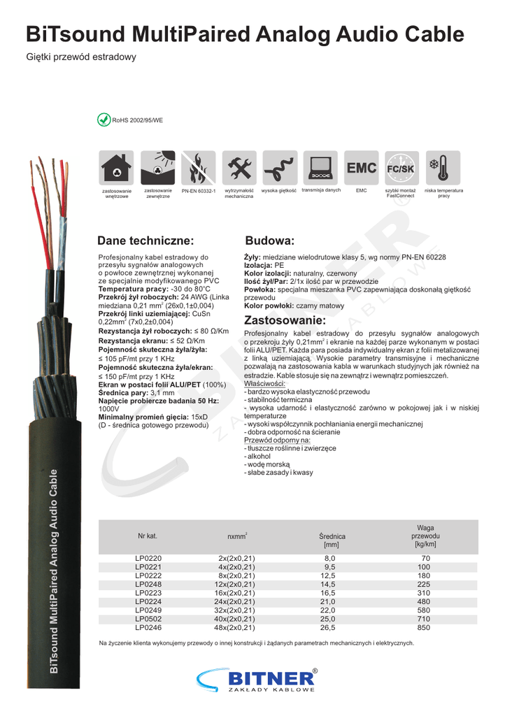 BiTsound MultiPaired Analog Audio Cable Giętki przewód estradowy RoHS RoHS 2002/95/WE EMC BiTsound MultiPaired Analog Audio Cable zastosowanie wnętrzowe zastosowanie zewnętrzne PN-EN 60332-1 wytrzymałość mechaniczna wysoka giętkość transmisja danych EMC FC/SK szybki montaż FastConnect niska temperatura pracy Dane techniczne: Budowa: Profesjonalny kabel estradowy do przesyłu sygnałów analogowych o powłoce zewnętrznej wykonanej ze specjalnie modyfikowanego PVC o Temperatura pracy: -30 do 80 C Przekrój żył roboczych: 24 AWG (Linka miedziana 0,21 mm2 (26x0,1±0,004) Przekrój linki uziemiającej: CuSn 0,22mm2 (7x0,2±0,004) Rezystancja żył roboczych: ≤ 80 Ω/Km Rezystancja ekranu: ≤ 52 Ω/Km Pojemność skuteczna żyła/żyła: ≤ 105 pF/mt przy 1 KHz Pojemność skuteczna żyła/ekran: ≤ 150 pF/mt przy 1 KHz Ekran w postaci folii ALU/PET (100%) Średnica pary: 3,1 mm Napięcie probiercze badania 50 Hz: 1000V Minimalny promień gięcia: 15xD (D - średnica gotowego przewodu) Żyły: miedziane wielodrutowe klasy 5, wg normy PN-EN 60228 Izolacja: PE Kolor izolacji: naturalny, czerwony Ilość żył/Par: 2/1x ilość par w przewodzie Powłoka: specjalna mieszanka PVC zapewniająca doskonałą giętkość przewodu Kolor powłoki: czarny matowy Nr kat. LP0220 LP0221 LP0222 LP0248 LP0223 LP0224 LP0249 LP0502 LP0246 Zastosowanie: Profesjonalny kabel estradowy do przesyłu sygnałów analogowych o przekroju żyły 0,21mm2 i ekranie na każdej parze wykonanym w postaci folii ALU/PET. Każda para posiada indywidualny ekran z folii metalizowanej z linką uziemiającą. Wysokie parametry transmisyjne i mechaniczne pozwalają na zastosowania kabla w warunkach studyjnych jak również na estradzie. Kable stosuje się na zewnątrz i wewnątrz pomieszczeń. Właściwości: - bardzo wysoka elastyczność przewodu - stabilność termiczna - wysoka udarność i elastyczność zarówno w pokojowej jak i w niskiej temperaturze - wysoki współczynnik pochłaniania energii mechanicznej - dobra odporność na ścieranie Przewód odporny na: - tłuszcze roślinne i zwierzęce - alkohol - wodę morską - słabe zasady i kwasy nxmm2 Średnica [mm] 2x(2x0,21) 4x(2x0,21) 8x(2x0,21) 12x(2x0,21) 16x(2x0,21) 24x(2x0,21) 32x(2x0,21) 40x(2x0,21) 48x(2x0,21) Waga przewodu [kg/km] 8,0 9,5 12,5 14,5 16,5 21,0 22,0 25,0 26,5 Na życzenie klienta wykonujemy przewody o innej konstrukcji i żądanych parametrach mechanicznych i elektrycznych. ® 70 100 180 225 310 480 580 710 850