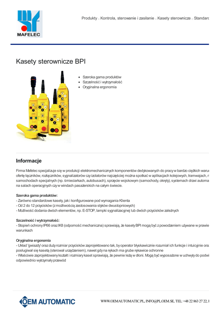 Produkty Kontrola, sterowanie i zasilanie Kasety sterownicze Standardowe k Kasety sterownicze BPI Szeroka gama produktów Szczelność i wytrzymałość Oryginalna ergonomia Informacje Firma Mafelec specjalizuje się w produkcji elektromechanicznych komponentów dedykowanych do pracy w bardzo ciężkich warunkach. B ofertę łączników, rozłączników, sygnalizatorów czy izolatorów najczęściej można spotkać w aplikacjach kolejowych, tramwajach, metrze, samochodach specjalnych (np. śmieciarkach, autobusach), sprzęcie wojskowym (samochody, okręty), systemach drzwi automatycznych na salach operacyjnych czy w windach pasażerskich na całym świecie. Szeroka gama produktów: - Zarówno standardowe kasety, jak i konfigurowane pod wymagania Klienta - Od 2 do 12 przycisków (z możliwością zastosowania styków dwustopniowych) - Możliwość dodania dwóch elementów, np. E-STOP, lampki sygnalizacyjnej lub dwóch przycisków zależnych Szczelność i wytrzymałość: - Stopień ochrony IP66 oraz IK8 (odporność mechaniczna) sprawiają, że kasety BPI mogą być z powodzeniem używane w prawie każdych warunkach Oryginalna ergonomia - Układ 'gwiazdy' oraz duży rozmiar przycisków zaprojektowano tak, by operator błyskawicznie rozumiał ich funkcje i intuicyjnie oraz pewni posługiwał się kasetą (sterował urządzeniem), nawet gdy na rękach ma grube rękawice ochronne - Właściwie zaprojektowany kształt i rozmiary kaset sprawiają, że pewnie leżą w dłoni. Mogą być wyposażone w uchwyty do podwieszania odpowiednio wytrzymały przewód WWW.OEMAUTOMATIC.PL, [email protected], TEL: +48 22 863 27 22, FAX: +4 Dane techniczne Obciążenie znamionowe Ith Znamionowe napięcie izolacji Ui Napięcie impulsowe Wytrzymałość dielektryczna Kategoria izolacji Prąd łączeniowy 10 A 500 V 6 kV 2,5 kV C wg IEC oraz NF EN 60664 AC15: 230/400V 8/4A DC13: 24V/10A Przyciski 1mln, Przełączniki obrotowe 300tys Polipropylen IP66 IK08 -25°C do +70 °C HB wg UL94 Tropikalne (+40°C i 95% wilgotności) IEC i EN 60 947-5-1, DEMKO, CSA Żywotność mechaniczna Obudowa Stopień ochrony Odporność mechaniczna Temperatura pracy Odporność na ogień Wykończenie specjalne Certyfikaty Przykładowe konfiguracje ---------- Dwa kierunki BPI ---------2 kierunki, 1 prędkość: Nr katalogowy BPI5020A BPI5021A BPI2580A BPI2527A Opis 2 przyciski mechaniczne zależne 2 przyciski mechaniczne zależne 2 przyciski mechaniczne zależne 2 przyciski mechaniczne zależne Zestyki 2x 1 NO 2x 1 NC 1 NO 2x 2 NO 2x 2 NO + 1 NC (pojedyńczy nacisk z zestykiem early-brea 2 przyciski mechaniczne zależne 2 przyciski mechaniczne zależne 2x 1 NO + 1 NO (dwa stopnie nacisku) 2x 1 NO 1 NO + 1 NC (2 stopnie nacisku z zestykiem early 2 kierunki, 2 prędkości: BPI5022D BPI5023D WWW.OEMAUTOMATIC.PL, [email protected], TEL: +48 22 863 27 22, FAX: +4 --------- 2 + 2 funkcje BPI ---------2 kierunki, 1 prędkość + funkcje dodatkowe BPI6037 BPI6038 Grzybek blokowany ∅30 - 1 NC Grzybek blokowany ∅30 - 1 NC 2x 1 NO 2x 1 NC 1 NO BPI6738 Przycisk płaski zielony 1 NO Grzybek blokowany ∅30 - 1 NC 2x 2 NO 1 NC (pojedyńczy nacisk z zestykiem early break) 2 kierunki, 2 prędkości + funkcje dodatkowe BPI6732 Grzybek blokowany ∅30 - 1 NC 2x 1 NO + 1 NO + 1 NC (dwa stopnie nacisku z zestykiem e ----------4 + 2 funkcje BPI---------4 kierunki, 1 prędkość BPI6040 BPI6041 4x 1 NO 4x 1 NC 1 NO 4 kierunki, 1 prędkość + funkcje dodatkowe WWW.OEMAUTOMATIC.PL, [email protected], TEL: +48 22 863 27 22, FAX: +4 BPI6047 BPI6048 Grzybek blokowany ∅30 - 1 NC Grzybek blokowany ∅30 - 1 NC 4x 1 NO 4x 1 NC 1 NO BPI5040 Przycisk płaski zielony 1 NO Przycisk płaski czerwony 1 NC Przycisk płaski zielony 1 NO Przycisk płaski czerwony 1 NC 4x 1 NO Przycisk płaski zielony 1 NO Grzybek blokowany ∅30 - 1 NC Przycisk płaski zielony 1 NO Grzybek blokowany ∅30 - 1 NC 4x 1 NO BPI5041 BPI5740 BPI5041 4x 1 NC 1 NO 4x 1 NC 1 NO ----------4 + 2 funkcje BPI---------4 kierunki, 2 prędkości BPI6042 BPI5041 4x 1 NO + 1 NO + 1 NC (2 stopnie nacisku z zestykiem early break) 2x 1 NO + 1 NO + 1 NC (2 stopnie nacisku z zestykiem early break) 2x 1 NC 1 NO 4 kierunki, 2 prędkości + funkcje dodatkowe WWW.OEMAUTOMATIC.PL, [email protected], TEL: +48 22 863 27 22, FAX: +4 BPI6742 Grzybek blokowany ∅30 - 1 NC BPI6743 Grzybek blokowany ∅30 - 1 NC 4x 1 NO + 1 NO + 1 NC (2 stopnie nacisku z zestykiem early break) 2x 1 NO + 1 NO + 1 NC (2 stopnie nacisku z zestykiem early break) 2x 1 NC 1 NO BPI5742 Przycisk płaski zielony 1 NO Grzybek blokowany ∅30 - 1 NC 4x 1 NO + 1 NO + 1 NC (2 stopnie nacisku z zestykiem early break) WWW.OEMAUTOMATIC.PL, [email protected], TEL: +48 22 863 27 22, FAX: +4 Kasety do konfiguracji WWW.OEMAUTOMATIC.PL, [email protected], TEL: +48 22 863 27 22, FAX: +4
