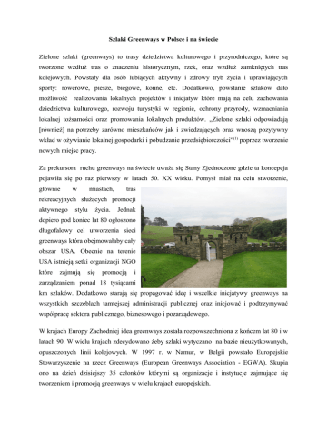 Szlaki Greenways w Polsce i na świecie Zielone szlaki (greenways) to trasy dziedzictwa kulturowego i przyrodniczego, które są tworzone wzdłuż tras o znaczeniu historycznym, rzek, oraz wzdłuż zamkniętych tras kolejowych. Powstały dla osób lubiących aktywny i zdrowy tryb życia i uprawiających sporty: rowerowe, piesze, biegowe, konne, etc. Dodatkowo, powstanie szlaków dało możliwość realizowania lokalnych projektów i inicjatyw które mają na celu zachowania dziedzictwa kulturowego, rozwoju turystyki w regionie, ochrony przyrody, wzmacniania lokalnej tożsamości oraz promowania lokalnych produktów. „Zielone szlaki odpowiadają [również] na potrzeby zarówno mieszkańców jak i zwiedzających oraz wnoszą pozytywny wkład w ożywianie lokalnej gospodarki i pobudzanie przedsiębiorczości” (1) poprzez tworzenie nowych miejsc pracy. Za prekursora ruchu greenways na świecie uważa się Stany Zjednoczone gdzie ta koncepcja pojawiła się po raz pierwszy w latach 50. XX wieku. Pomysł miał na celu stworzenie, głównie w miastach, tras rekreacyjnych służących promocji aktywnego stylu życia. Jednak dopiero pod koniec lat 80 ogłoszono długofalowy cel utworzenia sieci greenways która obejmowałaby cały obszar USA. Obecnie na terenie USA istnieją setki organizacji NGO które zajmują się promocją i zarządzaniem ponad 18 tysiącami km szlaków. Dodatkowo starają się propagować ideę i wszelkie inicjatywy greenways na wszystkich szczeblach tamtejszej administracji publicznej oraz inicjować i podtrzymywać współpracę sektora publicznego, biznesowego i pozarządowego. W krajach Europy Zachodniej idea greenways została rozpowszechniona z końcem lat 80 i w latach 90. W wielu krajach zdecydowano żeby szlaki wytyczano na bazie nieużytkowanych, opuszczonych linii kolejowych. W 1997 r. w Namur, w Belgii powstało Europejskie Stowarzyszenie na rzecz Greenways (European Greenways Association - EGWA). Skupia ono na dzień dzisiejszy 35 członków którymi są organizacje i instytucje zajmujące się tworzeniem i promocją greenways w wielu krajach europejskich. W Europie Środkowo-Wschodniej ideę greenways zapoczątkowali Czesi na początku lat 90. Wówczas postanowiono zaadoptować z USA świetnie rozwijającą się tam koncepcję greenways. Pierwszym utworzonym szlakiem była trasa łączącą Wiedeń z Pragą (PragaWiedeń Greenways). „W roku 1998 zarządzanie programem przejęła czeska Fundacja Partnerstwo dla Środowiska – Nadace Partnerství z Brna wzbogacając go o aspekty środowiskowe i społeczne”(2). Obecnie Program Greenways w Europie Środkowo-wschodniej (CEG – Central & Eastern European Greenways) jest realizowany w ramach międzynarodowego Stowarzyszenia "Environmental Partnership for Sustainable Development". Jest to konsorcjum fundacji działających w „Polsce, Republice Czeskiej, na Słowacji, Węgrzech, w Rumunii i Bułgarii. Do sieci greenways CEG należy obecnie 9 długodystansowych zielonych szlaków oraz kilkanaście szlaków lokalnych i miejskich które są realizowane zgodnie ze wspólnymi kryteriami”(3) W Polsce, bardzo ważnym efektem działań związanych z utworzeniem Zielonych szlaków jest rozwój lokalnej przedsiębiorczości oraz zwiększenie świadomości ekologicznej zarówno lokalnych mieszkańców jak i turystów, którzy pod wpływem zwiększonego zainteresowania regionem, zaczynają uczestniczyć w działaniach mających na celu ochronę i promocję tamtejszych bogactw naturalnych i walorów przyrodniczych. Bardzo dużym wsparciem w tych działaniach są lokalni liderzy (gospodarstwa agroturystyczne, organizacje pozarządowe, szkoły), oraz lokalne biura turystyczne które zachęcają indywidualnych turystów jak i grupy zorganizowane do odwiedzenia regionu poprzez zróżnicowane oferty turystyczne. „Wśród propozycji są zajęcia w warsztatach twórców ludowych, zielone szkoły, aktywne i poznawcze oferty pobytowe w regionie, a także krajowe oraz międzynarodowe eskapady wzdłuż całego zielonego szlaku lub jego odcinków.”(4) Dodatkowym ważnym elementem szlaków Greenways są lokalne produkty turystyczne które wykorzystują lokalny potencjał i wspierają lokalne społeczności. Kluczowym elementem tworzenia produktu są usługi turystyczne, oferta kulturalna regionu, lokalne produkty oraz inicjatywy społeczne. Dzięki temu „podróżowanie szlakami dziedzictwa przyrodniczego i kulturowego(…), jest zwiedzaniem o charakterze poznawczym. Umożliwia zapoznanie się z problematyką i specyfiką regionu pod względem przyrodniczym, kulturowym, etnicznym i społeczno-ekonomicznym.”(5) Do głównych zadań realizowanych w ramach krajowego Programu "Zielone Szlaki Greenways" należy: „budowanie krajowej sieci zielonych szlaków, w tym szlaków transgranicznych, rozpoznawalnych na rynku krajowym i zagranicznym, koordynacja Forum Greenways i Ekomuzeów w ramach Krajowej Sieci Grup Partnerskich, włączanie polskiej sieci greenways w programy i przedsięwzięcia krajowe związane z turystyką, dziedzictwem i ochroną środowiska, promocja zielonych szlaków w Polsce i za granicą, gromadzenie i upowszechnianie informacji oraz know-how o zielonych szlakach, tworzenie markowych produktów związanych z ekoturystyką i turystyką dziedzictwa w oparciu o zielone szlaki (…), inicjowanie i wspieranie lokalnych inicjatyw na rzecz zrównoważonego rozwoju(…), włączanie polskiej inicjatywy zielonych szlaków w programy i przedsięwzięcia międzynarodowe, w tym udział w pracach programu CEG na szczeblu europejskim i transatlantyckim, przenoszenie polskich doświadczeń zielonych szlaków do krajów Europy Wschodniej (m.in. Białoruś i Ukraina).”(6) Koordynacją programu "Zielone Szlaki - Greenways" w Polsce zajmowała się „Fundacja Partnerstwo dla Środowiska wspólnie z Zespołem Koordynatorów Greenways (Forum Zielonych Szlaków Greenways i Ekomuzeów w ramach Krajowej Sieci Grup Partnerskich)