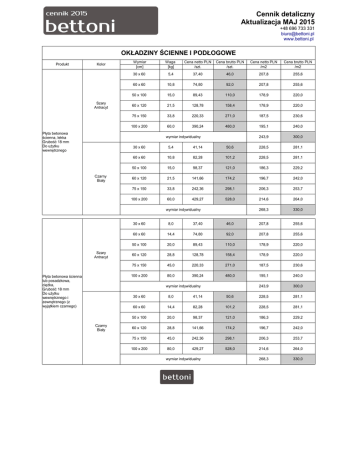Cennik detaliczny Aktualizacja MAJ 2015 +48 696 733 331 [email protected] www.bettoni.pl OKŁADZINY ŚCIENNE I PODŁOGOWE Produkt Kolor Szary Antracyt Płyta betonowa ścienna, lekka Grubość 18 mm Do użytku wewnętrznego Wymiar [cm] Waga [kg] Cena netto PLN /szt. Cena brutto PLN /szt. Cena netto PLN /m2 Cena brutto PLN /m2 30 x 60 5,4 37,40 46,0 207,8 255,6 60 x 60 10,8 74,80 92,0 207,8 255,6 50 x 100 15,0 89,43 110,0 178,9 220,0 60 x 120 21,5 128,78 158,4 178,9 220,0 75 x 150 33,8 220,33 271,0 187,5 230,6 100 x 200 60,0 390,24 480,0 195,1 240,0 243,9 300,0 wymiar indywidualny Czarny Biały 30 x 60 5,4 41,14 50,6 228,5 281,1 60 x 60 10,8 82,28 101,2 228,5 281,1 50 x 100 15,0 98,37 121,0 186,3 229,2 60 x 120 21,5 141,66 174,2 196,7 242,0 75 x 150 33,8 242,36 298,1 206,3 253,7 100 x 200 60,0 429,27 528,0 214,6 264,0 268,3 330,0 wymiar indywidualny Szary Antracyt Płyta betonowa ścienna lub posadzkowa, ciężka, Grubość 18 mm Do użytku wewnętrznego i zewnętrznego (z wyjątkiem czarnego) 30 x 60 8,0 37,40 46,0 207,8 255,6 60 x 60 14,4 74,80 92,0 207,8 255,6 50 x 100 20,0 89,43 110,0 178,9 220,0 60 x 120 28,8 128,78 158,4 178,9 220,0 75 x 150 45,0 220,33 271,0 187,5 230,6 100 x 200 80,0 390,24 480,0 195,1 240,0 243,9 300,0 wymiar indywidualny Czarny Biały 30 x 60 8,0 41,14 50,6 228,5 281,1 60 x 60 14,4 82,28 101,2 228,5 281,1 50 x 100 20,0 98,37 121,0 186,3 229,2 60 x 120 28,8 141,66 174,2 196,7 242,0 75 x 150 45,0 242,36 298,1 206,3 253,7 100 x 200 80,0 429,27 528,0 214,6 264,0 268,3 330,0 wymiar indywidualny Produkt Kolor Szary Antracyt Płyta betonowa ścienna, lekka Grubość 7 mm Do użytku wewnętrznego Wymiar [cm] Waga [kg] Cena netto PLN /szt. Cena brutto PLN /szt. Cena netto PLN /m2 Cena brutto PLN /m2 30 x 60 2,7 40,98 50,4 247,6 304,6 60 x 60 5,4 81,99 100,9 247,8 304,7 50 x 100 7,5 99,43 122,3 198,9 244,6 60 x 120 10,8 143,17 176,1 198,9 244,6 263,9 324,6 wymiar indywidualny (max. 60x120) Czarny Biały 30 x 60 2,7 45,07 55,4 272,4 335,1 60 x 60 5,4 90,19 110,9 272,5 335,2 50 x 100 7,5 109,37 134,5 218,7 269,1 60 x 120 10,8 157,49 193,7 218,7 269,1 218,7 269,1 wymiar indywidualny (max. 60x120) Szary Antracyt Płyta betonowa ścienna, gruba Grubość 30 mm Do użytku wewnętrznego i zewnętrznego (z wyjątkiem czarnego) 10,8 40,98 50,4 247,6 304,6 60 x 60 21,6 81,99 100,9 247,8 304,7 50 x 100 30,0 99,43 122,3 198,9 244,6 60 x 120 43,0 143,17 176,1 198,9 244,6 75 x 150 67,5 233,46 287,2 218,7 269,0 100 x 200 120,0 430,24 529,2 235,1 289,2 263,9 324,6 wymiar indywidualny 30 x 60 10,8 45,07 55,4 272,4 335,1 60 x 60 21,6 90,19 110,9 272,5 335,2 50 x 100 30,0 109,37 134,5 218,7 269,1 60 x 120 43,0 157,49 193,7 218,7 269,1 75 x 150 67,5 256,80 315,9 240,6 295,9 100 x 200 120,0 473,27 582,1 258,6 318,1 wymiar indywidualny 290,3 357,1 Szary Antracyt wymiar indywidualny 365,9 450,0 Biały Czarny wymiar indywidualny 406,5 500,0 Czarny Biały Płyta betonowa Grubość 4mm, Do użytku wewnętrznego 30 x 60 Produkt Płyta tarasowa Grubość 5 cm Do użytku zewnętrznego Kolor Szary Antracyt Wymiar [cm] Waga [kg] Cena netto PLN /szt. Cena brutto PLN /szt. Cena netto PLN /m2 Cena brutto PLN /m2 60x60 40 86,40 106,3 240,0 295,2 120x60 80 172,80 212,5 240,0 295,2 Płytka 3D Puzzle Grubość 2 cm Do użytku wewnętrznego i zewnętrznego (z wyjątkiem czarnego) Szary Antracyt 30x30 4,0 19,0 23,4 211,4 260,0 Czarny Biały 30x30 4,0 20,9 25,7 232,4 285,8 Płytka 3D Pyramids Do użytku wewnętrznego i zewnętrznego (z wyjątkiem czarnego) Szary Antracyt 20x20x20 4,0 20,8 25,6 211,4 260,0 Czarny Biały 20x20x20 4,0 22,9 28,2 232,4 285,8 Płytka 3D Pillow Do użytku wewnętrznego i zewnętrznego (z wyjątkiem czarnego) Szary Antracyt 40x40 4,0 33,8 41,6 211,4 260,0 Czarny Biały 40x40 4,0 37,2 45,8 232,4 285,8 Kolor Wymiar [cm] Waga [kg] Cena netto PLN /szt. Cena brutto PLN /szt. Szary Antracyt wys. 44 szer. 70 dł. 100 120,0 1900,0 2337,0 Czarny Biały wys. 44 szer. 70 dł. 100 120,0 2090,0 2570,7 Szary Antracyt wys. 40 szer. 90 dł. 90 120,0 1450,0 1783,5 Czarny Biały wys. 40 szer. 90 dł. 90 120,0 1595,0 1961,9 Cena netto PLN /mb Cena brutto PLN /mb 790,0 971,7 869,0 1068,9 Wymiar Cena netto PLN Cena brutto PLN [cm] /m2 /m2 487,8 600,0 536,6 660,0 MEBLE Produkt Stolik Lignum Stolik Quadra Produkt Blaty i zabudowy kuchenne Produkt Fronty meblowe MDF Pokryte betonem Kolor Szary Antracyt Czarny Biały Kolor Szary Antracyt Czarny Biały Wymiar [cm] Wykonujemy wszelkiego rodzaju meble, obudowy kominków , umywalki, stoły, elementy według indywidualnych projektów Według indywidualnego projektu SCHODY Kolor Wymiar [cm] Cena netto PLN /mb Cena brutto PLN /mb Stopnie płaskie Grubość: 3 cm Do użytku wewnętrznego i zewnętrznego (z wyjątkiem czarnego) Szary Antracyt szer. do 35 dł. do 2000 160,0 196,8 Czarny Biały szer. do 35 dł. do 2000 176,0 216,5 Podstopnice Grubość: 2 cm Do użytku wewnętrznego i zewnętrznego (z wyjątkiem czarnego) Szary Antracyt Według indywidualnego projektu 60,0 73,8 Czarny Biały Według indywidualnego projektu 66,0 81,2 Stopnie L-kształtne Grubość: 2-3 cm Do użytku wewnętrznego i zewnętrznego (z wyjątkiem czarnego) Szary Antracyt szer. do 35 dł. do 1500 220,0 270,6 Czarny Biały szer. do 35 dł. do 1500 242,0 297,7 Produkt DONICE Produkt Donica Ovali Do użytku wewnętrznego lub zewnętrznego (z wyjątkiem czarnego) Donica Diamond 30 Do użytku wewnętrznego lub zewnętrznego (z wyjątkiem czarnego) Donica Diamond 40 Do użytku wewnętrznego lub zewnętrznego (z wyjątkiem czarnego) Donica Diamond 60 Do użytku wewnętrznego lub zewnętrznego (z wyjątkiem czarnego) Donica Diamond 80 Do użytku wewnętrznego lub zewnętrznego (z wyjątkiem czarnego) Kolor Wymiar [cm] Waga [kg] Cena netto PLN /szt. Cena brutto PLN /szt. Szary Antracyt wys. 50 szer. 75 60,0 290,0 356,7 Czarny Biały wys. 50 szer. 75 60,0 319,0 392,4 Szary Antracyt wys. 30 szer. 29 15,0 125,0 153,8 Czarny Biały wys. 30 szer. 29 15,0 137,5 169,1 Szary Antracyt wys. 40 szer. 29 25,0 150,0
