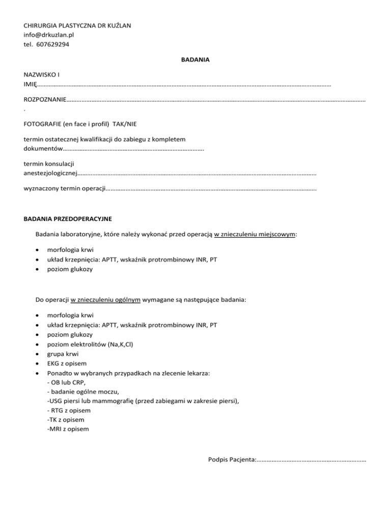 CHIRURGIA PLASTYCZNA DR KUŹLAN [email protected] tel. 607629294 BADANIA NAZWISKO I IMIĘ…………………………………………………………………………………………………………………………………………………………… ROZPOZNANIE……………………………………………………………………………………………………………………………………………………………… . FOTOGRAFIE (en face i profil) TAK/NIE termin ostatecznej kwalifikacji do zabiegu z kompletem dokumentów…………………………………………………………………………. termin konsulacji anestezjologicznej……………………………………………………………………………………………………………………………… wyznaczony termin operacji………………………………………………………………………………………………………………. BADANIA PRZEDOPERACYJNE Badania laboratoryjne, które należy wykonać przed operacją w znieczuleniu miejscowym: morfologia krwi układ krzepnięcia: APTT, wskaźnik protrombinowy INR, PT poziom glukozy Do operacji w znieczuleniu ogólnym wymagane są następujące badania: morfologia krwi układ krzepnięcia: APTT, wskaźnik protrombinowy INR, PT poziom glukozy poziom elektrolitów (Na,K,Cl) grupa krwi EKG z opisem Ponadto w wybranych przypadkach na zlecenie lekarza: - OB lub CRP, - badanie ogólne moczu, -USG piersi lub mammografię (przed zabiegami w zakresie piersi), - RTG z opisem -TK z opisem -MRI z opisem Podpis Pacjenta:…………………………………………………………