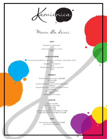 K amienica Menu dla dzieci K ZUPY Rosołek z makaronem 10 zł Zupa pomidorowa z ryżem 10 zł DANIA GŁÓWNE Kurczak kukurydziany w panierce, surówka z marchewki, frytki 15zł Spaghetti bolognese 15 zł Naleśniki z serkiem i owocami 10 zł HERBATY Mrożona herbata 0,4l/1l 7zł/15zł Herbaty 8zł Czarna: Ceylon Gold, Earl Grey, English Breakfast Zielona: Gunpowder, Green Jasmine, Green Cherry Czerwona: Pu-erh trawberry Biała: White Pearl of Fujlan NAPOJE Coca-cola 5zł Coca-cola Zero 5zł Fanta 5zł Sprite 5zł woda niegazowana 0,33l 5zł/0,75l 10zł woda gazowana 0,33l 5zł/0,75l 10zł SOKI Soki świeżo wyciskane 0,4l/10zł pomarańcza/grejpfrut