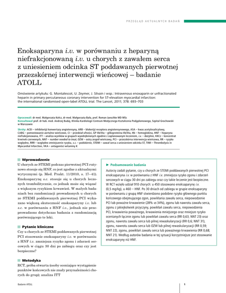 Przegląd aktualnych badań Enoksaparyna i.v. w porównaniu z heparyną niefrakcjonowaną i.v. u chorych z zawałem serca z uniesieniem odcinka ST poddawanych pierwotnej przezskórnej interwencji wieńcowej – badanie ATOLL Omówienie artykułu: G. Montalescot, U. Zeymer, J. Silvain i wsp.: Intravenous enoxaparin or unfractionated heparin in primary percutaneous coronary intervention for ST‑elevation myocardial infarction: the international randomised open‑label ATOLL trial. The Lancet, 2011; 378: 693–703 Opracowali: dr med. Małgorzata Kołcz, dr med. Małgorzata Bała, prof. Roman Jaeschke MD MSc Konsultował prof. dr hab. med. Andrzej Budaj, Klinika Kardiologii Centrum Medycznego Kształcenia Podyplomowego, Szpital Grochowski w Warszawie Skróty: ACEI – inhibitor(y) konwertazy angiotensyny, ARB – bloker(y) receptora angiotensynowego, ASA – kwas acetylosalicylowy, CABG – pomostowanie aortalno‑wieńcowe, CI – przedział ufności, GP IIb/IIIa – glikoproteina IIb/IIIa, Hb – hemoglobina, HNF – heparyna niefrakcjonowana, ITT – analiza wyników w grupach wyodrębnionych zgodnie z zaplanowanym leczeniem, i.v. – dożylnie, KKCz – koncentrat krwinek czerwonych, NNT – number needed to treat, OZW – ostry zespół wieńcowy, PCI – przezskórna interwencja wieńcowa, RR – ryzyko względne, RRR – względne zmniejszenie ryzyka, s.c. – podskórnie, STEMI – zawał serca z uniesieniem odcinka ST, TIMI – Thrombolysis in Myocardial Infarction, VKA – antagoniści witaminy K Wprowadzenie U chorych ze STEMI podczas pierwotnej PCI ruty nowo stosuje się HNF, co jest zgodne z aktualnymi wytycznymi (p. Med. Prakt. 11/2010, s. 17–41). Enoksaparynę s.c. stosuje się u chorych leczo nych trombolitycznie, co jednak może się wiązać z większym ryzykiem krwawień. W małych bada niach bez randomizacji prowadzonych u chorych ze STEMI poddawanych pierwotnej PCI wyka zano większą skuteczność enoksaparyny i.v. lub s.c. w porównaniu z HNF i.v., jednak nie prze prowadzono dotychczas badania z randomizacją porównującego te leki. Pytanie kliniczne Czy u chorych ze STEMI poddawanych pierwotnej PCI stosowanie enoksaparyny i.v. w porównaniu z HNF i.v. zmniejsza ryzyko zgonu i zdarzeń ser cowych w ciągu 30 dni po zabiegu oraz czy jest bezpieczne? ►► Podsumowanie badania Autorzy zadali pytanie, czy u chorych ze STEMI poddawanych pierwotnej PCI enoksaparyna i.v. w porównaniu z HNF i.v. zmniejsza ryzyko zgonu i zdarzeń sercowych w ciągu 30 dni po zabiegu oraz czy takie leczenie jest bezpieczne. W RCT wzięło udział 910 chorych: u 450 stosowano enoksaparynę i.v. (0,5 mg/kg), u 460 – HNF. Po 30 dniach od zabiegu w grupie enoksaparyny w porównaniu z grupą HNF stwierdzono podobne ryzyko głównego punktu końcowego obejmującego zgon, powikłania zawału serca, niepowodzenie PCI lub poważne krwawienie (28% vs 34%), zgonu lub nawrotu zawału serca, zgonu z jakiejkolwiek przyczyny, powikłań zawału serca, niepowodzenia PCI, krwawienia poważnego, krwawienia mniejszego oraz mniejsze ryzyko ocenianych łącznie zgonu lub powikłań zawału serca (RR 0,63; NNT 23) oraz zgonu, nawrotu zawału serca lub pilnej rewaskularyzacji (RR 0,6; NNT 31), zgonu, nawrotu zawału serca lub OZW lub pilnej rewaskularyzacji (RR 0,59; NNT 22), zgonu, powikłań zawału serca lub poważnego krwawienia (RR 0,68; NNT 21). Według autorów badania w tej sytuacji korzystniejsze jest stosowanie enoksaparyny niż HNF. Metodyka RCT, próba otwarta (osoby oceniające wystąpienie punktów końcowych nie znały przynależności cho rych do grup); analiza ITT Badanie ATOLL 1 Przegląd aktualnych badań Tabela 1. Wyjściowa charakterystyka badanej populacjia wiek mediana 59 lat mężczyźni 78% chorzy >75 lat 18% masa ciała 75 kg skurczowe ciśnienie tętnicze 140 mm Hg częstotliwość rytmu serca 75 /min nadciśnienie tętnicze 45% cukrzyca 15% dyslipidemia 40% aktualne palenie tytoniu 46% przebyty zawał serca 8% przebyta PCI 9,5% przebyte CABG 1% choroba tętnic obwodowych w wywiadach 4,2% przebyty udar mózgu 2,5% przebyta choroba nowotworowa 6% niewydolność serca w II–IV klasie wg Killipa 9,4% niewydolność oddechowa 3% przyjmowane leki ASA 96% klopidogrel 93% inhibitor GP IIb/IIIa 80% β‑bloker 86% statyna 87% ACEI/ARB a w ybrane grup 76% cechy, przybliżone mediany lub średnie dla obu Lokalizacja 64 ośrodki w Austrii, Francji, Niemczech i USA Badani Kryteria kwalifikujące: STEMI (utrzymujący się niedokrwienny ból w klatce piersiowej trwający ≥20 min z towarzyszącym uniesieniem odcinka ST o ≥2 mm w ≥2 sąsiednich odprowadzeniach przed sercowych lub o >1 mm w ≥2 sąsiednich odpro wadzeniach kończynowych lub z nowo powstałym blokiem lewej odnogi pęczka Hisa), wiek >17 lat, wskazanie do pierwotnej PCI w ciągu 12 h od wystąpienia pierwszych objawów niedokrwienia serca oraz wskazanie do pierwotnej PCI w ciągu 2 12–24 h od wystąpienia pierwszych objawów nie dokrwienia serca u chorych z utrzymującym się bólem niedokrwiennym i/lub utrzymującym się lub nawracającym uniesieniem odcinka ST. Kryteria wykluczające: m.in. przyjmowanie przed randomizacją HNF, HDCz, fondaparynuksu, VKA, leków trombolitycznych, krótka przewidy wana długość życia, kobiety w okresie prokre acyjnym, przeciwwskazanie do stosowania ASA, pochodnych tienopirydyny lub heparyn. Wyjściowo badane grupy nie różniły się zna miennie pod względem cech demograficznych i kli nicznych (tab. 1). Interwencja Chorych przydzielano losowo do 2 grup, w których przed PCI otrzymywali i.v. odpowiednio: – enoksaparynę 0,5 mg/kg – HNF 70–100 IU/kg (u chorych nieprzyjmu jących inhibitora GP IIb/IIIa) lub 50–70 IU/ kg (u chorych przyjmujących inhibitor GP IIb/ IIIa). W razie PCI przedłużonej o >2 h lub w celu uzyskania większego efektu przeciwkrzepliwego, koniecznego według decyzji lekarza do opanowa nia powikłań okołozabiegowych, w grupie enok saparyny dozwolone było pod