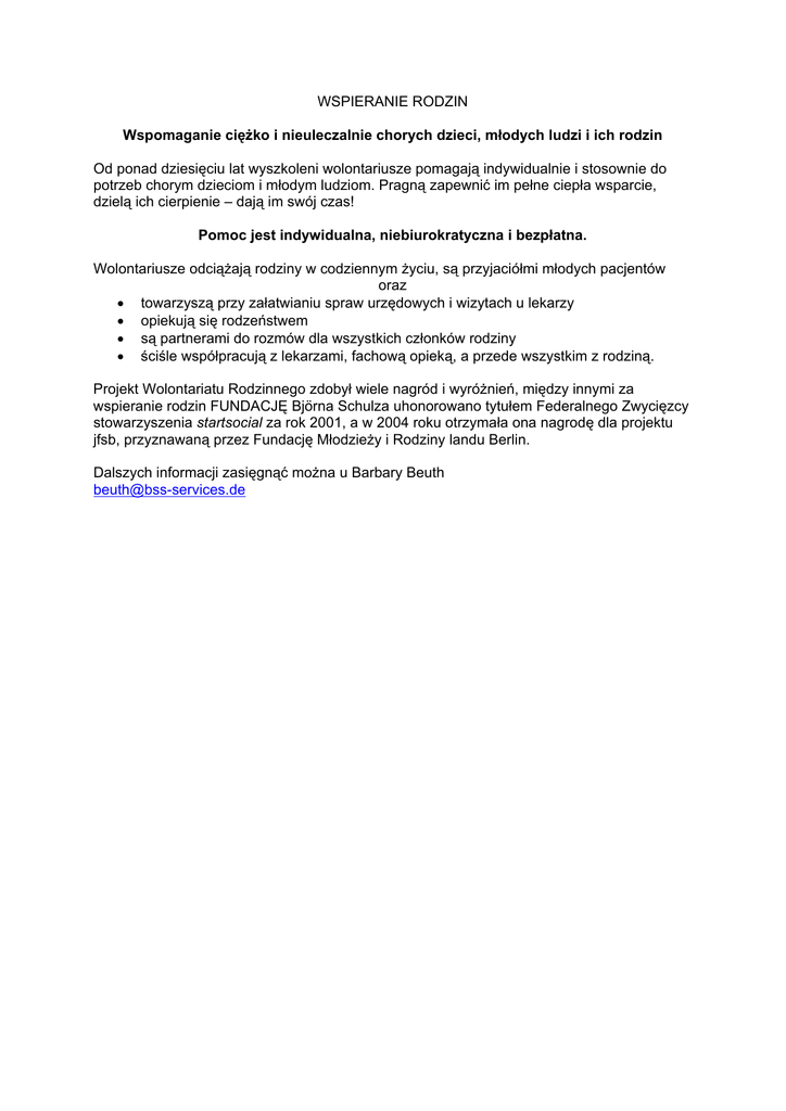 WSPIERANIE RODZIN Wspomaganie ciężko i nieuleczalnie chorych dzieci, młodych ludzi i ich rodzin Od ponad dziesięciu lat wyszkoleni wolontariusze pomagają indywidualnie i stosownie do potrzeb chorym dzieciom i młodym ludziom. Pragną zapewnić im pełne ciepła wsparcie, dzielą ich cierpienie – dają im swój czas! Pomoc jest indywidualna, niebiurokratyczna i bezpłatna. Wolontariusze odciążają rodziny w codziennym życiu, są przyjaciółmi młodych pacjentów oraz • towarzyszą przy załatwianiu spraw urzędowych i wizytach u lekarzy • opiekują się rodzeństwem • są partnerami do rozmów dla wszystkich członków rodziny • ściśle współpracują z lekarzami, fachową opieką, a przede wszystkim z rodziną. Projekt Wolontariatu Rodzinnego zdobył wiele nagród i wyróżnień, między innymi za wspieranie rodzin FUNDACJĘ Björna Schulza uhonorowano tytułem Federalnego Zwycięzcy stowarzyszenia startsocial za rok 2001, a w 2004 roku otrzymała ona nagrodę dla projektu jfsb, przyznawaną przez Fundację Młodzieży i Rodziny landu Berlin. Dalszych informacji zasięgnąć można u Barbary Beuth [email protected]