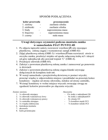 SPOSÓB PODŁĄCZENIA kolor przewodu 1. zielony 2. niebieski 3. biały 4. brązowy 5. czarny - przeznaczenie zasilanie silnika zasilanie silnika naprzemienna masa naprzemienna masa stała masa Uwagi dotyczące czynności podczas montaŜu zamka w samochodzie FIAT PUNTO 4D 1. Po zdjęciu tapicerki naleŜy rozwiercić wiertłem O6 nity mocujące plastikową osłonę cięgna i wymontować zamek (OBR-02) 2. Zdjąć plastikową osłonę (OBR-3) i wiertłem O3mm rozwiercić otwór w orczyku zamka, przełoŜyć niejako od spodu załączoną śrubę m3 i skręcić od góry nakrętką tak aby powstał trzpień ‘C’ (OBR-4). 3. Przykręcić siłownik (OBR-05). 4. ZałoŜyć z powrotem plastikową osłonę zamka i zamocować go ponownie w drzwiach 5. ZałoŜyć z powrotem plastikową osłonę cięgna klamki uŜywając dołączonych do kompletu śrub m6. 6. W wersji samochodu z przejściówką drzwiową w postaci wtyczki, przeciąć wiązkę w odpowiednim miejscu i pozakładać na przecięte końce konektory – męskie od strony siłownika, Ŝeńskie od strony centralki, 7. Wcisnąć konektory w wolne miejsca wtyczek zwracając uwagę na zgodność kolorów przewodów po złączeniu wtyczki. Zestaw zawiera: 1. 1x siłownik sterujący 2. 1x siłownik wykonawczy lewy 3. 2x siłownik wykonawczy prawy 4. 1x centralka sterująca 5. 1x wiązka elektryczna 6. instrukcja montaŜu 7. akcesoria 8. karta gwarancyjna Akcesoria: - 12x śruby z nakrętkami O6 - 4x śruby z nakrętkamiO3 - 8x wkręty O3 - 7x konektor męski FCI - 7x konektor Ŝeński FCI