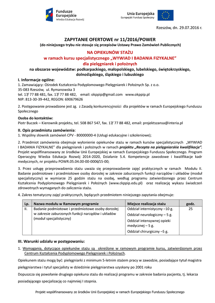 Rzeszów, dn. 29.07.2016 r. ZAPYTANIE OFERTOWE nr 11/2016/POWER (do niniejszego trybu nie stosuje się przepisów Ustawy Prawo Zamówień Publicznych) NA OPIEKUNÓW STAŻU w ramach kursu specjalistycznego „WYWIAD I BADANIA FIZYKALNE” dla pielęgniarek i położnych na obszarze województw: podkarpackiego, małopolskiego, lubelskiego, świętokrzyskiego, dolnośląskiego, śląskiego i lubuskiego I. Informacje ogólne: 1. Zamawiający: Ośrodek Kształcenia Podyplomowego Pielęgniarek i Położnych Sp. z o.o. 35-083 Rzeszów, ul. Rymanowska 3 tel. 17/ 77 88 481, fax. 17/ 77 88 482, email: [email protected] www.okppip.pl NIP: 813-30-39-442, REGON: 690679626 2. Postępowanie prowadzone jest zg. z Zasadą konkurencyjności dla projektów w ramach Europejskiego Funduszu Społecznego Osoba do kontaktów: Piotr Buczek – Kierownik projektu, tel. 508 867 547, fax. 17/ 77 88 482, email: [email protected] II. Opis przedmiotu zamówienia: 1. Wspólny słownik zamówień CPV - 80000000-4 (Usługi edukacyjne i szkoleniowe); 2. Przedmiot zamówienia obejmuje wyłonienie opiekunów stażu w ramach kursów specjalistycznych „WYWIAD I BADANIA FIZYKALNE” dla pielęgniarek i położnych w ramach projektu „Recepta na pielęgniarskie kwalifikacje”. Projekt współfinansowany ze środków Unii Europejskiej w ramach Europejskiego Funduszu Społecznego. Program Operacyjny Wiedza Edukacja Rozwój 2014-2020, Działanie 5.4. Kompetencje zawodowe i kwalifikacje kadr medycznych, nr projektu POWR.05.04.00-00-0006/15-00; 3. Przez usługę przeprowadzenia stażu uważa się przeprowadzenie zajęć praktycznych w ramach Modułu II. Badanie podmiotowe i przedmiotowe osoby dorosłej w zakresie zaburzonych funkcji narządów i układów (moduł specjalistyczny) w wymiarze 25 godzin stażu na osobę, według programu zatwierdzonego przez Centrum Kształcenia Podyplomowego Pielęgniarek i Położnych (www.ckppip.edu.pl) oraz realizację wykazu świadczeń zdrowotnych wymaganych do zaliczenia stażu. 4. Zakres tematyczny zajęć praktycznych, będących przedmiotem niniejszego zapytania obejmuje: Lp. II. Nazwa modułu w Ramowym programie Badanie podmiotowe i przedmiotowe osoby dorosłej w zakresie zaburzonych funkcji narządów i układów (moduł specjalistyczny) Miejsce realizacja stażu Oddział internistyczny –10 g. Oddział neurologiczny – 5 g. Oddział intensywnej opieki medycznej – 5 g. Oddział chirurgiczny –5 g. godz. 25 III. Warunki udziału w postępowaniu: 1. Wymagania, dotyczące opiekunów stażu są określone w ramowym programie kursu, zatwierdzonym przez Centrum Kształcenia Podyplomowego Pielęgniarek i Położnych. Opiekunem stażu mogą być: pielęgniarki z minimum 5-letnim stażem pracy w zawodzie, posiadające tytuł magistra pielęgniarstwa i tytuł specjalisty w dziedzinie pielęgniarstwa uzyskany po 2001 roku Dopuszcza się powołanie drugiego opiekuna stażu do realizacji programu w zakresie badania pacjenta, tj. lekarza posiadającego specjalizację co najmniej I stopnia. Projekt współfinansowany ze środków Unii Europejskiej w ramach Europejskiego Funduszu Społecznego 2. Staże odbywają się w grupach 5-6 osobowych; 3. Dokumenty osób będących opiekunami stażu, potwierdzające posiadane ww. kwalifikacje Wykonawca powinien zamieścić w formie załącznika do oferty; 4. Zamawiający przewiduje możliwość złożenia oferty oddzielnej dla każdego z miejsc realizacji kursów tj. oddzielnie dla staży organizowanych w obrębie jednego województwa; 5. Zamawiający przewiduje 12 edycji ww. kursu specjalistycznego, w tym: 6 grup woj. podkarpackim i po 1 grupie w pozostałych ww. województwach. Każda edycja przeznaczona jest dla 20 osobowej grupy zakwalifikowanej do projektu. 6. Staże prowadzone będą na terenie Rzeszowa, Tarnobrzega i Krosna lub w innych lokalizacjach na terenie woj. podkarpackiego oraz ww. 6 pozostałych województwach, wskazanym przez Zamawiającego. Do 7 dni przed rozpoczęciem szkolenia Wykonawca otrzyma od Zamawiającego szczegółowy harmonogram staży; 7. Maksymalna liczba godzin jednego dnia nie więcej niż 8 godzin zegarowych, przy czym jedna godzina zajęć teoretycznych = 45 minut; 8. Staże mogą odbywać się od poniedziałku do piątku w godz. pracy placówek stażowych. 9. Termin rozpoczęcia realizacji pierwszej edycji nie później niż do 31 sierpnia 2016 r., zakończenia ostatniej edycji nie później niż do 30 czerwca 2017 r. 10. Uszczegółowione harmonogramy i miejsca realizacji staży zostaną uzgodnione z wybranymi w postępowaniu Opiekunami staży, po podpisaniu z nimi umów. 11. Wykonawcy przysługuje wynagrodzenie za faktycznie przeprowadzoną liczbę godzin stażu, która będzie wynikała z dokumentacji przedstawionej po zakończeniu realizacji stażu; 12. Cena powinna obejmować wszystkie koszty oferenta związane z realizację staży, w tym realizację wymaganego w ramowym programie Wykazu świadczeń zdrowotnych; 13. Zamawiający zastrzega sobie prawo kontroli jakości stażu poprzez wizyty monitoringowe podczas praktyk oraz ankiety ewaluacyjne. IV. Kryteria oceny oferty i opis sposobu przyznawania punktacji: 1. Kryterium wyboru najkorzystniejszej oferty stanowi cena – 100%; 2. Najwyższą oceną 100 pkt. otrzyma ferta o najniżej cenie. Punkty za kryterium „cena” zostaną obliczone wg. następującego wzoru: najniższa cena/cena Oferenta x 100 = ilość uzyskanych punktów 3. Zamawiający udzieli zamówienia Wykonawcy/com, który zaoferował najkorzystniejszą ofertę; 4. Cena należy podać w PLN, z dokładnością do dwóch miejsc po przecinku; 5. Zamawiający może odrzucić ofertę jeżeli: - zostanie złożona po terminie składania ofert; - będzie niekompletna - brak oferty cenowej, brak oświadczenia o braku powiązań; - wykazuje powiązania kapitałowe lub osobowe pomiędzy Wykonawcą a Zamawiającym; 6. W przypadku podania tej samej ceny przez dwóch oferentów, Komisja rozstrzygnie zapytanie ofertowe
