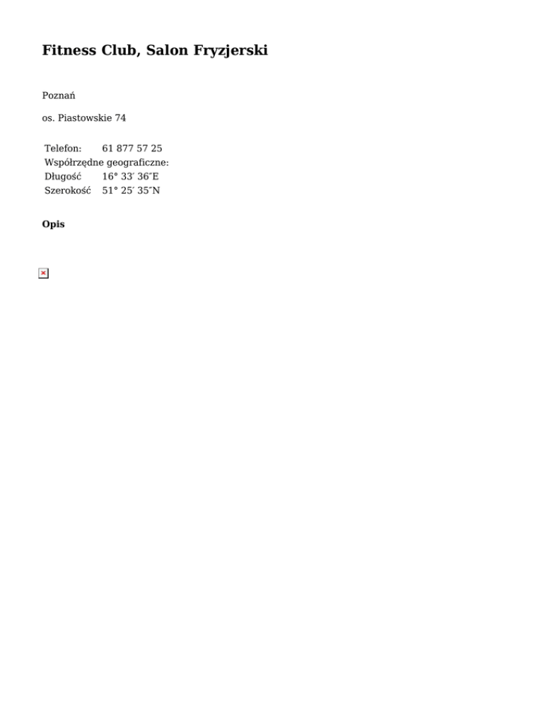 Fitness Club, Salon Fryzjerski Poznań os. Piastowskie 74 Telefon: 61 877 57 25 Współrzędne geograficzne: Długość 16° 33′ 36″E Szerokość 51° 25′ 35″N Opis