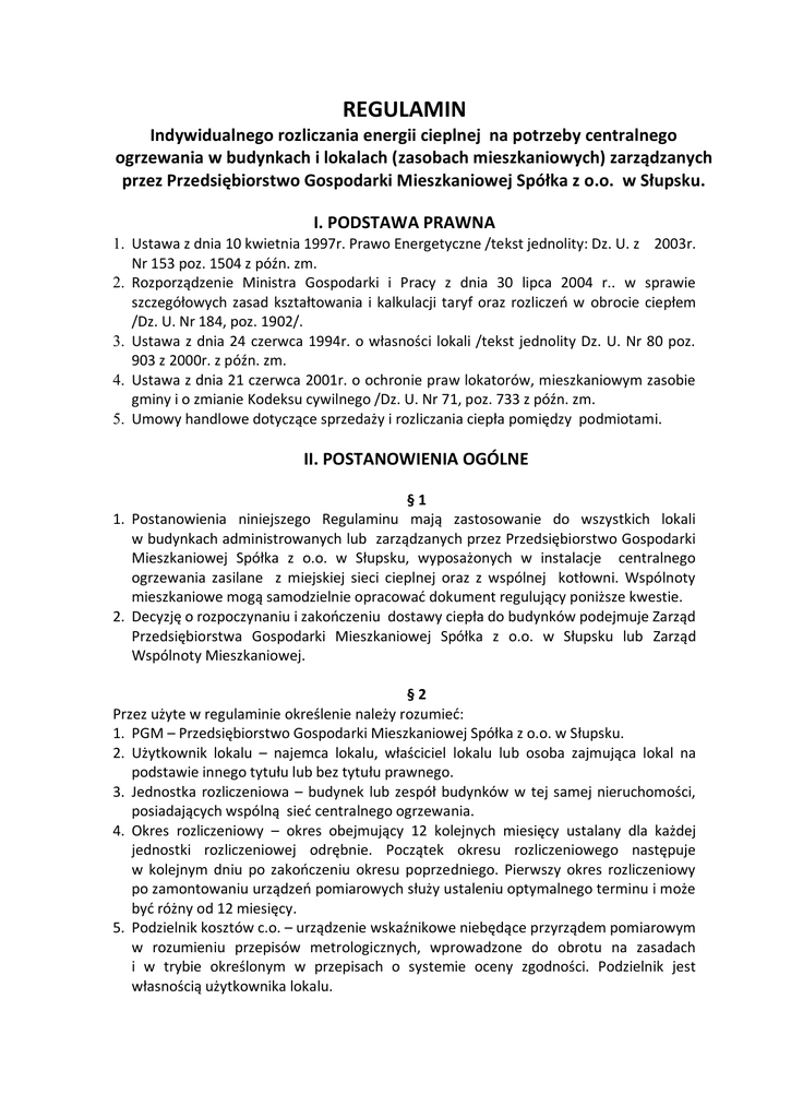 REGULAMIN Indywidualnego rozliczania energii cieplnej na potrzeby centralnego ogrzewania w budynkach i lokalach (zasobach mieszkaniowych) zarządzanych przez Przedsiębiorstwo Gospodarki Mieszkaniowej Spółka z o.o. w Słupsku. I. PODSTAWA PRAWNA 1. Ustawa z dnia 10 kwietnia 1997r. Prawo Energetyczne /tekst jednolity: Dz. U. z 2003r. Nr 153 poz. 1504 z późn. zm. 2. Rozporządzenie Ministra Gospodarki i Pracy z dnia 30 lipca 2004 r.. w sprawie szczegółowych zasad kształtowania i kalkulacji taryf oraz rozliczeo w obrocie ciepłem /Dz. U. Nr 184, poz. 1902/. 3. Ustawa z dnia 24 czerwca 1994r. o własności lokali /tekst jednolity Dz. U. Nr 80 poz. 903 z 2000r. z późn. zm. 4. Ustawa z dnia 21 czerwca 2001r. o ochronie praw lokatorów, mieszkaniowym zasobie gminy i o zmianie Kodeksu cywilnego /Dz. U. Nr 71, poz. 733 z późn. zm. 5. Umowy handlowe dotyczące sprzedaży i rozliczania ciepła pomiędzy podmiotami. II. POSTANOWIENIA OGÓLNE §1 1. Postanowienia niniejszego Regulaminu mają zastosowanie do wszystkich lokali w budynkach administrowanych lub zarządzanych przez Przedsiębiorstwo Gospodarki Mieszkaniowej Spółka z o.o. w Słupsku, wyposażonych w instalacje centralnego ogrzewania zasilane z miejskiej sieci cieplnej oraz z wspólnej kotłowni. Wspólnoty mieszkaniowe mogą samodzielnie opracowad dokument regulujący poniższe kwestie. 2. Decyzję o rozpoczynaniu i zakooczeniu dostawy ciepła do budynków podejmuje Zarząd Przedsiębiorstwa Gospodarki Mieszkaniowej Spółka z o.o. w Słupsku lub Zarząd Wspólnoty Mieszkaniowej. §2 Przez użyte w regulaminie określenie należy rozumied: 1. PGM – Przedsiębiorstwo Gospodarki Mieszkaniowej Spółka z o.o. w Słupsku. 2. Użytkownik lokalu – najemca lokalu, właściciel lokalu lub osoba zajmująca lokal na podstawie innego tytułu lub bez tytułu prawnego. 3. Jednostka rozliczeniowa – budynek lub zespół budynków w tej samej nieruchomości, posiadających wspólną sied centralnego ogrzewania. 4. Okres rozliczeniowy – okres obejmujący 12 kolejnych miesięcy ustalany dla każdej jednostki rozliczeniowej odrębnie. Początek okresu rozliczeniowego następuje w kolejnym dniu po zakooczeniu okresu poprzedniego. Pierwszy okres rozliczeniowy po zamontowaniu urządzeo pomiarowych służy ustaleniu optymalnego terminu i może byd różny od 12 miesięcy. 5. Podzielnik kosztów c.o. – urządzenie wskaźnikowe niebędące przyrządem pomiarowym w rozumieniu przepisów metrologicznych, wprowadzone do obrotu na zasadach i w trybie określonym w przepisach o systemie oceny zgodności. Podzielnik jest własnością użytkownika lokalu. 6. Dostawca ciepła – SYDKRAFT Energetyka Cieplna Spółka z o.o. w Słupsku lub inny podmiot z którym PGM w imieniu Miasta Słupsk lub Wspólnoty Mieszkaniowej zawarł umowę na dostawę ciepła oraz zarządca jeżeli dostarcza ciepło z kotłowni własnej. 7. Budynek opomiarowany – to budynek, który ma: a) w węźle cieplnym zainstalowany układ pomiarowy umożliwiający pomiar ilości ciepła lub zużycia paliwa przeznaczonego na cele centralnego ogrzewania: b) instalację c.o. wyposażoną w grzejnikowe zawory termostatyczne; c) liczniki ciepła na poszczególne lokale lub grzejniki c.o. wyposażone w podzielniki kosztów centralnego ogrzewania; d) brak zaworów odcinających na gałązkach powrotu grzejnika (lub zawory te są oplombowane); 8.Koszt stały – kwota zużytego ciepła wyliczona w oparciu o powierzchnię lokali. Wysokośd kosztu stałego jest ustalana przez PGM lub Wspólnotę Mieszkaniową. 9.Koszt zmienny – kwota zużytego ciepła wyliczona w oparciu podzielniki kosztów c.o. i współczynniki korygujące. §3 1. Koszty dostawy ciepła do budynków obejmują wydatki ponoszone przez Miasto Słupsk lub Wspólnoty w związku z opłatami uiszczanymi dostawcom ciepła. Rozliczeniu podlegają całkowite rzeczywiste koszty ciepła. W przypadku obcych dostawców ciepła, koszty stanowią sumę wniesionych opłat kosztów stałych i zmiennych przez PGM Sp. z o.o. w Słupsku tj.: a) opłata za zamówioną moc cieplną (wyrażona w zł/MW) b) opłata przesyłowa stała ( wyrażona w zł/MW) c) opłata za dostarczone ciepło ( wyrażona w zł/GJ) d) opłata za najem pomieszczenia ( wyrażona w zł/m² pomieszczenia) e) opłata zmienna za przesył ciepła (wyrażona w zł/GJ) f) opłata za nośnik ciepła ( wyrażona w zł/m³) 2. Koszty dostawy ciepła z kotłowni własnej obejmują wydatki ponoszone przez Miasto Słupsk na zakup opału i obsługę kotłowni oraz inne opłaty związane z eksploatacją kotłowni ( między innymi za : opał, energię elektryczną, bieżącą obsługę kotłowni, bieżącą konserwację urządzeo kotłowni, amortyzację). §4 Koszty dostawy ciepła na cele c.o. są ewidencjonowane i rozliczane z podziałem na poszczególne budynki lub grupy budynków z uwzględnieniem miejsca pomiaru dostarczanej energii. W przypadku o którym mowa w § 3 ust. 2 (1) miejscem pomiaru może byd oplombowany zbiornik na olej opałowy lub wskazanie zużytego gazu przez gazomierz. §5 Za powierzchnię ogrzewczą w lokalu uważa się jego powierzchnię użytkową, tj: 1. powierzchnię użytkową lokalu mieszkalnego, 2. powierzchnię użytkową lokalu użytkowego, 3. ciągi komunikacyjne w lokalu, 4. pomieszczenia przynależne do lokalu nie wyposażone w grzejniki z wyjątkiem piwnic, chyba że są one wyposażone w grzejniki. §6 Zużycie ciepła w częściach wspólnych dolicza się do ogólnego zużycia ciepła w budynku. Do powierzchni grzewczej części wspólnych zalicza się inne pomieszczenia nieopomiarowane wyposażone w grzejniki tj. klatki schodowej, suszarnie, pralnie. §7 Kosztu konserwacji wewnętrznej instalacji ciepłowniczej w budynku oraz zewnętrznych instalacji odbiorczych, łączących budynek z węzłem grupowym nie dolicza się do kosztów ogrzewania. Jest to koszt eksploatacji budynku. §8 1. Użytkownik lokalu oprócz kosztów zużycia ciepła dodatk