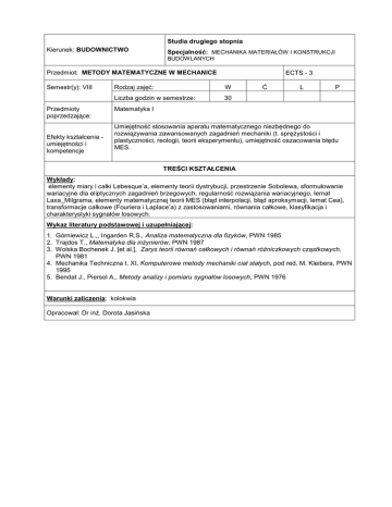 Studia drugiego stopnia Kierunek: BUDOWNICTWO Specjalność: MECHANIKA MATERIAŁÓW I KONSTRUKCJI BUDOWLANYCH Przedmiot: METODY MATEMATYCZNE W MECHANICE Semestr(y): VIII Przedmioty poprzedzające: Efekty kształcenia umiejętności i kompetencje ECTS - 3 Rodzaj zajęć: W Liczba godzin w semestrze: 30 Ć L P Matematyka I Umiejętność stosowania aparatu matematycznego niezbędnego do rozwiązywania zawansowanych zagadnień mechaniki (t. sprężystości i plastyczności, reologii, teorii eksperymentu), umiejętność oszacowania błędu MES. TREŚCI KSZTAŁCENIA Wykłady: elementy miary i całki Lebesque’a, elementy teorii dystrybucji, przestrzenie Sobolewa, sformułowanie wariacyjne dla eliptycznych zagadnień brzegowych, regularność rozwiązania wariacyjnego, lemat Laxa_Milgrama, elementy matematycznej teorii MES (błąd interpolacji, błąd aproksymacji, lemat Cea), transformacje całkowe (Fouriera i Laplace’a) z zastosowaniami, równania całkowe, klasyfikacja i charakterystyki sygnałów losowych. Wykaz literatury podstawowej i uzupełniającej: 1. Górniewicz L.,, Ingarden R.S., Analiza matematyczna dla fizyków, PWN 1985 2. Trajdos T., Matematyka dla inżynierów, PWN 1987 3. Wolska Bochenek J. [et al.], Zarys teorii równań całkowych i równań różniczkowych cząstkowych, PWN 1981 4. Mechanika Techniczna t. XI, Komputerowe metody mechaniki ciał stałych, pod red. M. Kleibera, PWN 1995 5. Bendat J., Piersol A., Metody analizy i pomiaru sygnałów losowych, PWN 1976 Warunki zaliczenia: kolokwia Opracował: Dr inż. Dorota Jasińska