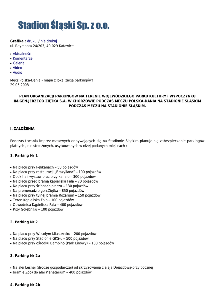 Grafika : drukuj / nie drukuj ul. Reymonta 24/203, 40-029 Katowice ● ● ● ● ● Aktualność Komentarze Galeria Video Audio Mecz Polska-Dania - mapa z lokalizacją parkingów! 29.05.2008 PLAN ORGANIZACJI PARKINGÓW NA TERENIE WOJEWÓDZKIEGO PARKU KULTURY i WYPOCZYNKU IM.GEN.JERZEGO ZIĘTKA S.A. W CHORZOWIE PODCZAS MECZU POLSKA-DANIA NA STADIONIE ŚLĄSKIM PODCZAS MECZU NA STADIONIE ŚLĄSKIM. I. ZAŁOŻENIA Podczas trwania imprez masowych odbywających się na Stadionie Śląskim planuje się zabezpieczenie parkingów płatnych , nie strzeżonych, usytuowanych w niżej podanych miejscach : 1. Parking Nr 1 ● ● ● ● ● ● ● ● ● ● Na placu przy Pelikanach – 50 pojazdów Na placu przy restauracji „Brazyliana” – 100 pojazdów Obok hali wystaw oraz przy kanale – 300 pojazdów Na placu przed bramą kąpieliska Fala – 70 pojazdów Na placu przy ścianach płaczu – 130 pojazdów Na promenadzie gen.Ziętka – 850 pojazdów Na placu przy tylnej bramie Rozarium – 150 pojazdów Teren Kąpieliska Fala – 100 pojazdów Obwodnica Kąpieliska Fala – 400 pojazdów Przy Gołębniku – 100 pojazdów 2. Parking Nr 2 ● ● ● Na placu przy Wesołym Miasteczku – 200 pojazdów Na placu przy Stadionie GKS-u – 500 pojazdów Na placu przy ośrodku Bambino (Park Linowy) – 100 pojazdów 3. Parking Nr 2a ● ● Na alei Leśnej (drodze gospodarczej) od skrzyżowania z aleją Dojazdową(przy bocznej bramie Zoo) do alei Planetarium – 400 pojazdów 4. Parking Nr 2b ● Na promenadzie gen. J. Ziętka od ul Złotej – 400 pojazdów 5. Parking Nr 3 ● Na alei Leśnej (drodze gospodarczej) od skrzyżowania z aleją Klonową (przy wjeździe do ogrodnictwa WPKiW S.A) do Alei Planetarium – 100 autokarów 6. Parking Nr 4 ● Duża łąka , na wprost bazy eksploatacja - 500 pojazdów Łącznie Wojewódzki Park Kultury i Wypoczynku im. Gen. Jerzego Ziętka S.A. w Chorzowie dysponować będzie : ● ● 4350 miejscami dla pojazdów osobowych ( parkingi płatne nie strzeżone) 100 miejscami dla autokarów ( parkingi płatne nie strzeżone) II PLAN ORGANIZACJI PARKINGÓW Podczas trwania imprez masowych odbywających się na Stadionie Śląskim w Chorzowie planuje się następującą organizacje parkingów : 1. Parkingi Nr.1 – na terenie WPKiW S.A. z wjazdem od ulicy Katowickiej (dla pojazdów osobowych). Rozpoczęcie zabezpieczania parkingów przewiduje się na 6 godzin przed rozpoczęciem imprez. Obsługiwany powinien być przez 28 pracowników w tym patrol samochodowy.Wjazd od strony ulicy Katowickiej przy fontannie , natomiast wyjazd w zależności od potrzeb planowany jest na ulice Katowicką przy fontannie oraz na ulicę Złotą w Katowicach ( pojazdy z promenady oraz rozarium). Punkt kasowy umieszczony zostanie na wysokości wjazdu do dyrekcji parku tj. około 50 m od ulicy Katowickiej gdzie po jego przejechaniu pojazdy kierowane będą na poszczególne parkingi, odpowiednio w pierwszej kolejności na place przy gołębniku, ścianach płaczu, przy Pelikanach, obok hali wystaw, obok restauracji Brazyliana, na kąpielisku, plac przy kąpielisku, na promenadę gen. Ziętka. Samochody po zakończeniu imprez opuszczać będą teren parkingów zgodnie z kierunkami wyjazdu, pracownicy zostaną rozstawieni do kierowania pojazdów pomagając sprawnie rozładować ruch pojazdów. 2. Parkingi Nr.2 – na terenach WPKiW S.A z wjazdem od ulicy Złotej ( dla pojazdów osobowych). Rozpoczęcie zabezpieczania parkingów planuje się na 6 godzin przed rozpoczęciem imprezy. Obsługiwany powinien być przez ośmiu pracowników. Wjazd na parkingi od strony ulicy złotej, natomiast wyjazd w przeciwnym kierunku. Punkty kasowe rozmieszczone zostaną bezpośrednio przy wjeździe na parkingi gdzie po ich przejechaniu pojazdy kierowane będą na wolne miejsca parkingowe odpowiednio przy Wesołym Miasteczku, przy stadionie GKS-u na koniec przy ośrodku Bambino. Pracownicy rozstawieni zostaną na parkingach gdzie sprawnie powinni rozładować ruch pojazdów. 3. Parking Nr. 2a – na terenach WPKiW S.A. z wjazdem od ulicy Złotej ( dla pojazdów osobowych). Zlokalizowany na alei Leśnej(drodze gospodarczej) od strony ulicy Złotej do skrzyżowania z aleją Planetarium. Parking , napełniany zostanie dopiero po otrzymaniu sygnału od służb miejskich zajmujących się regulowaniem ruchu kołowego na ulicach wokół WPKiW S.A. Wjazd na parking od strony ulicy Złotej, natomiast wyjazd w kierunku ulicy Bytkowskiej. Parking obsługiwany powinien być przez 7 pracowników zabezpieczonych pojazdem interwencyjnym, kierowanym w odpowiednie miejsca. Punkty kasowe zostaną umieszczone na alei Dojazdowej gdzie po ich przejechaniu pojazdy kierowane zostaną na miejsca parkingowe usytuowane na alei Leśnej. 4. Parkingi Nr.2b – na terenach WPKiW S.A z wjazdem od ulicy Złotej ( dla pojazdów osobowych). Rozpoczęcie zabezpieczania parkingów planuje się na 6 godzin przed rozpoczęciem imprezy. Obsługiwany powinien być przez siedmiu pracowników. Wjazd na parkingi od strony ulicy złotej, natomiast wyjazd w przeciwnym kierunku. Punkty kasowe rozmieszczone zostaną bezpośrednio przy wjeździe na parkingi gdzie po ich przejechaniu pojazdy kierowane będą na wolne miejsca parkingowe odpowiednio ustawiając do późniejszego wyjazdu na ul.Złotą. Pracownicy rozstawieni zostaną na parkingach gdzie sprawnie powinni rozładować ruch pojazdów. 5. Parkingi Nr.3 – na trenach WPKiW S.A z wjazdem od ulicy Siemianowickiej (dla autokarów). Zlokalizowany na alei Leśnej(drodze gospodarczej) Parking napełniany będzie od ulicy Siemianowickiej , obsługiwany powinien być przez 6 pracowników . Punkt kasowy zostanie umieszczony za skrzyżowaniem wyznaczającym początek parkingu w sposób umożliwiający oczekiwanie dla 3 autokarów tak aby nie blokować przejazdu w kierunku alei Klonowej. Po zapełnieniu parkingów będą dozorowane przez w/w pracowników. Wyjazd zorganizowany będzie w kierunku ul. Bytkows