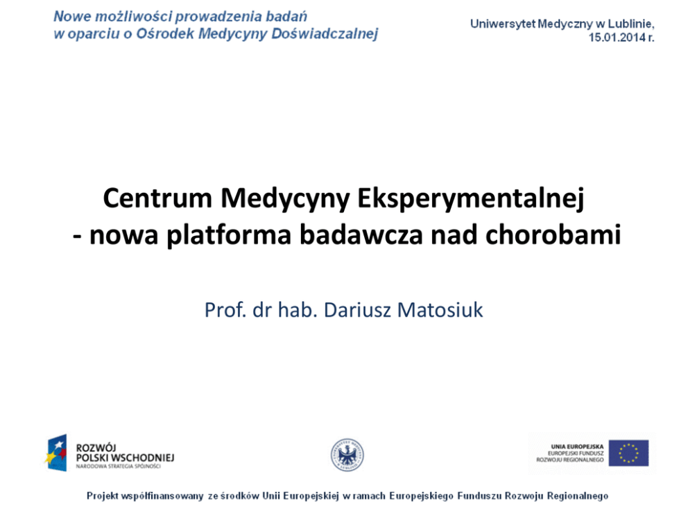 Centrum Medycyny Eksperymentalnej - nowa platforma badawcza nad chorobami Prof. dr hab. Dariusz Matosiuk Medycyna Eksperymentalna – doświadczalny aspekt badań medycznych; metod, procedur, urządzeń, leków i substancji bioaktywnych; diagnostyka – markery; molekularne podstawy chorób; modele chorób; Farmakologia, Biologia Molekularna, Genetyka Medycyna Eksperymentalna a Farmakologia. Trochę historii. Ludzie prymitywni – obserwacje zwierząt. William Withering (1741-1799) - odkrycie działania naparstnicy i zastosowanie w leczeniu dusznicy i zawałów (1785) Medycyna Eksperymentalna a Farmakologia. Trochę historii. Badania na zwierzętach. Friedrich W. A. Serturner (1783 - 1841) - izolacja morfiny (1804) pierwszego alkaloidu badanie aktywności (cztery osoby). Medycyna Eksperymentalna a Farmakologia. Trochę historii. Inne związki bioaktywne: atropina (1833, Grieger i Hessie); epinefryna (1895, Cybulski); acetylocholina (1906, Hunt); histamina (1907, Vogt); sulfanilamid (1908, Gleno); oksytocyna (1919, Abel); insulina (1922, Banting i Best); penicyliny (1928, Flemming); sulfonamidy (1932, Domagk); streptomycyna (1944, Waksman); tetracykliny (1948, Duggar) Medycyna Eksperymentalna a Farmakologia. Trochę historii. Ludzie: Hipokrates (460-377 bc), Galen (129-217), Avicenna (980-1027), Paracelsus (1493-1541), Medycyna Eksperymentalna a Farmakologia. Trochę historii. Ludzie: Fransois Magendie (1783-1855), Claude Bernard (1813-1878) – glikogen, sok trzustkowy, CO we krwi, skurcze naczyń, działanie kurary Rudolf Buchheim (1820-1879) - bioasei pierwsze laboratorium farmakologiczne w Dorpat, Estonia, 1860) Medycyna Eksperymentalna a Farmakologia. Trochę historii. Ludzie: Oswald Schmiedeberg (1838-1921) - ojciec współczesnej farm., Outline of Pharmacology (1878), uretan jako hipnotyk (1885) Thomas L. Brunton (1844-1916) – Textbook on Pharmacology Therapeutics and Materia Medica (1885) John J. Abel (1857-1938) – twórca amerykańskiej farmakologii, założyciel J. Pharmacol. Exp. Therapetics (1909) Medycyna Eksperymentalna a Biologia Molekularna. Paul Ehrlich (1854-1915) – twórca koncepcji receptorowej (1907) Henry H. Dale (1875-1968) – receptory nikotynowe i muskarynowe (1914) Medycyna Eksperymentalna a Biologia Molekularna. Raymond Ahlquist (1914-1983) – różne receptor amin (1948) Julius Axelrod (1912-2004) – acetanilid prolekiem (1948) Medycyna Eksperymentalna a Biologia Molekularna. Nagrody Nobla 2012 – GPCR’y Brian Kobilka (1955- ) Robert J. Lefkovitz (1943- ) 2009 – struktura i funkcje rybosomu V. Ramakrishnan (1952- ) Thomas Steitz (1940- ) Ada Yonath (1939- ) Medycyna Eksperymentalna a Biologia Molekularna. Nagrody Nobla 2008 – białka zielonej fluorescencji Osamu Shimomura (1928- ) Martin Chalfie (1947- ) Roger Y. Tsien (1952-) 2003 – kanały jonowe w błonach kom. Peter Agre (1949- ) Roderick McKinnon (1956- ) Medycyna Eksperymentalna a Genetyka. Genetyka molekularna DNA – F. Miescher (1869) struktura DNA – J. Watson, F. Crieck, R. Franklin (NN 1962) Projekt HUGO (1990-2003) 2003 – 99% odczytane mikromacierze genomika, proteomika, metabolomika, knock-out’y, transgenetyka Dziękuję Bardzo za Uwagę!