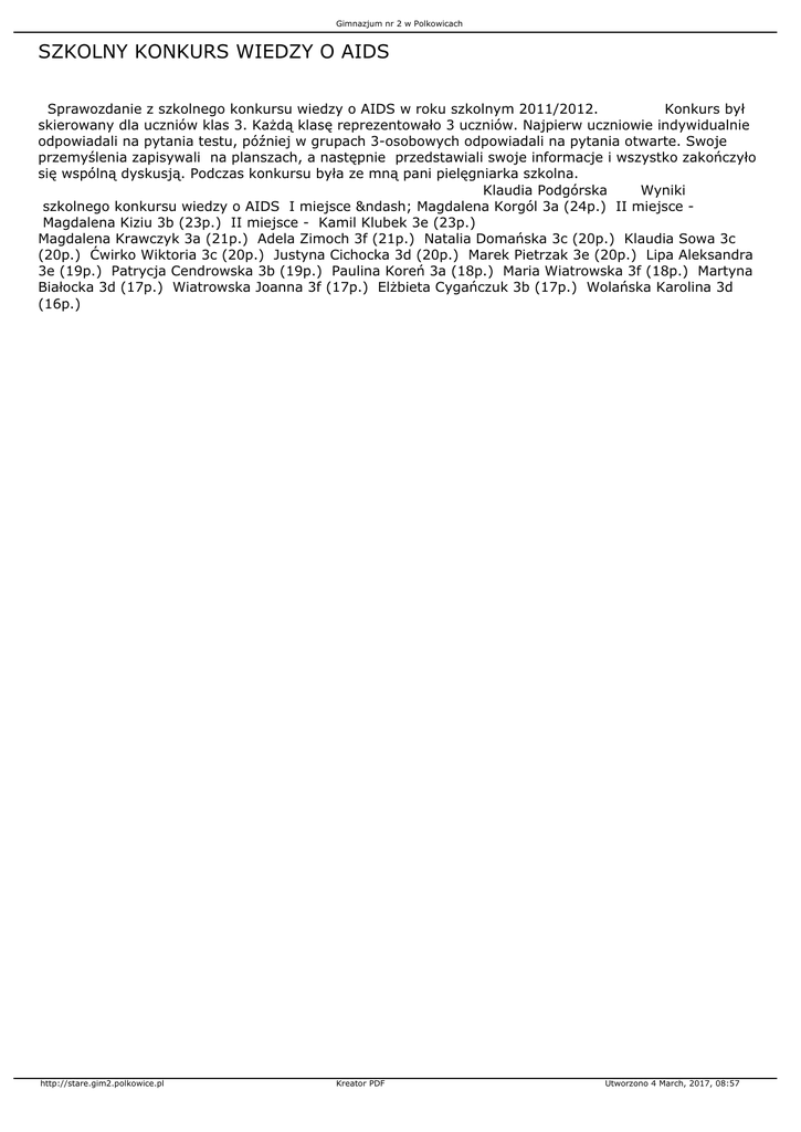 szkolny konkurs wiedzy o aids - Gimnazjum nr 2 w Polkowicach