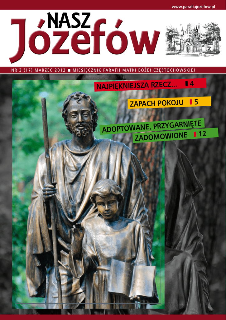Józefów NASZ Nr 3 (17) Marzec 2012 www.parafiajozefow.pl M i e s i ę c z n i k pa r a f i i M at k i B o ż e j C z ę s t o c h o w s k i e j najpiękniejsza rzecz... ❚4 Zapach pokoju ❚ 5 iĘte n r a g y z r P , e n a Adoptow ❚ 12 zadomowione Świ ę ci w n a sz y m ko Ś cie le Człowiek, który zawsze pragnàł dobrem zwyci´˝aç zło Grzegorz Jakubowski B Błogosławiony ks. Jerzy Popiełuszko urodził się 14 IX 1947 r. we wsi Okopy koło Suchowoli na Podlasiu. 28 maja 1972 roku przyjął święcenia z rąk ks. Kard. Stefana Wyszyńskiego. Na obrazku prymicyjnym zapisał znamienne słowa: „Posyła mnie Bóg, abym głosił Ewangelię i leczył rany zbolałych serc”. Dniem przełomowym w jego życiu okazał się 31 grudnia 1980 roku. Była to niedziela. Delegacja strajkujących hutników poprosiła wówczas Prymasa Wyszyńskiego, aby do huty przybył kapłan. Kapelan księdza Prymasa skierował zatem swe kroki do kościoła pw. Św. Stanisława Kostki. Ksiądz Czarnota, który jako pierwszy otrzymał propozycję nie mógł odpowiedzieć na zaproszenie, gdyż właśnie przygotowywał się do odprawiania Mszy Św. Wtedy zgłosił się z własnej inicjatywy ksiądz Jerzy. I tak to pierwsze spotkanie rozpoczęło wielką duchową przyjaźń hutników z księdzem Jerzym. Przyjaźń, która trwała aż do końca i sięgnęła poza horyzont śmierci. Od tej pory ksiądz Jerzy uczestniczył we wszystkim, co było radością czy smutkiem hutników. Był też dla nich wielkim moralnym oparciem. Od 28 lutego 1982 r. celebrował Msze Św. za Ojczyznę i wygłaszał kazania patriotyczno-religijne (było ich razem 26), w których przez pryzmat Ewangelii i nauki Kościoła, interpretował moralny wymiar bolesnej współczesności w swojej Ojczyźnie. Działalność ks. Jerzego sprawiała, że stał się on celem niewybrednych ataków władz, które następnie przekształciły się w niekończące się prześladowania. Coraz częściej dochodziło do zdarzeń mających służyć zastraszeniu powszechnie szanowanego kapłana. Zdarzeń, które mogły wskazywać, że jego życie jest zagrożone. Sytuacja ks. Jerzego była coraz trudniejsza. Wierzył on wprawdzie nieustająco w sens swej posługi, ale czuł się zmęczony nieprzerwanymi atakami. Przeczuwał, że grozi mu śmierć. 19 października 1984 roku wraz z kierowcą Waldemarem Chrostowskim przyjechał do Bydgoszczy. O godzinie 18.00 odprawił nabożeństwo różańcowe i Mszę św. w kościele Świętych Polskich Braci Męczenników. O godz. 22.00 w drodze do Warszawy, w okolicach miejscowości Przysiek koło Torunia został uprowadzony przez urzędników Ministerstwa Spraw Wewnętrznych. Bestialsko skatowany i okrutnie skrępowany, został zamknięty przez oprawców w bagażniku samochodu i przewieziony w okolicę tamy włocławskiej. Ciało wrzucono do Zalewu Wiślanego. Tak zginął człowiek, który nigdy nie chował w sercu niechęci do swoich prześladowców. Człowiek, który zawsze pragnął dobrem zwyciężać zło. Grób ks. Jerzego Popiełuszki znajduje się przed kościołem św. Stanisława Kostki w Warszawie. Jest on od lat 80. XX wieku celem licznych pielgrzymek i oficjalnych wizyt, m.in. 14 czerwca 1987 roku modlił się przy nim papież Jan Paweł II. W naszej parafii możemy w sposób szczególny przypominać sobie tę piękną postać modląc się w kaplicy przed obrazem błogosławionego księdza Jerzego i oddawać cześć jego relikwiom. Poświecenia tej kaplicy dokona dnia 18 marca 2012 roku nasz bp ordynariusz Henryk Hoser. Ogłoszenie ks. Popiełuszki błogosławionym Kościoła katolickiego odbyło się 6 czerwca 2010 r. na placu Piłsudskiego w Warszawie. Od chwili włączenia ks. Jerzego do grona błogosławionych możemy oficjalnie modlić się wzywając Jego wstawiennictwa, dziękować Bogu za jego święte życie i męczeństwo. Boże, Źródło wszelkiego dobra, dziękuję Ci, że w swojej miłości obdarzyłeś błogosławionego ks. Jerzego Popiełuszkę godnością kapłaństwa. Posłałeś Go, aby gorliwie głosił Twoje słowo, szafował świętymi sakramentami, mężnie działał w Twoje Imię i zawsze był blisko każdego człowieka wzywając do przebaczenia, jedności i pokoju. Ty obdarzyłeś Go łaską męczeństwa, przez co upodobnił się do Chrystusa na drodze krzyżowej. Uwielbiamy i dziękujemy Ci, Panie, za ten wielki dar dla Kościoła, szczególnie za to, że uczyniłeś go pośrednikiem w rozdawnictwie łask. W swoim nieskończonym miłosierdziu racz zaliczyć Go w poczet świętych, a mnie, za jego wstawiennictwem udziel łaski ......., o którą z ufnością Ciebie proszę. Przez Chrystusa, Pana naszego. Amen. SIOSTRY DOMINIKANKI MISJONARKI Nasz Józefów świętuje w tym roku 50-lecie praw miejskich. Jednocześnie w marcu wspominamy św. Józefa, patrona naszego miasta. W tym roku mamy zaszczyt gościć ordynariusza diecezji warszawsko-praskiej abp. Henryka Hosera, który poświęci nową kaplicę ks. Jerzego Popiełuszki. Postać księdza Jerzego jest już na stałe powiązana z Józefowem. Po pierwsze za sprawą kultu, jakim otaczamy relikwie błogosławionego. Po drugie za sprawą księdza proboszcza, który jest bliskim krewnym ks. Jerzego. Po trzecie, za sprawą kręgu wędrowników Skautów Europy, którzy właśnie ks. Jerzego obrali za swojego patrona, jeszcze przed jego beatyfikacją. I w końcu także dzięki idei, która zrodziła się w redakcji „Naszego Józefowa” by osobę ks. Jerzego upamiętnić w przestrzeni publicznej Józefowa. Gdy zbieraliśmy podpisy pod wnioskiem do władz miasta by nadać imię bł. ks. Jerzego Popiełuszki rondu u zbiegu ulicy Granicznej i Piłsudskiego, bardzo często słyszeliśmy: „ks. Jerzy to mój ksiądz” albo „ uformowały mnie jego Msze za ojczyznę”. Okazało się, że dla wielu mieszkańców Józefowa ks. Jerzy jest postacią bardzo bliską. Wszystkim z Państwa, którzy włączyliście się w akcję zbierania podpisów