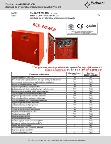 Pulsar Zasilacz serii EN54/LCD Zasilacz do systemów przeciwpożarowych 27,6V DC KOD: TYP: EN54-7A28LCD v.1.0/III PL EN54 27,6V/7A/2x28Ah/LCD zasilacz do systemów przeciwpożarowych RED POW ER 1438 Certyfikat stałości właściwości użytkowych CNBOP-PIB Nr 1438-CPR-0385 Świadectwo dopuszczenia CNBOP-PIB Nr 2174/2014 “Ten produkt jest odpowiedni do systemów zaprojektowanych zgodnie z normami PN-EN 54-4 i PN-EN 12101-10” Wymagania funkcjonalne Sygnalizacja braku sieci EPS Dwa niezależne wyjścia zasilacza zabezpieczone przed zwarciem Kompensacja temperaturowa napięcia ładowania baterii Pomiar rezystancji obwodu baterii Sygnalizacja niskiego napięcia baterii Zabezpieczenie baterii przed całkowitym rozładowaniem Zabezpieczenie zacisków baterii przed zwarciem Sygnalizacja przepalenia bezpiecznika baterii Sygnalizacja uszkodzenia obwodu ładowania Sygnalizacja niskiego napięcia wyjściowego Sygnalizacja wysokiego napięcia wyjściowego Sygnalizacja uszkodzenia zasilacza Zabezpieczenie przed przepięciem Zabezpieczenie przed zwarciem Zabezpieczenie przed przeciążeniem Wyjście awarii zbiorczej ALARM Wyjście techniczne EPS Wyjście techniczne APS Wyjście techniczne PSU Wejście sygnału awarii zewnętrznej EXTi Sterowane wyjście przekaźnikowe EXTo Zdalny test akumulatorów Pomiar napięcia sieci zasilającej 230V AC Sygnalizacja optyczna LCD Tamper otwarcia obudowy Wymagania wg norm Zasilacz EN54-7A28LCD TAK TAK TAK TAK TAK TAK TAK TAK TAK TAK TAK TAK TAK TAK TAK TAK TAK TAK - TAK TAK TAK TAK TAK TAK TAK TAK TAK TAK TAK TAK TAK TAK TAK TAK TAK TAK TAK TAK TAK TAK TAK TAK TAK Tel. +48-14-610-19-40, fax: +48-14- 610-19-50, www.pulsar.pl, e-mail: [email protected] ® Pulsar Zasilacz serii EN54/LCD Zasilacz do systemów przeciwpożarowych 27,6V DC Cechy zasilacza: · zgodność z wymaganiami norm PN-EN 54-4, PN-EN12101-10 oraz pkt. 12.2 wg Rozp.MSWiA z dn.20.06.2007 · bezprzerwowe zasilanie 27,6V DC/ 7A · miejsce na akumulatory 2x28Ah/12V · niezależnie zabezpieczone wyjścia zasilacza AUX1 i AUX2 · wysoka sprawność 82% · niski poziom tętnień napięcia · mikroprocesorowy system automatyki · inteligentna ochrona zasilacza w stanie przeciążenia · pomiar rezystancji obwodu akumulatorów · automatyczna kompensacja temperaturowa ładowania akumulatorów · test akumulatorów · dwufazowy proces ładowania akumulatorów · funkcja przyspieszonego ładowania akumulatorów · kontrola ciągłości obwodu akumulatorów · kontrola napięcia akumulatorów · kontrola stanu bezpiecznika akumulatorów · kontrola ładowania i konserwacji akumulatorów · ochrona akumulatorów przed nadmiernym rozładowaniem (UVP) · ochrona akumulatorów przed przeładowaniem · zabezpieczenie wyjścia akumulatorów przed zwarciem i odwrotnym podłączeniem · kontrola prądu obciążenia · kontrola napięcia wyjściowego · kontrola stanu bezpieczników wyjść AUX1 i AUX2 · pomiar napięcia sieci zasilającej 230V AC · port komunikacyjny „SERIAL” z zaimplementowanym protokołem MODBUS RTU · darmowy program “PowerSecurity” do monitorowania parametrów pracy zasilacza · zdalny monitoring (opcja: WiFi, Ethernet, RS485, USB) · zdalny test akumulatorów (wymagane dodatkowe moduły) · współpraca z modułami bezpiecznikowymi EN54LB4 i EN54-LB8 (opcjonalnie) · optyczna sygnalizacja przeciążenia zasilacza OVL · sygnalizacja akustyczna awarii · wybór czasu sygnalizacji zaniku sieci 230V AC · wyjście awarii zbiorczej ALARM · wejście awarii zbiorczej EXTi · sterowane wyjście przekaźnikowe EXTo · wejścia/wyjścia techniczne z izolacją galwaniczną · wyjście techniczne EPS sygnalizacji zaniku sieci 230V AC · wyjście techniczne PSU sygnalizacji awarii zasilacza · wyjście techniczne APS sygnalizacji awarii akumulatorów · wewnętrzna pamięć stanu pracy zasilacza · sygnalizacja optyczna - panel LCD · wskazania parametrów elektrycznych, np.: napięcie, prąd, rezystancja obwodu, napięcie sieci zasilającej 230V AC · sygnalizacja awarii · konfiguracja ustawień zasilacza z poziomu panelu · 2 poziomy dostępu zabezpieczone hasłami · historia pracy zasilacza · historia awarii · zegar czasu rzeczywistego z podtrzymaniem bateryjnym · zabezpieczenia: · przeciwzwarciowe SCP · przeciążeniowe OLP · termiczne OHP · nadnapięciowe OVP · przepięciowe · antysabotażowe: otwarcie obudowy TAMPER · zamykanie obudowy - zamek · chłodzenie konwekcyjne · gwarancja - 5 lat od daty produkcji Opis ogólny Zasilacz buforowy przeznaczony jest do bezprzerwowego zasilania urządzeń sygnalizacji pożarowej, systemów kontroli rozprzestrzeniania dymu i ciepła oraz urządzeń przeciwpożarowych i automatyki pożarowej wymagających stabilizowanego napięcia 24V DC (±15%). Zasilacz wyposażony jest w dwa niezależnie zabezpieczone wyjścia AUX1 i AUX2 które dostarczają napięcia 27,6V DC o sumarycznej wydajności prądowej: Praca ciągła Prąd wyjściowy Imax a=5,5A Praca chwilowa Prąd wyjściowy Imax b=7A W przypadku zaniku napięcia sieciowego następuje bezprzerwowe przełączenie na źródło zasilania rezerwowego w postaci akumulatorów. Zasilacz umieszczony jest w obudowie metalowej (kolor RAL 3001 - czerwony) z miejscem na akumulatory 2x28Ah/12V. Zasilacz współpracuje z bezobsługowymi akumulatorami kwasowo-ołowiowymi wykonanymi w technologii AGM lub żelowej. Tel. +48-14-610-19-40, fax: +48-14- 610-19-50, www.pulsar.pl, e-mail: [email protected] ® Pulsar Zasilacz serii EN54/LCD Zasilacz do systemów przeciwpożarowych 27,6V DC Klasa funkcjonalna PN-EN 12101-10:2007 Napięcie zasilania Pobór prądu Częstotliwość zasilania Moc zasilacza Sprawność Napięcie wyjściowe w 20 ºC Prąd wyjściowy Maksymalna rezystancja obwodu akumulatorów Napięcie tętnienia Pobór prądu na potrzeby własne zasilacza podczas pracy bateryjnej Prąd ładowania akumulatorów Współczynnik kompensacji temperaturowej napięcia akumulatorów Sygnalizacja niskiego napię