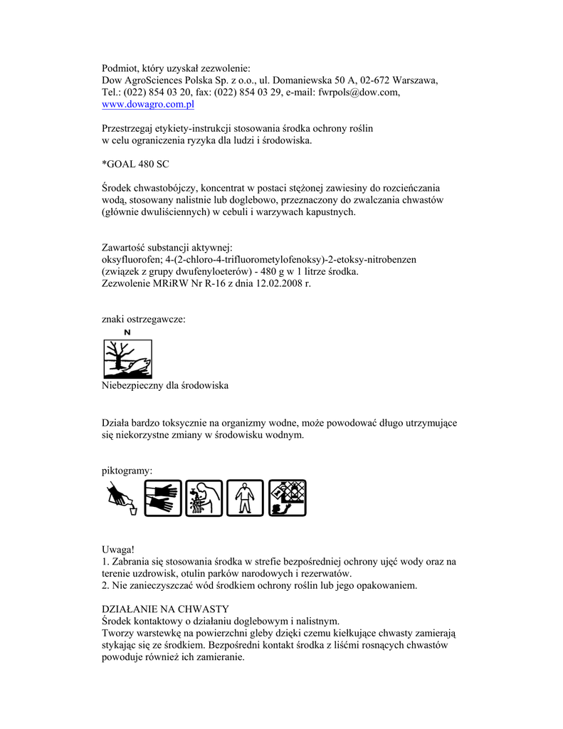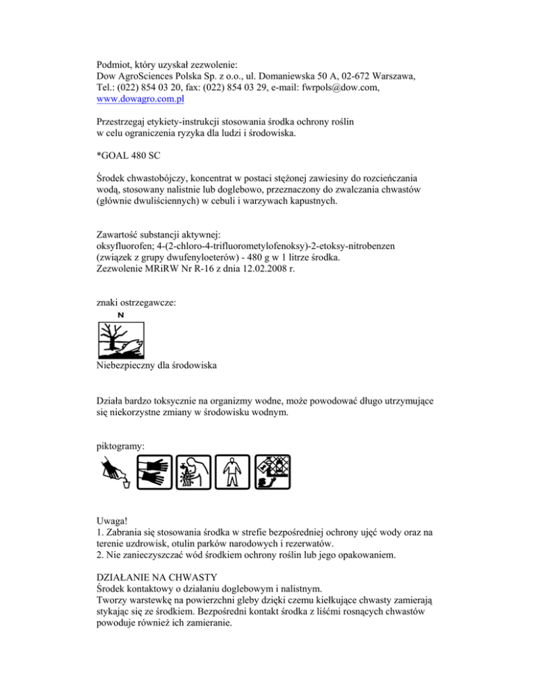 Podmiot, który uzyskał zezwolenie: Dow AgroSciences Polska Sp. z o.o., ul. Domaniewska 50 A, 02-672 Warszawa, Tel.: (022) 854 03 20, fax: (022) 854 03 29, e-mail: [email protected], www.dowagro.com.pl Przestrzegaj etykiety-instrukcji stosowania środka ochrony roślin w celu ograniczenia ryzyka dla ludzi i środowiska. *GOAL 480 SC Środek chwastobójczy, koncentrat w postaci stężonej zawiesiny do rozcieńczania wodą, stosowany nalistnie lub doglebowo, przeznaczony do zwalczania chwastów (głównie dwuliściennych) w cebuli i warzywach kapustnych. Zawartość substancji aktywnej: oksyfluorofen; 4-(2-chloro-4-trifluorometylofenoksy)-2-etoksy-nitrobenzen (związek z grupy dwufenyloeterów) - 480 g w 1 litrze środka. Zezwolenie MRiRW Nr R-16 z dnia 12.02.2008 r. znaki ostrzegawcze: Niebezpieczny dla środowiska Działa bardzo toksycznie na organizmy wodne, może powodować długo utrzymujące się niekorzystne zmiany w środowisku wodnym. piktogramy: Uwaga! 1. Zabrania się stosowania środka w strefie bezpośredniej ochrony ujęć wody oraz na terenie uzdrowisk, otulin parków narodowych i rezerwatów. 2. Nie zanieczyszczać wód środkiem ochrony roślin lub jego opakowaniem. DZIAŁANIE NA CHWASTY Środek kontaktowy o działaniu doglebowym i nalistnym. Tworzy warstewkę na powierzchni gleby dzięki czemu kiełkujące chwasty zamierają stykając się ze środkiem. Bezpośredni kontakt środka z liśćmi rosnących chwastów powoduje również ich zamieranie. Chwasty wrażliwe np.: fiołek polny, gorczyca polna, jasnota różowa, komosa biała, pokrzywa żegawka, przetaczniki, przytulia czepna, rdesty, szarłat szorstki, tasznik pospolity, tobołki polne. Chwasty średnio wrażliwe np.: chwastnica jednostronna, żółtlica drobnokwiatowa. Chwasty odporne np.: gwiazdnica pospolita, mlecz polny. ZAKRES STOSOWANIA, TERMINY I DAWKI Rośliny warzywne- cebula z siewuŚrodek można stosować: 1. w dawkach dzielonych: trzykrotnie, w dawce 0,05 l/ha - pierwszy zabieg w fazie 1-2 liści cebuli, drugi zabieg w 7-10 dni po pierwszym zabiegu, trzeci zabieg w 7-10 po drugim zabiegu W celu zwiększenia spektrum zwalczanych gatunków chwastów a szczególnie zwalczenia ostrożenia polnego Goal 480 SC można stosować łącznie ze środkiem Lontrel 300 SL w dawce: I zabieg - Goal 480 SC 0,05 l/ha + Lontrel 300 SL 0,1 l/ha II zabieg - Goal 480 SC 0,05 l/ha + Lontrel 300 SL 0,15 l/ha III zabieg - Goal 480 SC 0,05 l/ha + Lontrel 300 SL 0,15 l/ha dwukrotnie, pierwszy zabieg w fazie 2 liści cebuli w dawce 0,1 l/ha, zabieg powtórzyć po 10 dniach stosując dawkę 0,15 l/ha Uwaga Środek w dawkach dzielonych (0,05-0,15 l/ha) stosować tylko na chwasty w fazie liścieni do fazy 1 pary liści, najlepiej uzupełniająco po innych herbicydach zastosowanych wcześniej. 2. jednorazowo od fazy 3-4 liści cebuli -Zalecana dawka: 0,25 l/ha. 3. W przypadku silnego zachwaszczenia plantacji środek stosować od fazy 3 liści cebuli w dawce 0,25 l/ha i po dwóch tygodniach wykonać drugi zabieg stosując dawkę 0,25 l/ha. - cebula z dymki. Opryskiwać do 5 dni po posadzeniu dymki. -Zalecana dawka: 0,5-0,75 l/ha. Uwagi: 1. Środek można stosować w różnych fazach rozwojowych chwastów, najlepiej od wschodów do okresu gdy rośliny mają około 5-7 cm wysokości. Opryskiwać tylko suche rośliny, w dobrej kondycji, po 3-4 dniach słonecznych, w temperaturze nie wyższej niż 23oC. Środek stosowany w tym terminie powoduje zazwyczaj przemijające uszkodzenia liści, dlatego zabieg najlepiej wykonywać tak, aby możliwie jak najmniejsza ilość środka przedostała się na liście cebuli. 2. Goal 480 SC można stosować także w przypadku słabego działania wcześniej zastosowanych herbicydów lub w przypadku, gdy chwasty są zbyt wyrośnięte i mało wrażliwe na inne herbicydy. 3. Środek może powodować placowe odbarwienie liści cebuli z lekkim skręceniem oraz wyłożeniem szczypioru. Objawy te ustępują po około 14 dniach od zabiegu. - kapusta głowiasta (biała, czerwona, włoska), kalafior -Zalecana dawka: 0,5-0,75 l/ha. Opryskiwać pole przygotowane do sadzenia bezpośrednio przed sadzeniem rozsady. Nie mieszać środka z glebą. Zalecana ilość wody: 200-300 l/ha. Zalecane opryskiwanie: średniokropliste. PRZECIWWSKAZANIA Środka nie stosować:- na rośliny mokre lub uszkodzone,2. Podczas stosowania środka nie dopuścić do: - znoszenia cieczy użytkowej na sąsiadujące plantacje roślin uprawnych - nakładania się cieczy użytkowej na stykach pasów zabiegowych i uwrociach. OKRES PREWENCJI DLA LUDZI, ZWIERZĄT, PSZCZÓŁ (okres zapobiegający zatruciu): NIE DOTYCZY OKRES KARENCJI (okres od dnia wykonania ostatniego zabiegu do dnia zbioru roślin przeznaczonych do konsumpcji): NIE DOTYCZY NASTĘPSTWO ROŚLIN Środek nie stwarza zagrożenia dla roślin uprawianych następczo pod warunkiem wykonania uprzednio orki. W przypadku konieczności wcześniejszego zaorania plantacji w wyniku uszkodzenia roślin przez mrozy, szkodniki lub choroby na polu tym można uprawiać wszystkie rośliny. SPORZĄDZANIE CIECZY UŻYTKOWEJ Przed przystąpieniem do sporządzania cieczy użytkowej dokładnie ustalić potrzebną jej ilość. Odmierzoną ilość środka wlać do zbiornika opryskiwacza napełnionego częściowo wodą (z włączonym mieszadłem) i uzupełnić wodą do potrzebnej ilości. W przypadku stosowania środka Goal 480 SC ze środkiem Lontrel 300 SL przygotować ciecz użytkową środka Goal 480 SC w połowie wymaganej ilości wody, dodać Lontrel 300 SL i uzupełnić wodą do wymaganej ilości. Po wlaniu środka do zbiornika opryskiwacza nie wyposażonego w mieszadło hydrauliczne ciecz w zbiorniku mechanicznie wymieszać. Opróżnione opakowania przepłukać trzykrotnie wodą, a popłuczyny wlać do zbiornika opryskiwacza z cieczą użytkową. W przypadku przerw w opryskiwaniu przed ponownym przystąpieniem do pracy dokładnie wymieszać ciecz użytkową w zbiorniku opryskiwacza. Po pracy aparaturę dok