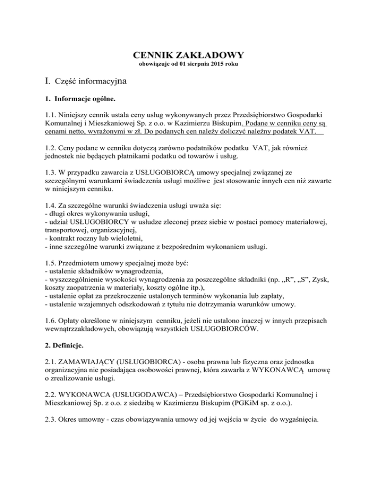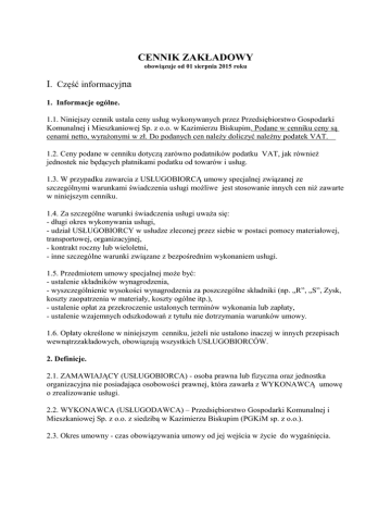 CENNIK ZAKŁADOWY obowiązuje od 01 sierpnia 2015 roku I. Część informacyjna 1. Informacje ogólne. 1.1. Niniejszy cennik ustala ceny usług wykonywanych przez Przedsiębiorstwo Gospodarki Komunalnej i Mieszkaniowej Sp. z o.o. w Kazimierzu Biskupim. Podane w cenniku ceny są cenami netto, wyrażonymi w zł. Do podanych cen należy doliczyć należny podatek VAT. 1.2. Ceny podane w cenniku dotyczą zarówno podatników podatku VAT, jak również jednostek nie będących płatnikami podatku od towarów i usług. 1.3. W przypadku zawarcia z USŁUGOBIORCĄ umowy specjalnej związanej ze szczególnymi warunkami świadczenia usługi możliwe jest stosowanie innych cen niż zawarte w niniejszym cenniku. 1.4. Za szczególne warunki świadczenia usługi uważa się: - długi okres wykonywania usługi, - udział USŁUGOBIORCY w usłudze zleconej przez siebie w postaci pomocy materiałowej, transportowej, organizacyjnej, - kontrakt roczny lub wieloletni, - inne szczególne warunki związane z bezpośrednim wykonaniem usługi. 1.5. Przedmiotem umowy specjalnej może być: - ustalenie składników wynagrodzenia, - wyszczególnienie wysokości wynagrodzenia za poszczególne składniki (np. „R”, „S”, Zysk, koszty zaopatrzenia w materiały, koszty ogólne itp.), - ustalenie opłat za przekroczenie ustalonych terminów wykonania lub zapłaty, - ustalenie wzajemnych odszkodowań z tytułu nie dotrzymania warunków umowy. 1.6. Opłaty określone w niniejszym cenniku, jeżeli nie ustalono inaczej w innych przepisach wewnątrzzakładowych, obowiązują wszystkich USŁUGOBIORCÓW. 2. Definicje. 2.1. ZAMAWIAJĄCY (USŁUGOBIORCA) - osoba prawna lub fizyczna oraz jednostka organizacyjna nie posiadająca osobowości prawnej, która zawarła z WYKONAWCĄ umowę o zrealizowanie usługi. 2.2. WYKONAWCA (USŁUGODAWCA) – Przedsiębiorstwo Gospodarki Komunalnej i Mieszkaniowej Sp. z o.o. z siedzibą w Kazimierzu Biskupim (PGKiM sp. z o.o.). 2.3. Okres umowny - czas obowiązywania umowy od jej wejścia w życie do wygaśnięcia. 2.4. Dzień roboczy - nieświąteczny dzień tygodnia od poniedziałku do piątku. 2.5. Zlecenie ustne - zamówienie telefoniczne lub osobiste krótkotrwałej usługi, której wykonanie nie wymaga zawarcia umowy w formie pisemnej np. jednorazowy wywóz nieczystości stałych, płynnych, transport, roboty ziemne. II. Część cennikowa. Rodzaj usługi i ceny: 1. Roboty ziemne i załadunkowe koparko ładowarką CASE 380 E: - za 1 godz. pracy - 85,00 zł - za dojazd - 85,00 zł za m-g 2. Roboty ziemne i załadunkowe oraz pługiem odśnieżnym koparko ładowarką CASE 380 E: - za 1 godz. pracy – 85,00 zł - za dojazd - 85,00 zł za m-g - przełożenie pługa na usługę jednorazową – 100,00 zł za godz 3. Roboty wyburzeniowe koparko ładowarką z młotem CASE 380 E : - za 1 godz. pracy - 125,00 zł - za dojazd - 85,00 zł za m-g 4. Równiarką drogową : - za 1 godz. pracy - 150,00 zł - za dojazd - 85,00 zł za m-g 5. Transport ciągnikiem URSUS z jedną przyczepą : - za 1 godz. pracy - 75,00 zł - za dojazd - 75,00 zł za m-g 6. Transport ciągnikiem URSUS z dwoma przyczepami : - za 1 godz. pracy - 95,00 zł - za dojazd - 75,00 zł za m-g 7. Ciągnik URSUS z kosiarką bijakową : - za 1 godz. pracy - 120,00 zł - za dojazd - 75,00 zł za m-g - za ścięcie 1 km pobocza drogi (obustronnie) – 120,00 zł - za ścięcie 1m2 trawy – 0,08 zł 7a. Ciągnik Ursus z rębakiem : - za 1 godzinę pracy – 85,00 zł. 8. Kosiarka ręczna spalinowa lub elektryczna do koszenia trawy (z pracownikiem): - za 1 godz. – 35,00 zł 9. Transport samochodem ciężarowym do 10ton : - za 1 km - 4,00 zł ; - za 1 godz. - 90,00 zł 10. Transport samochodem ciężarowym od 10 do 15 ton : - za 1 km - 4,50 zł ; - za 1 godz. - 100,00 zł 11.Transport samochodem ciężarowym od 15 do 20 ton : - za 1 km - 5,00 zł ; - za 1 godz. - 120,00 zł 12. Piła do cięcia nawierzchni bitumicznych : - za 1 mb - 8,00 zł ; - za 1 godz. - 125,00 zł 13. Płyta wibracyjna (zagęszczarka mała chodnikowa) : - za 1 godz. - 35,00 zł 14. Płyta wibracyjna (zagęszczarka duża do wykopów) : - za 1 godz. - 50,00 zł 15. Walec do zagęszczania wykopów i podbudowy drogowej : - za 1 godz. - 100,00 zł 16. Wózek widłowy : - za 1 godz. - 60,00 zł 17. Wywóz nieczystości płynnych beczką asenizacyjną : - za 1 m3 - 20,00 zł 18. Przyjmowanie ścieków do zlewni : - za 1 m3 - wg taryfy dla zbiorowego odpr. ścieków 19.Transport samochodem dostawczym Volkswagen : - za 1 km - 1,50 zł ; - za 1 godz. - 55,00 zł 20.Transport samochodem dostawczym Mitshubishi : - za 1 km - 1,50 zł ; - za 1 godz. - 55,00 zł 21.Transport samochodem dostawczym Fiat : - za 1 km - 1,50 zł ; - za 1 godz. - 55,00 zł 22.Wywóz nieczystości stałych z pojemnika 1100 l : - za 1 szt. - 100,00 zł 23.Dostawa 1 m3 wody - cena wg taryfy dla zbiorowego zaopatrzenia w wodę. 24.Odprowadzanie 1 m3 ścieków- cena wg taryfy dla zbiorowego odprowadzania ścieków. 25.Mycie i udrażnianie kolektorów sanitarnych i deszczowych urządzeniem ciśnieniowym max. śred. Kanału - 300 mm, dł. Czyszczenia - 50 m : - za 1 godz. - 100,00 zł 26.Udrażnianie kanalizacji spiralą RIDGID max. śred. czyszczenia – 100 mm, dł.- 23 m : - za 1 godz. - 75,00 zł 27.Praca pompą szlamową : - za 1 godz. - 65,00 zł 28. Poziom stawki robocizny i narzutów stosowanych do rozliczeń kosztorysowych wg faktycznie poniesionych nakładów robocizny, materiału i sprzętu : - R-g - 15,48 zł (wartość uśredniona dla wszystkich pracowników Spółki) - Kr - koszty pośrednie od R - 65 %, - Ks - koszty pośrednie od sprzętu S - 30% - Kzm - koszty zakupu M - 5% (zakup bezpośrednio z magazynu KZm - 25%) - Z - zysk od R, S, Kp, M - 1% - S - Sprzęt – wg stawek określonych w niniejszym cenniku. 29.Stawka średnia roboczogodziny pracownika Spółki wynosi 25,39 zł dla prac wykonywanych na zewnątrz w formie usługi lub wynajmu. Wartość pracy sprzętu takiego jak spawarka, wiert