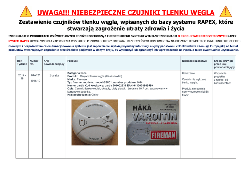 UWAGA!!! NIEBEZPIECZNE CZUJNIKI TLENKU WĘGLA Zestawienie czujników tlenku węgla, wpisanych do bazy systemu RAPEX, które stwarzają zagrożenie utraty zdrowia i życia INFORMACJE O PRODUKTACH WYŚWIETLONYCH PONIŻEJ POCHODZĄ Z EUROPEJSKIEGO SYSTEMU WYMIANY INFORMACJI O PRODUKTACH NIEBEZPIECZNYCH RAPEX. SYSTEM RAPEX UTWORZONO DLA ZAPEWNIENIA WYSOKIEGO POZIOMU OCHRONY ZDROWIA I BEZPIECZEŃSTWA KONSUMENTÓW NA OBSZARZE JEDNOLITEGO RYNKU UNII EUROPEJSKIEJ. Głównym i bezpośrednim celem funkcjonowania systemu jest zapewnienie szybkiej wymiany informacji między państwami członkowskimi i Komisją Europejską na temat produktów stwarzających zagrożenie oraz środków podjętych w danym kraju, by wykluczyć lub ograniczyć ich wprowadzanie na rynek, a także ewentualnie użytkowanie. Rok Tydzień 2012 18 Numer ref. 64A12/ 1046/12 Kraj powiadamiający Irlandia Produkt Niebezpieczeństwo Środki przyjęte przez kraj powiadamiający Kategoria: Inne Produkt: Czujnik tlenku węgla (Häkävaroitin) Marka: Fireman Typ / numer modelu: model GS801, number produkru 1464 Numer partii/ Kod kreskowy: partia 201002231 EAN 6430028869589 Opis: Czujnik tlenku węgiel, okrągły, biały plastik, średnica 10,7 cm, zapakowany w kartonowe pudełko. Kraj pochodzenia: Chiny Uduszenie Wycofanie produktu z rynku i od konsumentów Czujnik nie wykrywa tlenku węgla. Produkt nie spełnia normy europejskiej EN 50291 UWAGA!!! Produkt stwarzający niebezpieczne zagrożenie Rok Tydzień 2012 18 Numer ref. 13 0661/12 Kraj powiadamiający Zjednoczone Królestwo Produkt Niebezpieczeństwo Środki przyjęte przez kraj powiadamiający Kategoria: Inne Produkt: Czujnik tlenku węgla „Alarm tlenku węgla” Marka: Unknown Typ / numer modelu: BRJ-906LCD Opis: Czujnik tlenku węgla. Na środku obudowy znajduje się przycisk Test/Reset i dioda czerwona oznaczona napisem „Alarm” oraz dioda dzielona oznaczona napisem „Operate”. Czujnik posiada wyświetlacz LCD umieszczony powyżej przycisku. Kraj pochodzenia: Chiny Uduszenie Dobrowolne wycofanie z rynku Czułość detektora nie jest wystarczająca. Alarm nie aktywuje się przy stężeniu tlenku węgla 50 ppm. Produkt nie spełnia normy europejskiej EN 50291 Str. 2 UWAGA!!! Produkt stwarzający niebezpieczne zagrożenie Rok Tydzień 2012 18 Numer ref. 14 0662/12 Kraj powiadamiający Zjednoczone Królestwo Produkt Niebezpieczeństwo Środki przyjęte przez kraj powiadamiający Kategoria: Inne Produkt: Czujnik tlenku węgla „Alarm tlenku węgla” Marka: One Electrical Contractor+ Safety Alarms Typ / numer modelu: CP8005 Type B, date of manufacture 20/11/11 Opis: Czujnik tlenku węgla. Opakowanie typu blister z papierową etykietą i instrukcjami wewnątrz.“ Do alarmu dołączone się śruby i kołki montażowe oraz kable do podłączenia do zasilania sieciowego. Kraj pochodzenia: Chiny Uduszenie Dobrowolne wycofanie z rynku i wycofanie produktu od konsumentów Czułość detektora nie jest wystarczająca. Alarm nie aktywuje się przy stężeniu tlenku węgla 50 ppm. Produkt nie spełnia normy europejskiej EN 50291 Str. 3 UWAGA!!! Produkt stwarzający niebezpieczne zagrożenie Rok Tydzień 2012 18 Numer ref. 40 0663/12 Kraj powiadamiający Zjednoczone Królestwo Produkt Niebezpieczeństwo Środki przyjęte przez kraj powiadamiający Kategoria: Inne Produkt: Czujnik tlenku węgla „Alarm tlenku węgla” Marka: Joy Security Typ / numer modelu: JHY-CO-AR/JHY-CO-AC Opis: Czujnik tlenku węgla. Opakowanie z tworzywa sztucznego z tekturową etykietą i instrukcjami wewnątrz.“Chroni cię przed tlenkiem węgla, cichym zabójcą!” Przycisk Test/Reset do sprawdzania działania alarmu. “Uniwersalny Universal Life Church listed”, “CE” Kraj pochodzenia: Chiny Uduszenie Dobrowolne wycofanie z rynku i wycofanie produktu od konsumentów Czułość detektora nie jest wystarczająca. Alarm nie aktywuje się przy stężeniu tlenku węgla 50 ppm. Produkt nie spełnia normy europejskiej EN 50291 Str. 4 UWAGA!!! Produkt stwarzający niebezpieczne zagrożenie Rok Tydzień 2012 18 Numer ref. 40 0688/12 Kraj powiadamiający Zjednoczone Królestwo Produkt Niebezpieczeństwo Środki przyjęte przez kraj powiadamiający Kategoria: Inne Produkt: Czujnik tlenku węgla Marka: Sensor Typ / numer modelu: SF80190 Opis: alarm tlenku węgla z zasilaniem bateryjnym. Kraj pochodzenia: Chiny Uduszenie Dobrowolne wycofanie produktu od konsumentów Produkt stwarza zagrożenie uduszenia, ponieważ nieprawidłowo wykrywa tlenek węgla. Produkt nie spełnia normy europejskiej EN 50291. Str. 5 UWAGA!!! Produkt stwarzający niebezpieczne zagrożenie Rok Tydzień 2012-5 Numer ref. 4 01130/12 Kraj powiadamiający Irlandia Produkt Niebezpieczeństwo Środki przyjęte przez kraj powiadamiający Kategoria: Inne Produkt: Czujnik tlenku węgla Marka: Monitor Mister Typ / numer modelu: MM-RCC-426 (1079026) Opis: alarm tlenku węgla z zasilaniem bateryjnym. Kraj pochodzenia: Chiny Uduszenie Dobrowolne wstrzymanie sprzedaży produktu i wycofanie produktu od konsumentów Produkt stwarza zagrożenie uduszenia, ponieważ nieprawidłowo wykrywa tlenek węgla. Produkt nie spełnia normy europejskiej EN 50291. Str. 6 UWAGA!!! Produkt stwarzający niebezpieczne zagrożenie Rok Tydzień Numer ref. Kraj powiadamiający 2012-3 37 0080/12 Niemcy Produkt Niebezpieczeństwo Środki przyjęte przez kraj powiadamiający Kategoria: Inne Produkt: Alarm tlenku węgla "Gasalarm" Marka: AMS Typ / numer modelu: Dotyczy tylko produktów wprowadzonych na rynek po 05/2009. Opis: alarm tlenku węgla. Urządzenie jest w kolorze jasnoszarym, w opakowaniu typu blister z żółtą wkładką. Kraj pochodzenia: Niemcy Uduszenie Wycofanie produktu od konsumentów nakazane przez władze (organ nadzoru krajowego). Produkt stwarza zagrożenie chemiczne, ponieważ nieprawidłowo wykrywa tlenek węgla. Produkt nie spełnia wymogów dyrektywy niskonapięciowej (LVD) oraz odpowiedniej normy europejskiej EN 50291. Str. 7 UWAGA!!! Produkt stwarzaj