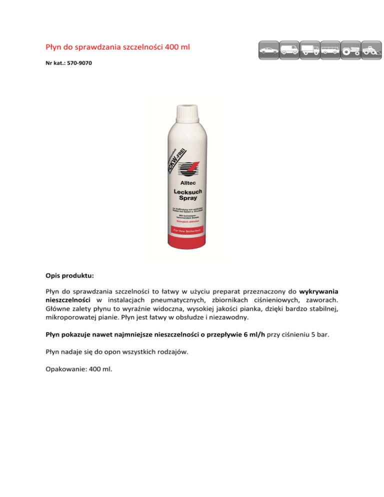 Płyn do sprawdzania szczelności 400 ml Nr kat.: 570-9070 Opis produktu: Płyn do sprawdzania szczelności to łatwy w użyciu preparat przeznaczony do wykrywania nieszczelności w instalacjach pneumatycznych, zbiornikach ciśnieniowych, zaworach. Główne zalety płynu to wyraźnie widoczna, wysokiej jakości pianka, dzięki bardzo stabilnej, mikroporowatej pianie. Płyn jest łatwy w obsłudze i niezawodny. Płyn pokazuje nawet najmniejsze nieszczelności o przepływie 6 ml/h przy ciśnieniu 5 bar. Płyn nadaje się do opon wszystkich rodzajów. Opakowanie: 400 ml.