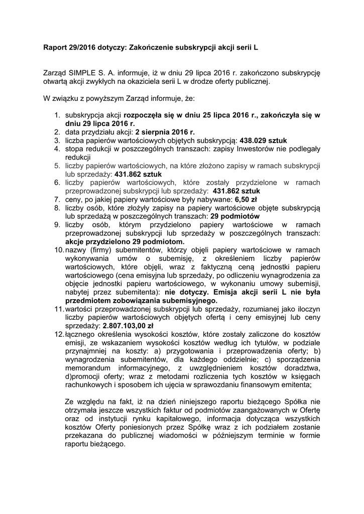 Raport 29/2016 dotyczy: Zakończenie subskrypcji akcji serii L Zarząd SIMPLE S. A. informuje, iż w dniu 29 lipca 2016 r. zakończono subskrypcję otwartą akcji zwykłych na okaziciela serii L w drodze oferty publicznej. W związku z powyższym Zarząd informuje, że: 1. subskrypcja akcji rozpoczęła się w dniu 25 lipca 2016 r., zakończyła się w dniu 29 lipca 2016 r. 2. data przydziału akcji: 2 sierpnia 2016 r. 3. liczba papierów wartościowych objętych subskrypcją: 438.029 sztuk 4. stopa redukcji w poszczególnych transzach: zapisy Inwestorów nie podlegały redukcji 5. liczby papierów wartościowych, na które złożono zapisy w ramach subskrypcji lub sprzedaży: 431.862 sztuk 6. liczby papierów wartościowych, które zostały przydzielone w ramach przeprowadzonej subskrypcji lub sprzedaży: 431.862 sztuk 7. ceny, po jakiej papiery wartościowe były nabywane: 6,50 zł 8. liczby osób, które złożyły zapisy na papiery wartościowe objęte subskrypcją lub sprzedażą w poszczególnych transzach: 29 podmiotów 9. liczby osób, którym przydzielono papiery wartościowe w ramach przeprowadzonej subskrypcji lub sprzedaży w poszczególnych transzach: akcje przydzielono 29 podmiotom. 10. nazwy (firmy) subemitentów, którzy objęli papiery wartościowe w ramach wykonywania umów o subemisję, z określeniem liczby papierów wartościowych, które objęli, wraz z faktyczną ceną jednostki papieru wartościowego (cena emisyjna lub sprzedaży, po odliczeniu wynagrodzenia za objęcie jednostki papieru wartościowego, w wykonaniu umowy subemisji, nabytej przez subemitenta): nie dotyczy. Emisja akcji serii L nie była przedmiotem zobowiązania subemisyjnego. 11. wartości przeprowadzonej subskrypcji lub sprzedaży, rozumianej jako iloczyn liczby papierów wartościowych objętych ofertą i ceny emisyjnej lub ceny sprzedaży: 2.807.103,00 zł 12. łącznego określenia wysokości kosztów, które zostały zaliczone do kosztów emisji, ze wskazaniem wysokości kosztów według ich tytułów, w podziale przynajmniej na koszty: a) przygotowania i przeprowadzenia oferty; b) wynagrodzenia subemitentów, dla każdego oddzielnie; c) sporządzenia memorandum informacyjnego, z uwzględnieniem kosztów doradztwa, d)promocji oferty; wraz z metodami rozliczenia tych kosztów w księgach rachunkowych i sposobem ich ujęcia w sprawozdaniu finansowym emitenta; Ze względu na fakt, iż na dzień niniejszego raportu bieżącego Spółka nie otrzymała jeszcze wszystkich faktur od podmiotów zaangażowanych w Ofertę oraz od instytucji rynku kapitałowego, informacja dotycząca wszystkich kosztów Oferty poniesionych przez Spółkę wraz z ich podziałem zostanie przekazana do publicznej wiadomości w późniejszym terminie w formie raportu bieżącego. 13. średniego kosztu przeprowadzenia subskrypcji lub sprzedaży przypadającego na jednostkę papieru wartościowego objętego subskrypcją lub sprzedażą: Ze względu na fakt, iż na dzień niniejszego raportu bieżącego Spółka nie otrzymała jeszcze wszystkich faktur od podmiotów zaangażowanych w Ofertę oraz od instytucji rynku kapitałowego, informacja dotycząca wszystkich kosztów Oferty poniesionych przez Spółkę wraz z ich podziałem zostanie przekazana do publicznej wiadomości w późniejszym terminie w formie raportu bieżącego. Podstawa prawna: Art. 56 ust 1 pkt 2 lit. a) ustawy z dnia 29 lipca 2005 o ofercie publicznej i warunkach wprowadzania instrumentów finansowych do zorganizowanego systemu obrotu oraz o spółkach publicznych (Dz.U. 2005 nr 184poz. 1539) i § 33 Rozporządzenia Ministra Finansów z dnia 19 lutego 2009 r. w sprawie informacji bieżących i okresowych przekazywanych przez emitentów papierów wartościowych oraz warunków uznawania za równoważne informacji wymaganych przepisami prawa państwa niebędącego państwem członkowskim (t.j. Dz.U. z 2014 r., poz. 133).