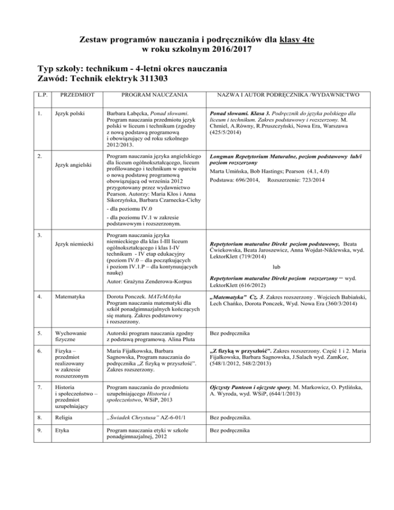 Zestaw programów nauczania i podręczników dla klasy 4te w roku szkolnym 2016/2017 Typ szkoły: technikum - 4-letni okres nauczania Zawód: Technik elektryk 311303 L.P. 1. PRZEDMIOT Język polski 2. Język angielski PROGRAM NAUCZANIA NAZWA I AUTOR PODRĘCZNIKA /WYDAWNICTWO Barbara Łabęcka, Ponad słowami. Program nauczania przedmiotu język polski w liceum i technikum (zgodny z nową podstawą programową i obowiązujący od roku szkolnego 2012/2013. Ponad słowami. Klasa 3. Podręcznik do języka polskiego dla liceum i technikum. Zakres podstawowy i rozszerzony. M. Chmiel, A.Równy, R.Pruszczyński, Nowa Era, Warszawa (425/5/2014) Program nauczania języka angielskiego dla liceum ogólnokształcącego, liceum profilowanego i technikum w oparciu o nową podstawę programową obowiązującą od września 2012 przygotowany przez wydawnictwo Pearson. Autorzy: Maria Kłos i Anna Sikorzyńska, Barbara Czarnecka-Cichy Longman Repetytorium Maturalne, poziom podstawowy lub/i poziom rozszerzony Marta Umińska, Bob Hastings; Pearson (4.1, 4.0) Podstawa: 696/2014, Rozszerzenie: 723/2014 - dla poziomu IV.0 - dla poziomu IV.1 w zakresie podstawowym i rozszerzonym. 3. Język niemiecki Program nauczania języka niemieckiego dla klas I-III liceum ogólnokształcącego i klas I-IV technikum - IV etap edukacyjny (poziom IV.0 – dla początkujących i poziom IV.1.P – dla kontynuujących naukę) Autor: Grażyna Zenderowa-Korpus Repetytorium maturalne Direkt poziom podstawowy, Beata Ćwiekowska, Beata Jaroszewicz, Anna Wojdat-Niklewska, wyd. LektorKlett (719/2014) lub Repetytorium maturalne Direkt poziom rozszerzony – wyd. LektorKlett (616/2012) 4. Matematyka Dorota Ponczek. MATeMAtyka Program nauczania matematyki dla szkół ponadgimnazjalnych kończących się maturą. Zakres podstawowy i rozszerzony. „Matematyka” Cz. 3. Zakres rozszerzony . Wojciech Babiański, Lech Chańko, Dorota Ponczek, Wyd. Nowa Era (360/3/2014) 5. Wychowanie fizyczne Autorski program nauczania zgodny z podstawą programową. Alina Pluta Bez podręcznika 6. Fizyka – przedmiot realizowany w zakresie rozszerzonym Maria Fijałkowska, Barbara Sagnowska, Program nauczania do podręcznika „Z fizyką w przyszłość”. Zakres rozszerzony. „Z fizyką w przyszłość”. Zakres rozszerzony. Część 1 i 2. Maria Fijałkowska, Barbara Sagnowska, J.Salach wyd. ZamKor, (548/1/2012, 548/2/2013) 7. Historia i społeczeństwo – przedmiot uzupełniający Program nauczania do przedmiotu uzupełniającego Historia i społeczeństwo, WSiP, 2013 Ojczysty Panteon i ojczyste spory, M. Markowicz, O. Pytlińska, A. Wyroda, wyd. WSiP, (644/1/2013) 8. Religia „Świadek Chrystusa” AZ-6-01/1 Bez podręcznika. 9. Etyka Program nauczania etyki w szkole ponadgimnazjalnej, 2012 Bez podręcznika Przedmioty zawodowe klasa 4 te L.P. PRZEDMIOT 1. Maszyny i urządzenia elektryczne 2. Instalacje elektryczne PROGRAM NAUCZANIA NAZWA I AUTOR PODRĘCZNIKA /WYDAWNICTWO Konserwacja maszyn i urządzeń elektrycznych. J.Grygiel, A.Bielawski, wyd. WSiP (23/2016) Montaż instalacji elektrycznych E.8.1, Anna Tąpolska, wyd. WSiP, (40/2015) 3. Działalność gospodarcza w branży elektrycznej 4. Język obcy w branży elektrycznej 5. Obsługa maszyn, urządzeń i instalacji elektrycznych Program nauczania dla zawodu Technik elektryk (struktura przedmiotowa) symbol zawodu 311303 – KOWEZiU w ramach: Doskonalenie podstaw programowych kluczem do modernizacji kształcenia zawodowego, typ szkoły: Technikum Eksploatacja instalacji elektrycznych E.24.2 Michał Tokarz, Łukasz Lip, wyd. WSiP (46/2015) Podejmowanie i prowadzenie działalności gospodarczej, Jacek Musiałkiewicz, wyd. Ekonomik Język angielski zawodowy, branża elektroniczna, informatyczna i elektryczna., Sebastian Chadaj, Wyd. WSiP Eksploatacja maszyn i urządzeń elektrycznych E.24.1, Łukasz Lip, Michał Tokarz, wyd. WSiP (47/2015)
