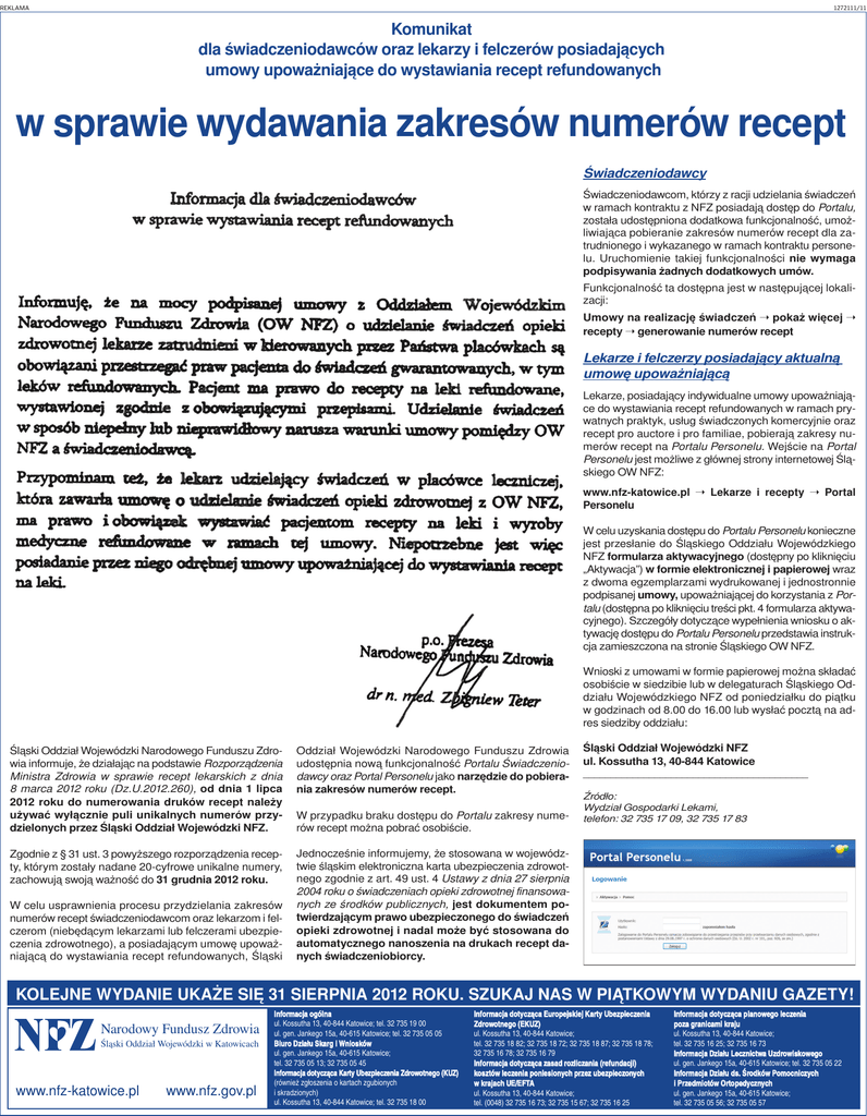 REKLAMA 1272111/11 Komunikat dla świadczeniodawców oraz lekarzy i felczerów posiadających umowy upoważniające do wystawiania recept refundowanych w sprawie wydawania zakresów numerów recept Świadczeniodawcy Świadczeniodawcom,którzyzracjiudzielaniaświadczeń wramachkontraktuzNFZposiadajądostępdoPortalu, zostałaudostępnionadodatkowafunkcjonalność,umożliwiającapobieraniezakresównumerówreceptdlazatrudnionegoiwykazanegowramachkontraktupersonelu. Uruchomienie takiej funkcjonalności nie wymaga podpisywania żadnych dodatkowych umów. Funkcjonalnośćtadostępnajestwnastępującejlokalizacji: Umowy na realizację świadczeń ➝ pokaż więcej ➝ recepty ➝ generowanie numerów recept Lekarzeifelczerzyposiadającyaktualną umowęupoważniającą Lekarze,posiadającyindywidualneumowyupoważniającedowystawianiareceptrefundowanychwramachprywatnychpraktyk,usługświadczonychkomercyjnieoraz receptproauctoreiprofamiliae,pobierajązakresynumerówreceptnaPortaluPersonelu. WejścienaPortal Personelu jestmożliwezgłównejstronyinternetowejŚląskiegoOWNFZ: www.nfz-katowice.pl ➝ Lekarze i recepty ➝ Portal Personelu WceluuzyskaniadostępudoPortaluPersonelu konieczne jestprzesłaniedoŚląskiegoOddziałuWojewódzkiego NFZformularza aktywacyjnego (dostępnypokliknięciu „Aktywacja”)w formie elektronicznej i papierowej wraz zdwomaegzemplarzamiwydrukowanejijednostronnie podpisanejumowy, upoważniającejdokorzystaniazPortalu (dostępnapokliknięciutreścipkt.4formularzaaktywacyjnego).SzczegółydotyczącewypełnieniawnioskuoaktywacjędostępudoPortaluPersonelu przedstawiainstrukcjazamieszczonanastronieŚląskiegoOWNFZ. Wnioskiz umowamiw formiepapierowejmożna składać osobiściew siedzibielubw delegaturachŚląskiegoOddziałuWojewódzkiegoNFZod poniedziałkudo piątku w godzinachod 8.00do 16.00lubwysłaćpocztąna adressiedzibyoddziału: ŚląskiOddziałWojewódzkiNarodowegoFunduszuZdrowiainformuje,żedziałającnapodstawieRozporządzenia Ministra Zdrowia w sprawie recept lekarskich z dnia 8marca2012roku(Dz.U.2012.260), od dnia 1 lipca 2012 roku do numerowania druków recept należy używać wyłącznie puli unikalnych numerów przydzielonych przez Śląski Oddział Wojewódzki NFZ. OddziałWojewódzkiNarodowegoFunduszuZdrowia udostępnianowąfunkcjonalnośćPortaluŚwiadczeniodawcyorazPortalPersonelu jakonarzędzie do pobierania zakresów numerów recept. Zgodniez§31ust.3powyższegorozporządzeniarecepty,którymzostałynadane20-cyfroweunikalnenumery, zachowująswojąważnośćdo31 grudnia 2012 roku. Jednocześnieinformujemy,żestosowanawwojewództwieśląskimelektronicznakartaubezpieczeniazdrowotnegozgodniezart.49ust.4Ustawyzdnia27sierpnia 2004rokuoświadczeniachopiekizdrowotnejfinansowanychześrodkówpublicznych, jest dokumentem potwierdzającym prawo ubezpieczonego do świadczeń opieki zdrowotnej i nadal może być stosowana do automatycznego nanoszenia na drukach recept danych świadczeniobiorcy. Wceluusprawnieniaprocesuprzydzielaniazakresów numerówreceptświadczeniodawcomorazlekarzomifelczerom(niebędącymlekarzamilubfelczeramiubezpieczeniazdrowotnego),aposiadającymumowęupoważniającądowystawianiareceptrefundowanych,Śląski WprzypadkubrakudostępudoPortalu zakresynumerówreceptmożnapobraćosobiście. Śląski Oddział Wojewódzki NFZ ul. Kossutha 13, 40-844 Katowice _________________________________________ Źródło: WydziałGospodarkiLekami, telefon:327351709,327351783 KOLEJNE WYDANIE UKAŻE SIĘ 31 SIERPNIA 2012 ROKU. SZUKAJ NAS W PIĄTKOWYM WYDANIU GAZETY! Narodowy Fundusz Zdrowia Śląski Oddział Wojewódzki w Katowicach www.nfz-katowice.pl www.nfz.gov.pl Informacjaogólna ul. Kossutha 13, 40-844 Katowice; tel. 32 735 19 00 ul. gen. Jankego 15a, 40-615 Katowice; tel. 32 735 05 05 BiuroDziałuSkargi Wniosków ul. gen. Jankego 15a, 40-615 Katowice; tel. 32 735 05 13; 32 735 05 45 Inf orm ac jadot yc ząc aKart yUbezp iec zen iaZdrow otn eg o(KUZ) (również zgłoszenia o kartach zgubionych i skradzionych) ul. Kossutha 13, 40-844 Katowice; tel. 32 735 18 00 Inf orm acjadot yczącaEuropejskiejKartyUbezpiec zenia Zdrow otn eg o(EKUZ) ul. Kossutha 13, 40-844 Katowice; tel. 32 735 18 82; 32 735 18 72; 32 735 18 87; 32 735 18 78; 32 735 16 78; 32 735 16 79 Inf orm acjadot yczącazasadrozlic zania(refundacji) kosztówlec zen iaponies ion ychprzezubezpieczonych w krajachUE/EFTA ul. Kossutha 13, 40-844 Katowice; tel. (0048) 32 735 16 73; 32 735 15 67; 32 735 16 25 Inform ac jadot yc zącap lan ow eg olec zen ia pozagran ic am ikraju ul. Kossutha 13, 40-844 Katowice; tel. 32 735 16 25; 32 735 16 73 Inform ac jaDziałuLeczn ict waUzd rowis koweg o ul. gen. Jankego 15a, 40-615 Katowice; tel. 32 735 05 22 Inform ac jaDziałuds.Środk ówPom ocn ic zych i PrzedmiotówOrto p edyczn ych ul. gen. Jankego 15a, 40-615 Katowice; tel. 32 735 05 56; 32 735 05 57