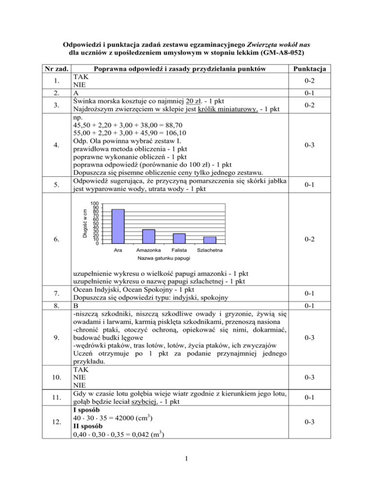 Odpowiedzi i punktacja zadań zestawu egzaminacyjnego Zwierzęta wokół nas dla uczniów z upośledzeniem umysłowym w stopniu lekkim (GM-A8-052) Nr zad. 2. 3. 4. 5. 6. TAK NIE A Świnka morska kosztuje co najmniej 20 zł. - 1 pkt Najdroższym zwierzęciem w sklepie jest królik miniaturowy. - 1 pkt np. 45,50 + 2,20 + 3,00 + 38,00 = 88,70 55,00 + 2,20 + 3,00 + 45,90 = 106,10 Odp. Ola powinna wybrać zestaw I. prawidłowa metoda obliczenia - 1 pkt poprawne wykonanie obliczeń - 1 pkt poprawna odpowiedź (porównanie do 100 zł) - 1 pkt Dopuszcza się pisemne obliczenie ceny tylko jednego zestawu. Odpowiedź sugerująca, że przyczyną pomarszczenia się skórki jabłka jest wyparowanie wody, utrata wody - 1 pkt Długość w cm 1. Poprawna odpowiedź i zasady przydzielania punktów 100 90 80 70 60 50 40 30 20 10 0 Punktacja 0-2 0-1 0-2 0-3 0-1 0-2 Ara Amazonka Falista Szlachetna Nazwa gatunku papugi 7. 8. 9. 10. 11. 12. uzupełnienie wykresu o wielkość papugi amazonki - 1 pkt uzupełnienie wykresu o nazwę papugi szlachetnej - 1 pkt Ocean Indyjski, Ocean Spokojny - 1 pkt Dopuszcza się odpowiedzi typu: indyjski, spokojny B -niszczą szkodniki, niszczą szkodliwe owady i gryzonie, żywią się owadami i larwami, karmią pisklęta szkodnikami, przenoszą nasiona -chronić ptaki, otoczyć ochroną, opiekować się nimi, dokarmiać, budować budki lęgowe -wędrówki ptaków, tras lotów, lotów, życia ptaków, ich zwyczajów Uczeń otrzymuje po 1 pkt za podanie przynajmniej jednego przykładu. TAK NIE NIE Gdy w czasie lotu gołębia wieje wiatr zgodnie z kierunkiem jego lotu, gołąb będzie leciał szybciej. - 1 pkt I sposób 40 ⋅ 30 ⋅ 35 = 42000 (cm3) II sposób 0,40 ⋅ 0,30 ⋅ 0,35 = 0,042 (m3) 1 0-1 0-1 0-3 0-3 0-1 0-3 13. 14. 15. 16. 17. 18. 19. 20. 21. 22. 23. 24. 25. III sposób 4 · 3 · 3,5 = 42 (dm3) = 42 (l) prawidłowa metoda obliczenia - 1 pkt poprawne wykonanie obliczeń - 1 pkt poprawna odpowiedź z mianem - 1pkt NIE TAK Im większa pojemność akwarium, tym moc grzałki powinna być większa. - 1 pkt D Im temperatura wody jest wyższa, tym zawartość tlenu jest mniejsza. - 1 pkt 7 ⋅ 100% = 20% 35 prawidłowa metoda obliczenia - 1 pkt poprawne wykonanie obliczeń - 1 pkt Np. Podczas pocierania włosy i szczotka elektryzują się. uwzględnienie warunków (pocieranie ciał) - 1 pkt uwzględnienie skutku (naelektryzowanie się ciał) - 1 pkt Uwaga: uznajemy także odpowiedź uwzględniającą skutek typu Ładunki dodatnie z ujemnymi przyciągają się. Janek powinien kupić psa rasy pekińczyk. - 1 pkt białko - mięso, fasola - 1 pkt węglowodany - ziemniaki, kasza - 1 pkt tłuszcz zwierzęcy - słonina, boczek - 1 pkt 18 : 3 = 6 60 : 15 = 4 Odp. Cena 1 kg karmy jest najniższa w paczce 15 kg. lub każde inne sformułowanie odpowiedzi wskazujące na bardziej korzystny zakup karmy w paczce 15 kg prawidłowa metoda obliczenia ceny 1kg w paczce 3 kg - 1 pkt prawidłowa metoda obliczenia ceny 1kg w paczce 15 kg - 1 pkt poprawne wykonanie obliczeń - 2 pkt (po jednym punkcie za każdy wynik) poprawne posługiwanie się jednostkami - 1 pkt poprawna odpowiedź - 1 pkt TAK TAK NIE ssaki - stałocieplne, ciało pokryte sierścią, żyworodne, oddychają płucami - 1 pkt ryby - zmiennocieplne, ciało pokryte łuskami, oddychają skrzelami, mają płetwy - 1 pkt C Współcześnie żyje 20000 gatunków ryb. - 1 pkt Prawie pięciokrotnie mniejsza jest liczba gatunków ssaków. - 1 pkt 2 0-2 0-1 0-1 0-1 0-2 0-2 0-1 0-3 0-6 0-3 0-2 0-1 0-2