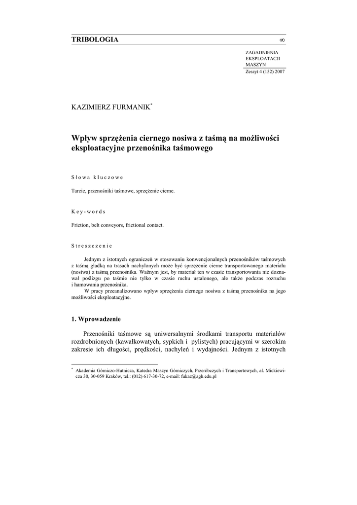 • TRIBOLOGIA ZAGADNIENIA EKSPLOATACJI MASZYN Zeszyt 4 (152) 2007 KAZIMIERZ FURMANIK* Wpływ sprzężenia ciernego nosiwa z taśmą na możliwości eksploatacyjne przenośnika taśmowego Słowa kluczowe Tarcie, przenośniki taśmowe, sprzężenie cierne. Key-words Friction, belt conveyors, frictional contact. Streszczenie Jednym z istotnych ograniczeń w stosowaniu konwencjonalnych przenośników taśmowych z taśmą gładką na trasach nachylonych może być sprzężenie cierne transportowanego materiału (nosiwa) z taśmą przenośnika. Ważnym jest, by materiał ten w czasie transportowania nie doznawał poślizgu po taśmie nie tylko w czasie ruchu ustalonego, ale także podczas rozruchu i hamowania przenośnika. W pracy przeanalizowano wpływ sprzężenia ciernego nosiwa z taśmą przenośnika na jego możliwości eksploatacyjne. 1. Wprowadzenie Przenośniki taśmowe są uniwersalnymi środkami transportu materiałów rozdrobnionych (kawałkowatych, sypkich i pylistych) pracującymi w szerokim zakresie ich długości, prędkości, nachyleń i wydajności. Jednym z istotnych * Akademia Górniczo-Hutnicza, Katedra Maszyn Górniczych, Przeróbczych i Transportowych, al. Mickiewicza 30, 30-059 Kraków, tel.: (012) 617-30-72, e-mail: [email protected] K. Furmanik 8 ograniczeń w stosowaniu konwencjonalnych przenośników taśmowych na trasach nachylonych może być sprzężenie cierne transportowanego materiału (nosiwa) z gładką taśmą przenośnika, zarówno przy transporcie „w górę”, jak i „w dół”. Istotne jest wtedy, by nosiwo w czasie transportowania nie doznawało poślizgu po taśmie nie tylko w czasie ruchu ustalonego, ale także podczas rozruchu i hamowania przenośnika. Zatem jego konstrukcja (np. układ i prędkość taśmy, jej podparcie i własności cierne) oraz sposób rozruchu i hamowania powinny zapewniać stateczny ruch nosiwa wraz z taśmą, gdyż jego zaburzenie, zwłaszcza przy większych nachyleniach i długościach tras, może spowodować zagrożenie dla bezpiecznej pracy przenośnika. Zagadnienia te są istotne dla praktyki inżynierskiej i dlatego w niniejszej pracy podjęto analizę sprzężenia ciernego transportowanego materiału z taśmą przenośnika w aspekcie oceny jego możliwości eksploatacyjnych. 2. Analiza współdziałania nosiwa z taśmą przenośnika Poprawna praca konwencjonalnego przenośnika taśmowego wymaga, między innymi, dobrego sprzężenia ciernego transportowanego materiału z taśmą, zwłaszcza na trasach nachylonych. W zależności od wielkości obciążenia przenośnika nosiwem, znaku i wartości kąta nachylenia trasy, wymagane jest doprowadzanie energii napędowej lub jej odbieranie, a przy kącie granicznym α0 (o ujemnej wartości) nachylenia trasy pobór energii jest równy zeru, gdyż wtedy składowa styczna siły ciężkości transportowanego materiału równoważy opory ruchu przenośnika. Pomijając opory dodatkowe (np. przy załadunku nosiwa) całkowity opór ruchu przenośnika wynosi [1, 2]: W = C ⋅ f ⋅ L ⋅ g ⋅ ( 2mt + mu + mk ) cos α + g ⋅ mu ⋅ L ⋅ sin α gdzie: mu = [N] (1) Q – masa jednostkowa nosiwa, kg/m 3,6 ⋅ v mt – masa jednostkowa taśmy, kg/m mk = mkg + mkd – masa jednostkowa krążników (górnych i dolnych), kg/m Q – wydajność masowa przenośnika, t/h v – prędkość taśmy, m/s C, f – współczynniki oporów ruchu, L – długość przenośnika, m g – przyspieszenie ziemskie, m/s2 α – kąt nachylenia trasy przenośnika (rys. 2a) względem poziomu, °. Z równania (1), przy W = 0 otrzymujemy wartość graniczną kąta α = α0 < 0 nachylenia trasy, przy której przenośnik już nie pobiera energii napędowej, a przy α < α0 – wymaga hamowania (rys. 1). Wartość tego kąta wynosi: Wpływ sprzężenia ciernego nosiwa z taśmą na możliwości eksploatacyjne przenośnika… α = α 0= −arctg[C ⋅ f ⋅ ( 2 9 mt mk + + 1)] mu mu (2) Dla określonych warunków eksploatacji oraz parametrów konstrukcyjno-ruchowych przenośnika z zależności (2) można wyznaczyć wartość kąta α0. W zależności od wartości współczynników tarcia wewnętrznego i zewnętrznego transportowanego materiału może on, przy odpowiednich nachyleniach trasy, zsuwać się po samym sobie lub po taśmie. energia jest odbierana energia jest pobierana α0 0 α Rys. 1. Możliwe stany pracy przenośnika taśmowego Fig. 1. Possible states of belt conveyor operation Poniżej rozważono zachowanie się nosiwa w czasie ruchu taśmy po zestawach krążnikowych przenośnika wznoszącego (α > 0). Uwzględniono przy tym odkształcenia taśmy z nosiwem w płaszczyźnie pionowej, na kierunku prostopadłym do wzdłużnej osi x przenośnika (rys. 2), pomijając jej przemieszczenia na kierunku poziomym poprzecznym (poza zestawami taśma rozchyla się). a) v lg ymax α y b) q Rys. 2. Schematy: a) przenośnika; b) odkształcenia taśmy Fig. 2. Schemes of: a) conveyor; b) belt deformations x K. Furmanik 10 Przyjmując model taśmy, traktowanej jako belka liniowo-sprężysta, obciążona poprzecznie stałym obciążeniem q (pochodzącym od masy taśmy i nosiwa), przy uwzględnieniu sztywności zginania poprzecznego przekroju taśmy oraz kąta początkowego ugięcia ϕ0 w miejscach podpór krążnikowych (rys. 2 b), kąt ugięcia górnego cięgna taśmy opisuje równanie [2]: ϕ (t ) = +[ ql g cosα ⋅[ 2S 0 sinh(ω ⋅ x − p ) 2x + (1 − )] + lg sinh( p ) 1 cosh(ω ⋅ x − p ) − ]⋅ p sinh( p ) ( ϕ0 p (3) p − 1) tgh( p ) a po jego scałkowaniu, uwzględnieniu warunków brzegowych oraz że x = v ⋅ t = x(t ) po przekształceniach ugięcie taśmy wynosi: y (t ) = ql g cosα cosh[ω ⋅ v ⋅ t − p ] − cosh( p ) (v ⋅ t ) 2 + v ⋅t − ]+ ω ⋅ sinh( p ) 2S 0 lg ϕ0 p v ⋅ t sinh[ω ⋅ v ⋅ t − p ] + sinh( p ) [ − ]⋅ p ω ⋅ sinh( p ) p ( − 1) tgh( p ) ⋅[ 2 2 przy czym: S 0 = S − ( mu + Bmtj ) ⋅ v = S − m0 ⋅ v p= lg 2 ⋅ S0 , EJ ω= S0 EJ (4) (5) (6) gdzie: x, m 