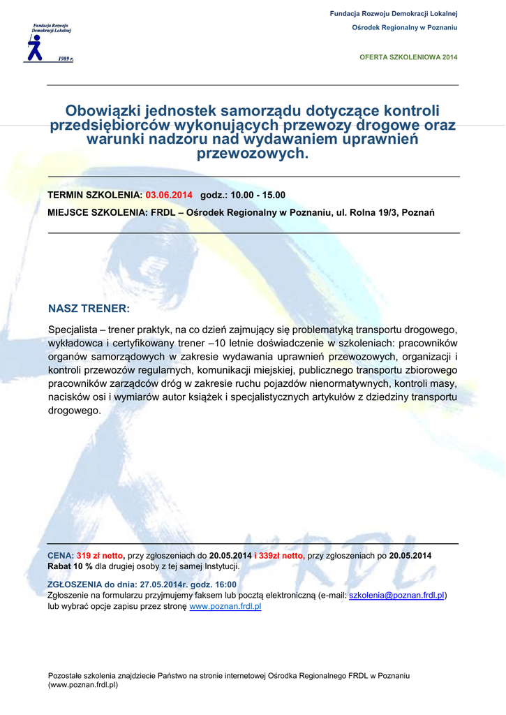 Fundacja Rozwoju Demokracji Lokalnej Ośrodek Regionalny w Poznaniu OFERTA SZKOLENIOWA 2014 Obowiązki jednostek samorządu dotyczące kontroli przedsiębiorców wykonujących przewozy drogowe oraz warunki nadzoru nad wydawaniem uprawnień przewozowych. TERMIN SZKOLENIA: 03.06.2014 godz.: 10.00 - 15.00 MIEJSCE SZKOLENIA: FRDL – Ośrodek Regionalny w Poznaniu, ul. Rolna 19/3, Poznań NASZ TRENER: Specjalista – trener praktyk, na co dzień zajmujący się problematyką transportu drogowego, wykładowca i certyfikowany trener –10 letnie doświadczenie w szkoleniach: pracowników organów samorządowych w zakresie wydawania uprawnień przewozowych, organizacji i kontroli przewozów regularnych, komunikacji miejskiej, publicznego transportu zbiorowego pracowników zarządców dróg w zakresie ruchu pojazdów nienormatywnych, kontroli masy, nacisków osi i wymiarów autor książek i specjalistycznych artykułów z dziedziny transportu drogowego. CENA: 319 zł netto, przy zgłoszeniach do 20.05.2014 i 339zł netto, przy zgłoszeniach po 20.05.2014 Rabat 10 % dla drugiej osoby z tej samej Instytucji. ZGŁOSZENIA do dnia: 27.05.2014r. godz. 16:00 Zgłoszenie na formularzu przyjmujemy faksem lub pocztą elektroniczną (e-mail: [email protected]) lub wybrać opcje zapisu przez stronę www.poznan.frdl.pl Pozostałe szkolenia znajdziecie Państwo na stronie internetowej Ośrodka Regionalnego FRDL w Poznaniu (www.poznan.frdl.pl) Fundacja Rozwoju Demokracji Lokalnej Ośrodek Regionalny w Poznaniu OFERTA SZKOLENIOWA 2014 Obowiązki jednostek samorządu dotyczące kontroli przedsiębiorców wykonujących przewozy drogowe oraz warunki nadzoru nad wydawaniem uprawnień przewozowych. PROGRAM SZKOLENIA 1. Zakres kontroli prowadzonych przez jednostki samorządu terytorialnego w stosunku do przedsiębiorców wykonujących przewozy drogowe. a) Kontrola spełniania wymogów będących podstawą wydania zezwolenia na zawód przewoźnika drogowego licencji i zezwoleń na przewozy regularne, b) Zakres informacji związanych z działalnością transportową, których organ może żądać od przewoźnika, c) Kontrola w lokalu danego przedsiębiorstwa w zakresie oceny dobrej reputacji przedsiębiorcy lub osoby zarządzającej transportem d) Kontrola drogowa dokumentów wymaganych w przewozach regularnych i regularnych specjalnych oraz warunków określonych w tych dokumentach e) Kontrola pobierania opłaty za przewóz osób f) Kontrola publicznego transportu zbiorowego 2. Warunki wykonywania czynności kontrolnych w zakresie przewozów drogowych przez organy samorządowe. a) Kompetencje odpowiednich organów samorządowych do wykonywania poszczególnych rodzajów kontroli, b) Warunki wykonywania kontroli wynikające z ustawy o transporcie drogowym, c) Warunki wykonywania kontroli wynikające z ustawy o swobodzie działalności gospodarczej, d) System oceny ryzyka dla podmiotów wykonujących przewozy drogowe, e) Kryteria doboru firm do kontroli f) Ocena spełnienia wymagań dotyczących dobrej reputacji, kompetencji zawodowych, sytuacji finansowej oraz rzeczywistej i stałej siedziby 3. Działania organów samorządowych podejmowane po kontroli uzależnione od stwierdzonych nieprawidłowości. a) Działania mające podstawę w przepisach rozporządzenia 1071/2009 Proporcjonalność reakcji organu do stwierdzonych nieprawidłowości, Procedura zawieszania i cofania zezwolenia na wykonywanie zawodu przewoźnika drogowego), b) Działania mające podstawę w przepisach ustawy o transporcie drogowym Cofniecie i wygaszenie licencji Cofnięcie i wygaszenie zezwolenia na przewozy regularne Stwierdzenie niezdolności zarządzającego transportem do kierowania operacjami transportowymi Okoliczności powodujące umorzenie postępowania administracyjnego Kary nakładane przez organy samorządowe w drodze decyzji administracyjnej 4. Nadzór nad wydawaniem uprawnień przewozowych. a) Rodzaje kontroli organów samorządowych prowadzone przez WITD b) Dokumenty wykorzystywane w trakcie kontroli c) Procedury kontroli i obowiązki organu kontrolowanego. 5. Dyskusja i odpowiedzi na pytania. Pozostałe szkolenia znajdziecie Państwo na stronie internetowej Ośrodka Regionalnego FRDL w Poznaniu (www.poznan.frdl.pl) Fundacja Rozwoju Demokracji Lokalnej Ośrodek Regionalny w Poznaniu OFERTA SZKOLENIOWA 2014 Formularz zgłoszeniowy na szkolenie Obowiązki jednostek samorządu dotyczące kontroli przedsiębiorców wykonujących przewozy drogowe oraz warunki nadzoru nad wydawaniem uprawnień przewozowych. (03.06.2014) Nazwa Instytucji (dane do faktury) Adres NIP Telefon uczestnika Email uczestnika Imię i nazwisko uczestnika Stanowisko Wydział 1. 2. 3. Wyrażamy zgodę na przetwarzanie danych w celu sprawnej organizacji szkolenia Pieczęć Podpis CENA: 319 zł netto, przy zgłoszeniach do 20.05.2014 i 339zł netto, przy zgłoszeniach po 20.05.2014 Rabat 10 % dla drugiej osoby z tej samej Instytucji. Zwolnienie z VAT w przypadku finansowania ze środków publicznych. UWAGA! Oświadczam, że udział w szkoleniu jest dla uczestnika/ów kształceniem zawodowym finansowanym w całości lub co najmniej 70% ze środków publicznych (proszę wybrać) TAK / NIE Zgłoszenia prosimy przesyłać do 27 maja 2014 r.(do godz.1600) fax: 61 855 33 07, email:[email protected] lub wybrać opcje zapisu przez stronę www.poznan.frdl.pl Rezygnacja ze szkolenia może nastąpić najpóźniej 2 dni przed szkoleniem. Niewykorzystanie zgłoszonego uczestnictwa będzie równoznaczne z obciążeniem Państwa należnością za szkolenie. Opiekun szkolenia: Magda Twardowska 506-191-594 Pozostałe szkolenia znajdziecie Państwo na stronie internetowej Ośrodka Regionalnego FRDL w Poznaniu (www.poznan.frdl.pl)