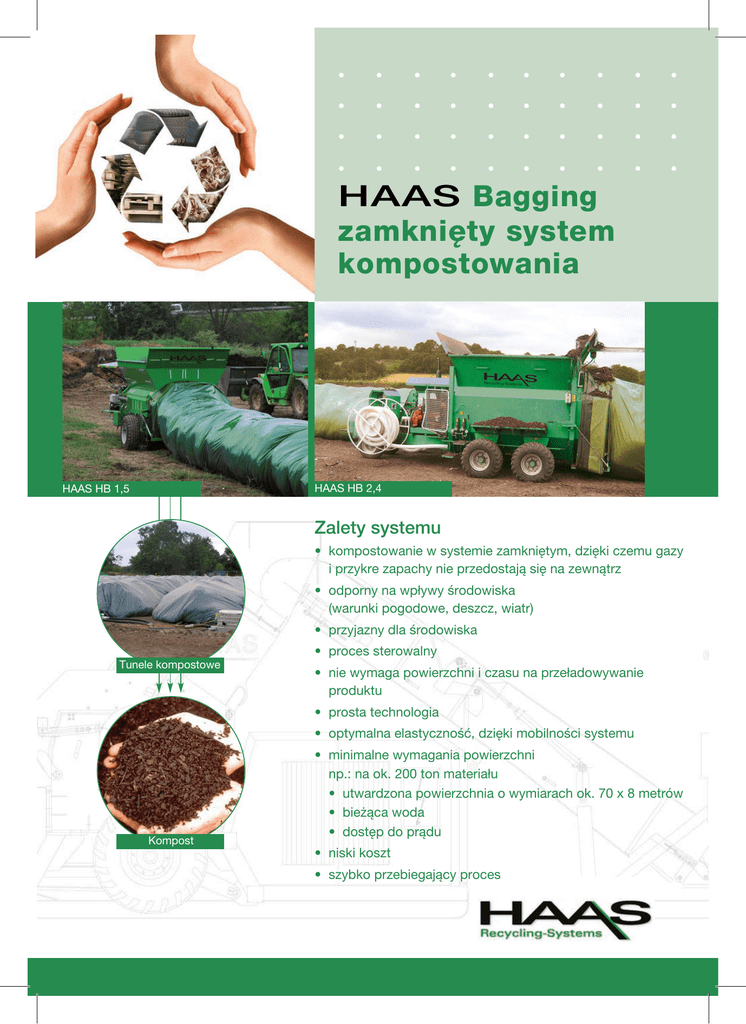 HAAS Bagging zamknięty system kompostowania HAAS HB 2,4 HAAS HB 1,5 Zalety systemu • kompostowanie w systemie zamkniętym, dzięki czemu gazy i przykre zapachy nie przedostają się na zewnątrz • odporny na wpływy środowiska (warunki pogodowe, deszcz, wiatr) • przyjazny dla środowiska Tunele kompostowe • proces sterowalny • nie wymaga powierzchni i czasu na przeładowywanie produktu • prosta technologia • optymalna elastyczność, dzięki mobilności systemu Kompost • minimalne wymagania powierzchni np.: na ok. 200 ton materiału • utwardzona powierzchnia o wymiarach ok. 70 x 8 metrów • bieżąca woda • dostęp do prądu • niski koszt • szybko przebiegający proces HAAS HB 1,5 Maszyna HB 1,5 jest odpowiednia dla mniejszych kompostowni, np. w gminach zajmujących się kompostowaniem. Specyfikacja maszyny Długość/szerokość/wysokość: 5.425/2.180/2.170 mm Ciężar: ok. 2.450 kg Silnik: Yanmar, 14,5 kW, Diesel Pojemność robocza: ok. 2,7 m³ Średnica rękawa: 1,5 m lub 2,0 m HAAS HB 2,4 Maszyna do kompostowania z szeregu HB 2,4 nadaje się dla większych kompostowni. HAAS HB 1,5 Oba systemy posiadają: • 3-stopniowy cylinder teleskopowy o podwójnym działaniu • cykl pracy trwający 120 sekund • pilot zdalnego sterowania • tunel o długości ok. 60 m i są samobieżne w cyklu pracy Specyfikacja maszyny Długość/szerokość/wysokość: 7.370/3.100/3.300 mm Ciężar: ok. 7.200 kg Silnik: Perkins, 40 kW, Diesel Pojemność robocza: ok. 7,5 m³ Średnica rękawa: 2,4 m lub 3,0 m HAAS HB 2,4 Co to jest HAAS Bagging? Potrzebne wyposażenie: HAAS Bagging to zamknięty system kompostowania, w którym przetwarzane odpady zostają zmieszane w rękawie z tworzywa sztucznego. W procesie kompostowania powstaje węgiel (C) i azot (N), które nie przedostają się na zewnątrz tunelu i tym samym nie powodują przykrych zapachów. Dzięki regulacji temperatury i doprowadzaniu tlenu możliwy jest wpływ na rozwój mikroorganizmów rozkładających i kompostujących odpady. Dzięki tej technologii uda się Państwu uzyskać znakomity wynik kompostowania, oszczędzając do 65 % powierzchni i zapobiegając powstawaniu przykrych zapachów. • rękaw pasujący do prasy • perforowane plastikowe rury napowietrzające • jednostka wentylacyjna • urządzenia do pomiaru temperatury • zawory odpowietrzające • jednostki regulacyjne – dla pełnoautomatycznego procesu napowietrzania HAAS Holzzerkleinerungs- und Fördertechnik GmbH Unter den Weiden 6 • 56472 Dreisbach/GERMANY Phone: +49(0)26 61/98 65-0 • Telefax: +49(0)26 61/98 65-20 E-Mail: [email protected] • Website: www.haas-recycling.de