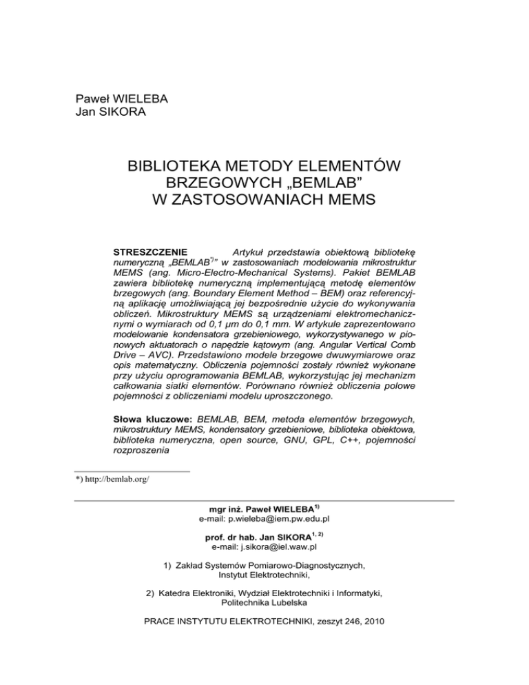 Paweł WIELEBA Jan SIKORA BIBLIOTEKA METODY ELEMENTÓW BRZEGOWYCH „BEMLAB” W ZASTOSOWANIACH MEMS STRESZCZENIE Artykuł przedstawia obiektową bibliotekę numeryczną „BEMLAB*)” w zastosowaniach modelowania mikrostruktur MEMS (ang. Micro-Electro-Mechanical Systems). Pakiet BEMLAB zawiera bibliotekę numeryczną implementującą metodę elementów brzegowych (ang. Boundary Element Method – BEM) oraz referencyjną aplikację umożliwiającą jej bezpośrednie użycie do wykonywania obliczeń. Mikrostruktury MEMS są urządzeniami elektromechanicznymi o wymiarach od 0,1 μm do 0,1 mm. W artykule zaprezentowano modelowanie kondensatora grzebieniowego, wykorzystywanego w pionowych aktuatorach o napędzie kątowym (ang. Angular Vertical Comb Drive – AVC). Przedstawiono modele brzegowe dwuwymiarowe oraz opis matematyczny. Obliczenia pojemności zostały również wykonane przy użyciu oprogramowania BEMLAB, wykorzystując jej mechanizm całkowania siatki elementów. Porównano również obliczenia polowe pojemności z obliczeniami modelu uproszczonego. Słowa kluczowe: BEMLAB, BEM, metoda elementów brzegowych, mikrostruktury MEMS, kondensatory grzebieniowe, biblioteka obiektowa, biblioteka numeryczna, open source, GNU, GPL, C++, pojemności rozproszenia *) http://bemlab.org/ mgr inż. Paweł WIELEBA1) e-mail: [email protected] prof. dr hab. Jan SIKORA1, 2) e-mail: [email protected] 1) Zakład Systemów Pomiarowo-Diagnostycznych, Instytut Elektrotechniki, 2) Katedra Elektroniki, Wydział Elektrotechniki i Informatyki, Politechnika Lubelska PRACE INSTYTUTU ELEKTROTECHNIKI, zeszyt 246, 2010 196 P. Wieleba, J. Sikora 1. WSTĘP Tytułowa biblioteka BEMLAB [1, 2] jest projektem całościowo implementującym Metodę Elementów Brzegowych (ang. Boundary Element Method – BEM) [3, 4, 5]. BEM jest metodą numeryczną rozwiązywania problemów fizycznych opisanych za pomocą równań różniczkowych cząstkowych (ang. Partial Differential Equations – PDE). W artykule szczególną uwagę zwrócono na modelowanie elektrostatyczne. Zatem podczas rozwiązania polowego wykorzystano równanie Laplace'a do obliczeń potencjału ϕ : ∇ 2ϕ ( x ) = 0 (1) BEMLAB jest projektem o otwartym kodzie źródłowym opartym na licencji GNU LGPL (Lesser General Public License) [7]. Pakiet BEMLAB dostarcza uniwersalną bibliotekę do obliczeń numerycznych BEM oraz referencyjną aplikację komputerową będącą najprostszym sposobem ich przeprowadzenia. Dodatkowo dostarczane są pomocnicze programy umożliwiające przeprowadzanie zadań inżynierskich związanych z modelowaniem, a zwłaszcza tworzeniem siatek geometrycznych. BEMLAB jest tworzony obiektowo przy użyciu zunifikowanego języka modelowania (ang. Unified Modeling Language – UML). Natomiast w większości został zaimplementowany w języku C++, a podstawowym kompilatorem jest GNU Compiler. Pakiet BEMLAB wykorzystuje narzędzia autoconf, automake, autotools [10], do zarządzania kodem, procesem konfiguracji i budowania. Poniżej zostanie przedstawiony przykład wykorzystania BEMLAB do modelowania struktur grzebieniowych wykorzystywanych w urządzeniach MEMS. 2. MIKRO-URZĄDZENIA MEMS Mikro-systemy elektromechaniczne (MEMS) [17, 16] są bardzo małymi urządzeniami, których rozmiary zawierają się w przedziale od 0,1 μm do 0,1 mm. Dla porównania wymiary nano-urządzeń (NEMS) to przedział od 0,1 nm do 0,1 μm. MEMS charakteryzują się tym, że zamieniają energię z elektrycznej na mechaniczną lub odwrotnie, w zależności od zastosowań. Prawdopodobnie najlepiej znanymi urządzeniami MEMS są głowice drukarek atramentowych, czy akcelerometry w poduszkach powietrznych. W artykule tym zwrócono uwagę na napędy używane m. in. w napędach mikro-lusterek. Biblioteka Metody Elementów Brzegowych „BEMLAB” w zastosowaniach MEMS 197 Do zalet urządzeń MEMS, w porównaniu z technologiami wcześniej używanymi należy zaliczyć m.in.: • znacznie mniejszy koszt produkcji pojedynczego urządzenia w produkcji seryjnej; • znacznie zmniejszenie rozmiarów i wagi urządzeń przez co zwiększone możliwości zastosowań; • mniejsze zużycie energii. Natomiast do wad urządzeń MEMS można zaliczyć: • bardzo duże koszty jakie należy ponieść na wyposażenie fabryki w linie produkcyjną, aby możliwa była w niej produkcja urządzeń MEMS; • w przypadku uszkodzenia urządzenia jest ono praktycznie nienaprawialne. Przykładowe urządzenie MEMS została przedstawione na rysunku 1. Jest to schemat układu z mikro-lusterkiem skanującym (ang. scanning mirror). Rys. 1. Schemat mikro-urządzenia lusterka skanującego z czterema grupami kondensatorów grzebieniowych. Urządzenie składa się z czterech grup kondensatorów grzebieniowych. Elektrody zaznaczone ciemniejszym kolorem są nieruchome, natomiast elektrody jaśniejsze wraz z lusterkiem są przymocowane do ruchomej belki skrętnej. Po przyłożeniu napięcia do elektrod kondensatora, elektrody przemieszczają się powodując wychylenie lusterka. Napęd jest realizowany przy pomocy pionowych kondensatorów grzebieniowych. Wyróżnia się dwa typy pionowych aktuatorów grzebieniowych: 198 P. Wieleba, J. Sikora • aktuatory grzebieniowe o napędzie kątowym (ang. Angular Vertical Comb drives – AVC); • aktuatory grzebieniowe o napędzie schodkowym (ang. Staggered Vertical Comb drives – SVC). Na rysunku 2 przedstawiono budowę i schemat działania pionowego aktuatora grzebieniowego AVC. Rys. 2. Schemat działania i wymiary pionowego aktuatora grzebieniowego o napędzie kątowym (AVC) Aktuatory AVC charakteryzują się tym, że w położeniu spoczynkowym, czyli bez przyłożonego napięcia, elektrody pokrywają się największą możliwą powierzchnią, natomiast po przyłożeniu napięcia powierzchnia pokrywania elektrod jest mniejsza. W procesie optymalizacji struktury kondensatorów grzebieniowych należy przeprowadzić modelowanie mechaniczne i elektryczne. W kolejnych rozdziałach